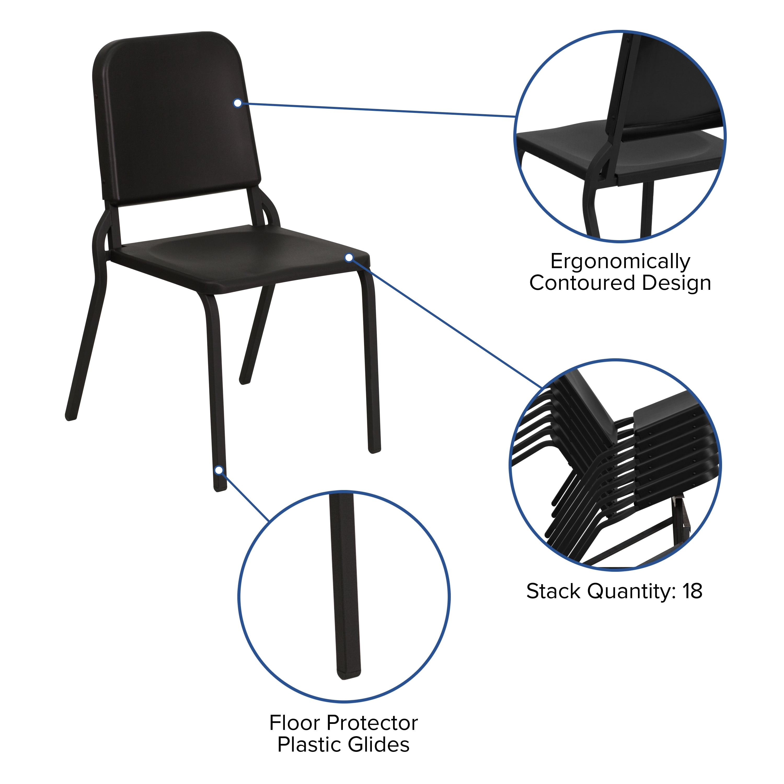High Density Band/Music Chair Stack Quantity: 18 Black Plastic Back and Seat, Easy to Clean Ergonomically Contoured Design Textured Seat ensures safe seating 97 degree Seat-to-Back Angle allows maximum breathing capability Black Powder Coated Frame Finish, Floor Protector Plastic Glides Recommended for 7th Grade to College Students Made In Taiwan TAA Compliant