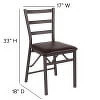 Flash Furniture HERCULES Series Brown Folding Ladder Back Metal Chair with Brown Vinyl Seat Metal Dining Chair 225 lb. Weight Capacity Ladder Back Design Brown Vinyl Upholstered Seat 1″ Thick Foam Padded Seat CA117 Fire Retardant Foam 18 Gauge Steel Frame Brown Powder Coated Frame Finish Floor Protector Plastic Glides Designed for Commercial or Residential Use Folded Size: 17″W x 3″D x 33″H PRODUCT MEASUREMENTS: Overall Size: 17″ x 18″D x 33″H; Seat Size: 16″ x 16″D x 17.5″H; Back Size: 13″W x 15″H; Folded Size: 17″W x 3″D x 33″H