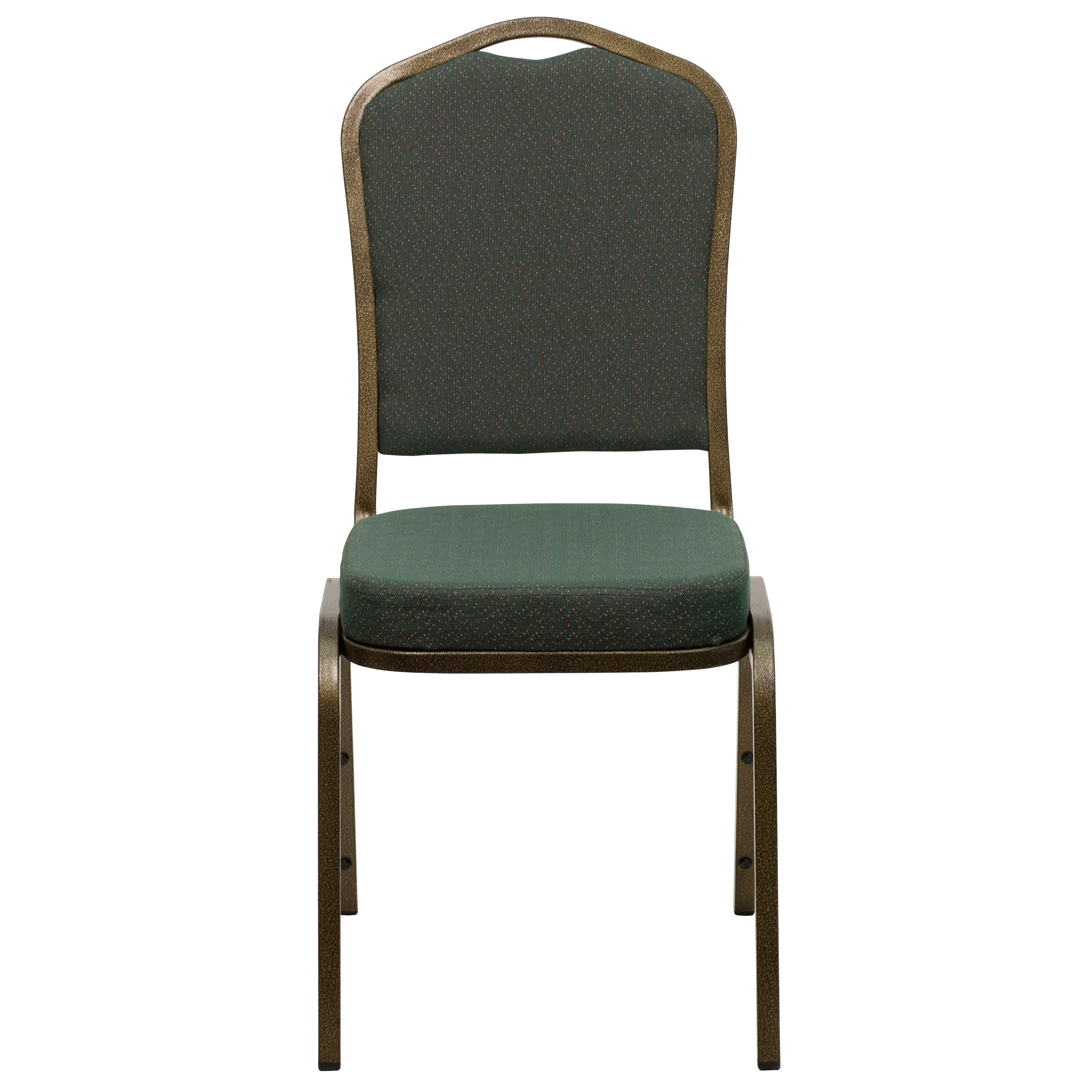 Multipurpose Crown Back Banquet Chair for All Occasions 500 lb. Weight Capacity Stack Quantity: 15 Green Patterned Fabric Upholstery with Seamless Back Panel 2.5″ Thick Seat Cushion with CAL 117 Fire Retardant Foam 16 Gauge Steel Frame with bumper guards to protect finish while stacked Floor Protector Plastic Glides Limited Lifetime Warranty on Frame Designed for Commercial Use; Suitable for Home Use Fully assembled stack chair for rental furniture, occasional seating or home use