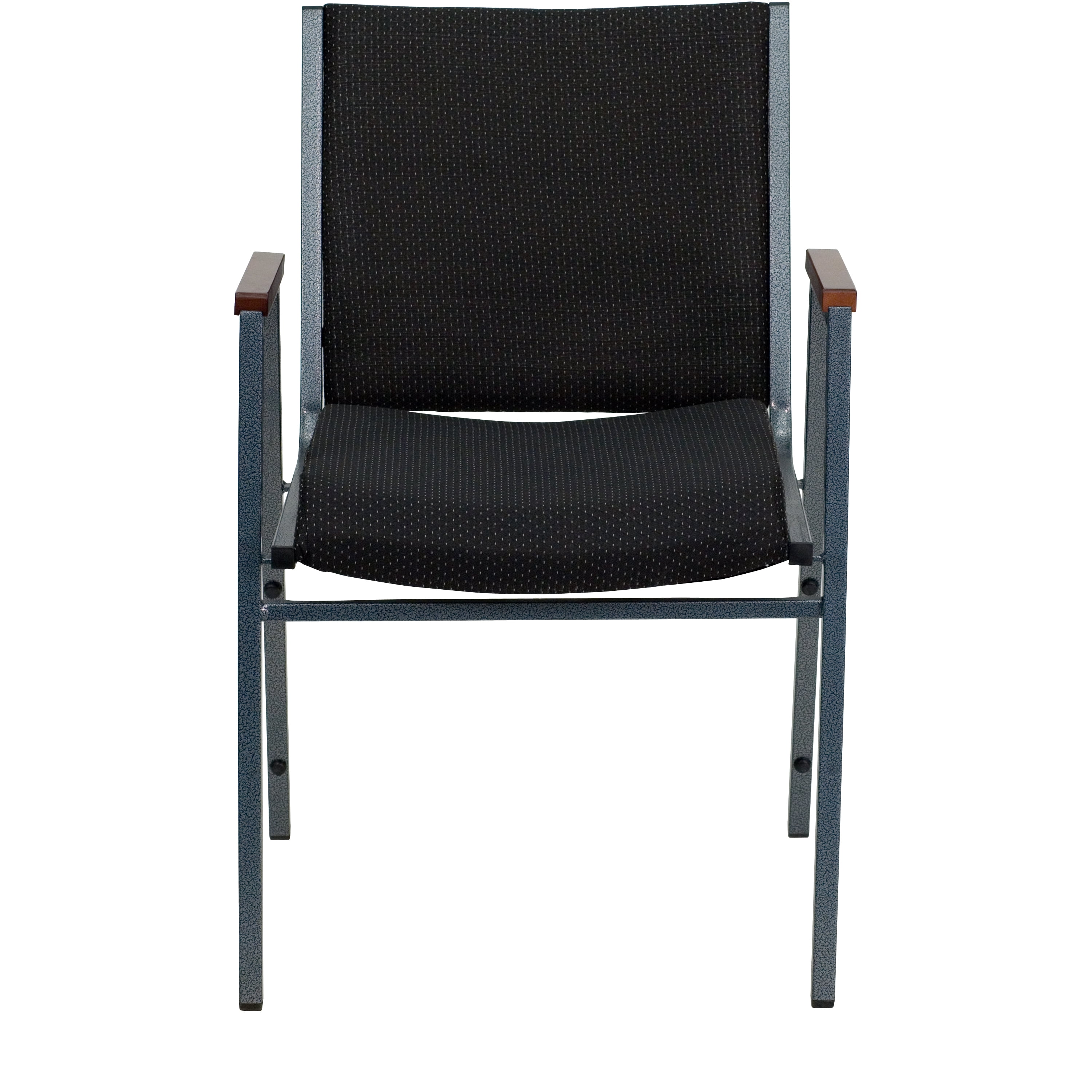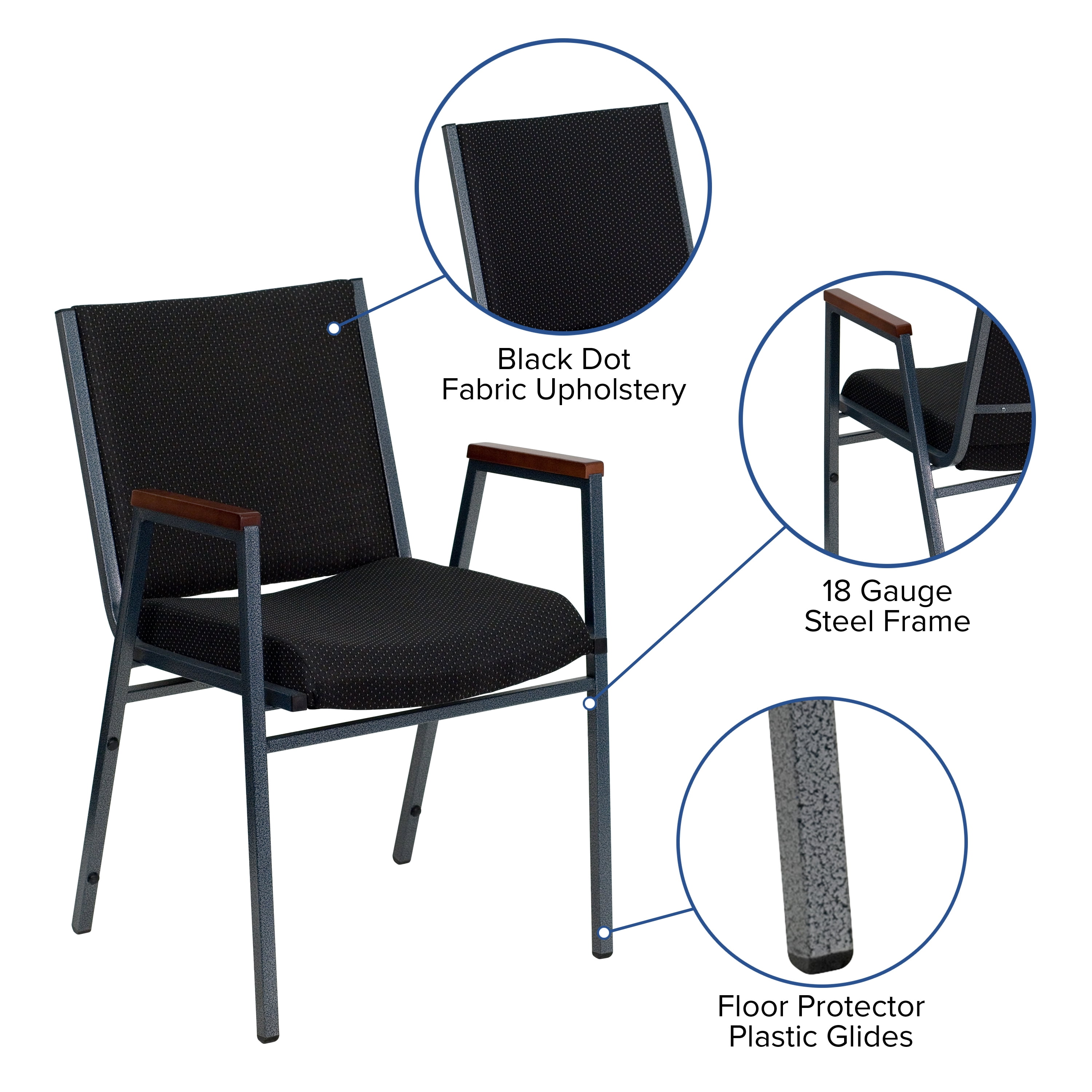 Flash Furniture HERCULES Series Heavy Duty Black Dot Fabric Stack Chair with Arms Multipurpose Stacking Arm Guest Chair for Business or Home Use 550 lb. Weight Capacity Stack Quantity: 12 Comfortable Contoured Cushions backed by .625″ Thick Plywood Seat 18 Gauge Steel Silver Vein Powder Coated Frame Finish Stretcher Bars provide additional support Ganging Bracket attaches chairs together Plastic Bumper Guards protect finish when stacked Floor Protector Plastic Glides Versatile Seating: reception chair, conference chair, office side chair PRODUCT MEASUREMENTS: Overall Size: 21″W x 21″D x 31″H; Seat Size: 16.5″W x 18″D x 18″H; Back Size: 18″W x 15″H; Arm Size: 24.75″H from floor; 7″H from seat; No Assembly Required