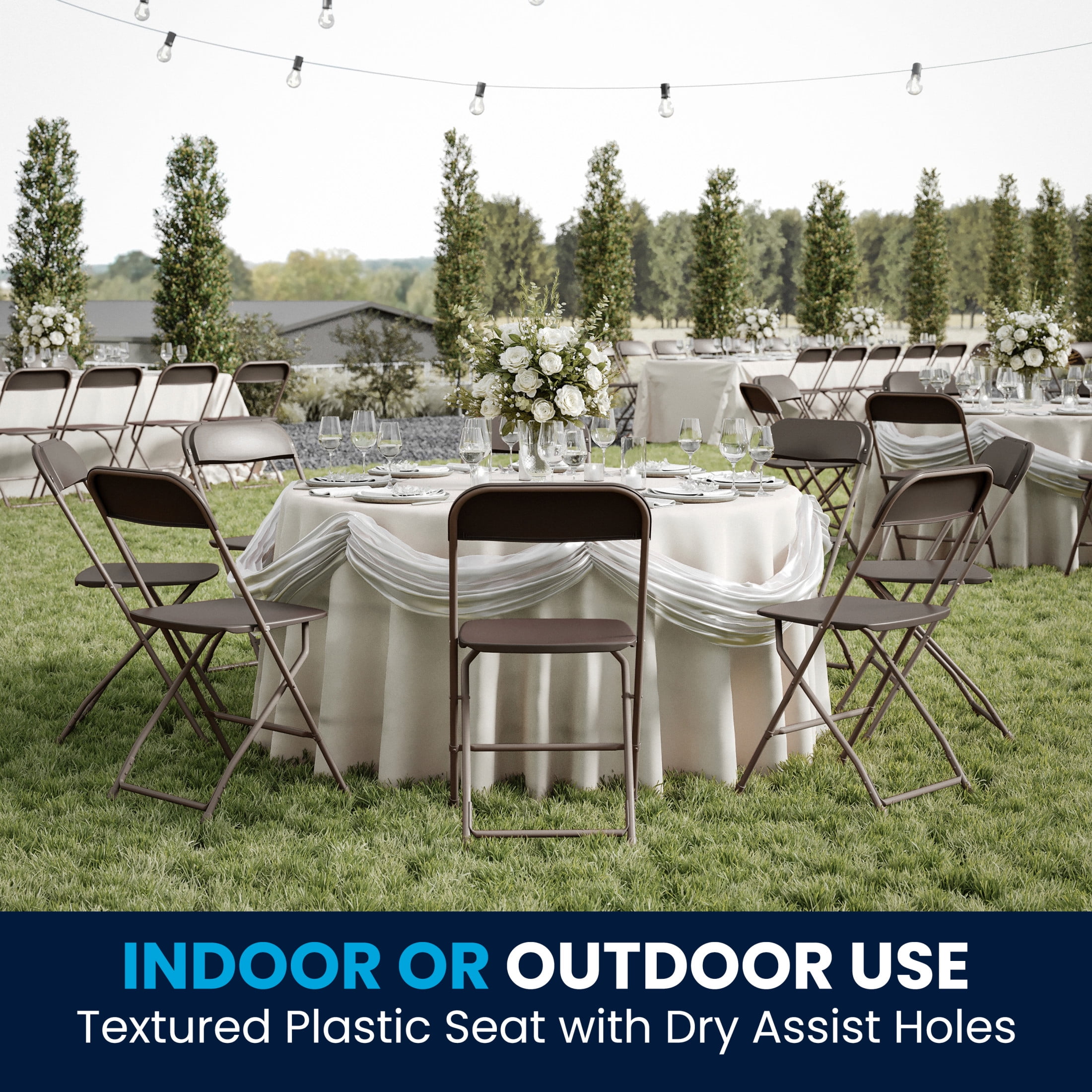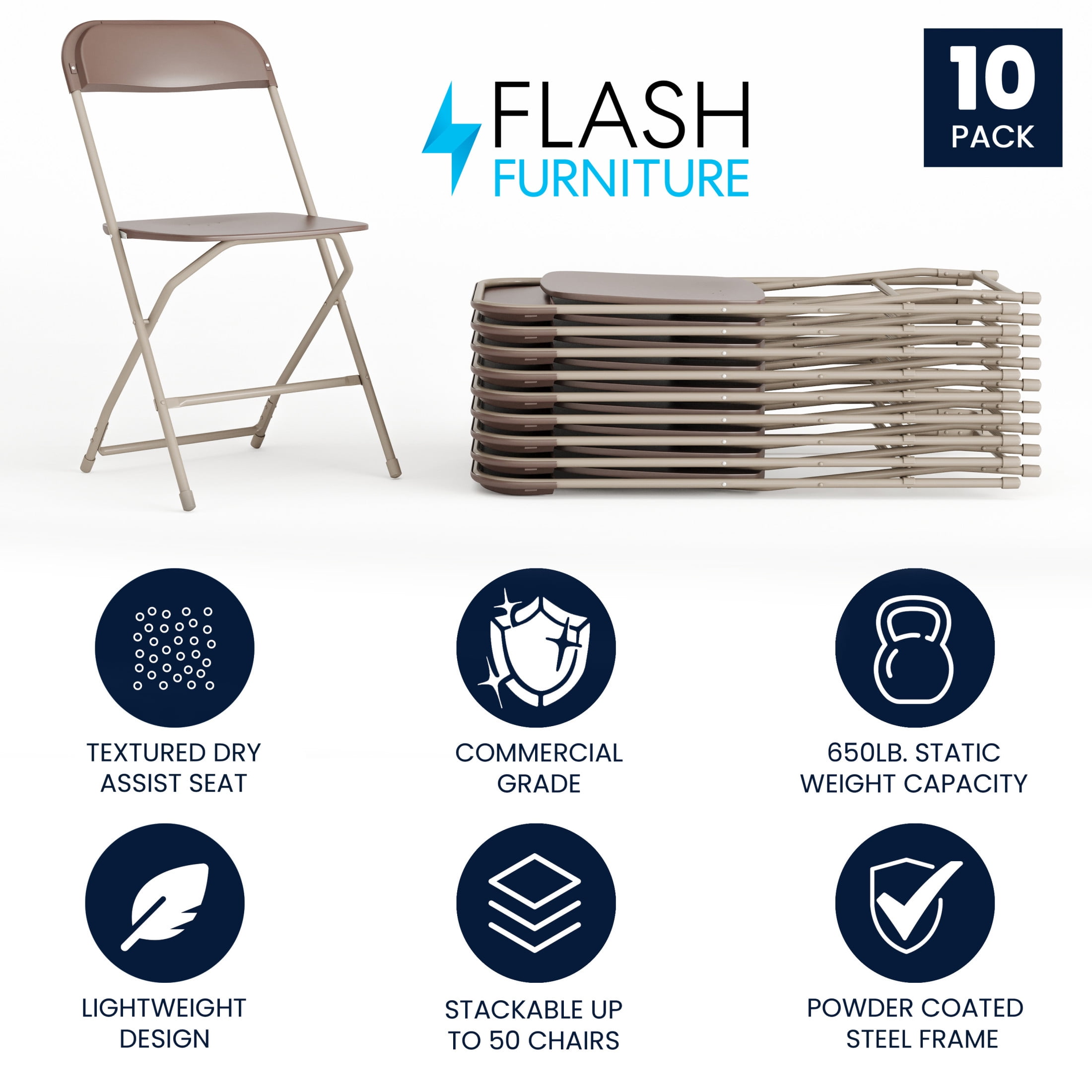 Flash Furniture Hercules Series Plastic Folding Event Chairs for Adults, Set of 10, Brown Great for game nights, catering events, business meetings, and other indoor/outdoor events Textured and contoured plastic seats with dry-assist drainage holes Durable double-support braces and 18-gauge steel frames Lightweight, foldable design and floor glides for easy portability Easy-to-store chairs nest horizontally to stack up to 50 high Supports up to 650 lbs. of static weight No assembly required; clean with a damp cloth as needed Overall size: 17.5″ W x 18″ D x 31.5″ H Folded size: 17.5″ W x 2.5″ D x 38.25″ H PRODUCT MEASUREMENTS : Overall Size: 17.5″W x 18″D x 31.5″H; Folded Size: 17.5″W x 2.5″D x 38.25″H; Seat Size: 15.5″W x 15.5″D x 17.75″H; Back Size: 17.5″W x 15.5″H; No Assembly Required