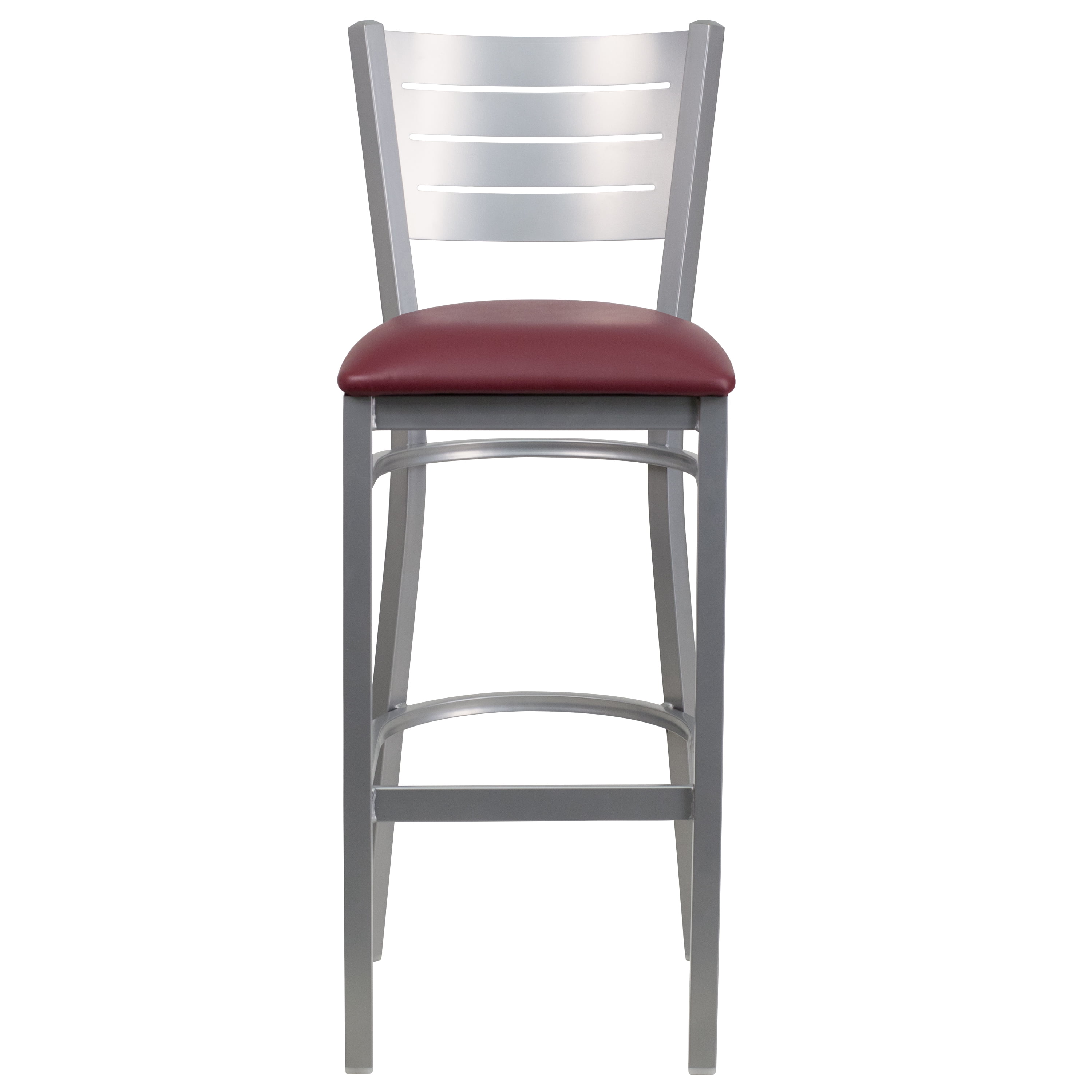 This metal barstool has a slat back design, burgundy vinyl upholstered seat and an 18 gauge steel frame. The welded joint assembly and two curved support bars give the stool great strength and stability. The lower support bar doubles as footrest. Plastic floor glides protect your floors by sliding smoothly when you need to move the stool.