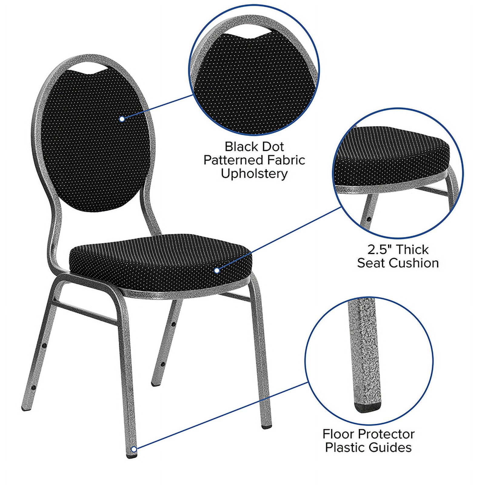 Multipurpose All Occasion Banquet Chair 500 lb. Weight Capacity Stack Quantity: 15 Teardrop Back Design Black Patterned Fabric Upholstered Back and Seat with Seamless Back Panel 2.5″ Thick Seat Cushion with CAL 117 Fire Retardant Foam 16 Gauge Steel Frame, Silver Vein Powder Coated Frame Finish, Double Support Braces Plastic Bumper Guards protect finish when stacked, Floor Protector Plastic Glides Designed for Commercial Use; Suitable for Home Use Limited Lifetime Warranty on Frame, Ships Fully Assembled