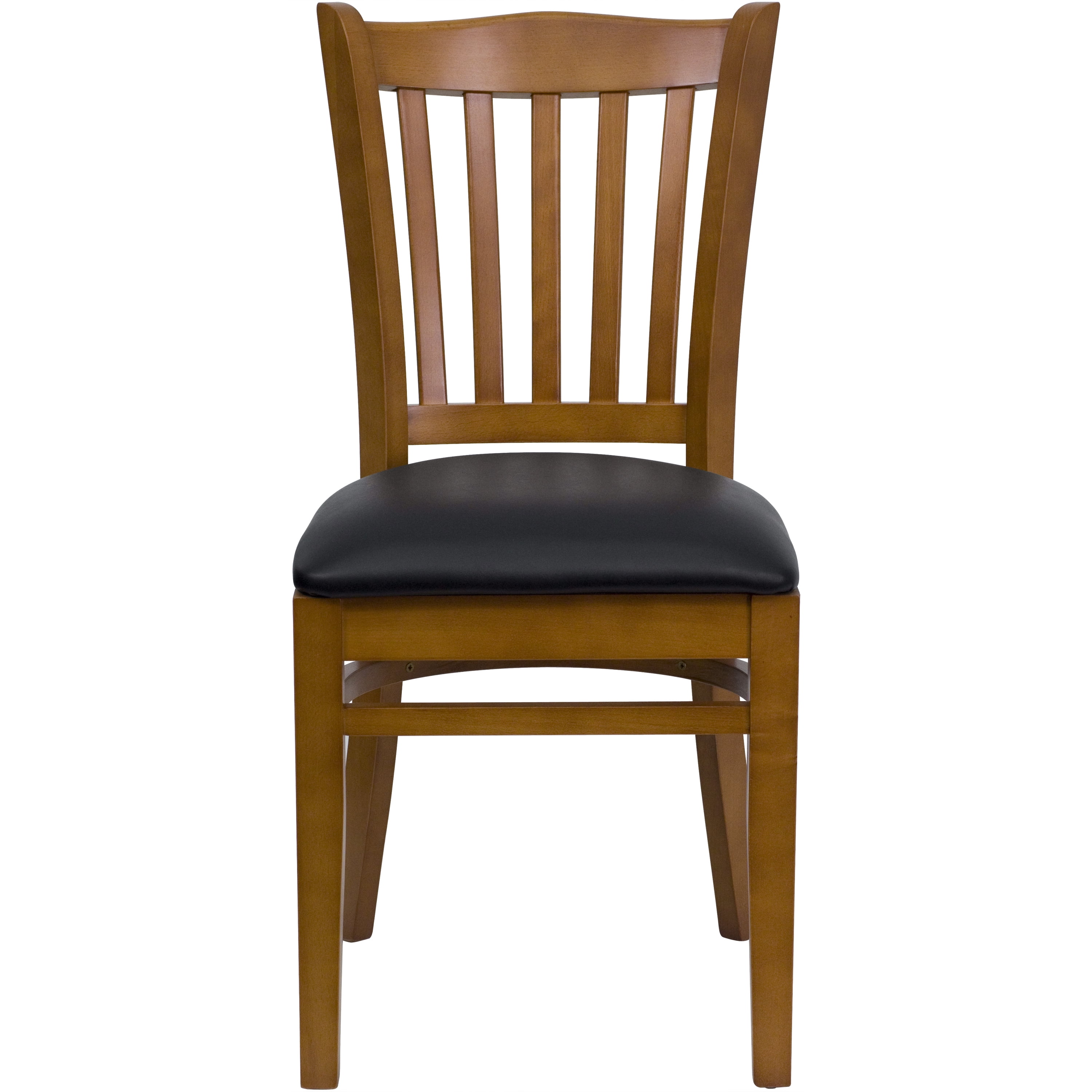 Wood Dining Chair 800 lb. Weight Capacity Vertical Slat Back Design Black Vinyl Upholstered Seat 2.5″ Thick Padded Seat with CAL 117 Fire Retardant Foam Solid European Hardwood Construction, Two Curved Support Bars Mortise and Tenon Style Construction with metal wood screw reinforcements Walnut Wood Finished Frame Floor Protector Plastic Glides Designed for Commercial Use; Suitable for Home Use