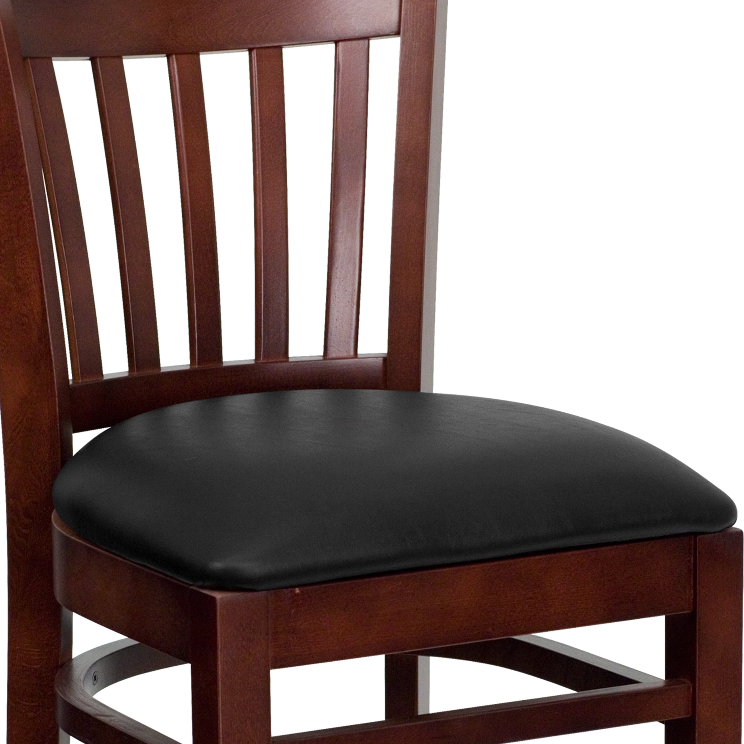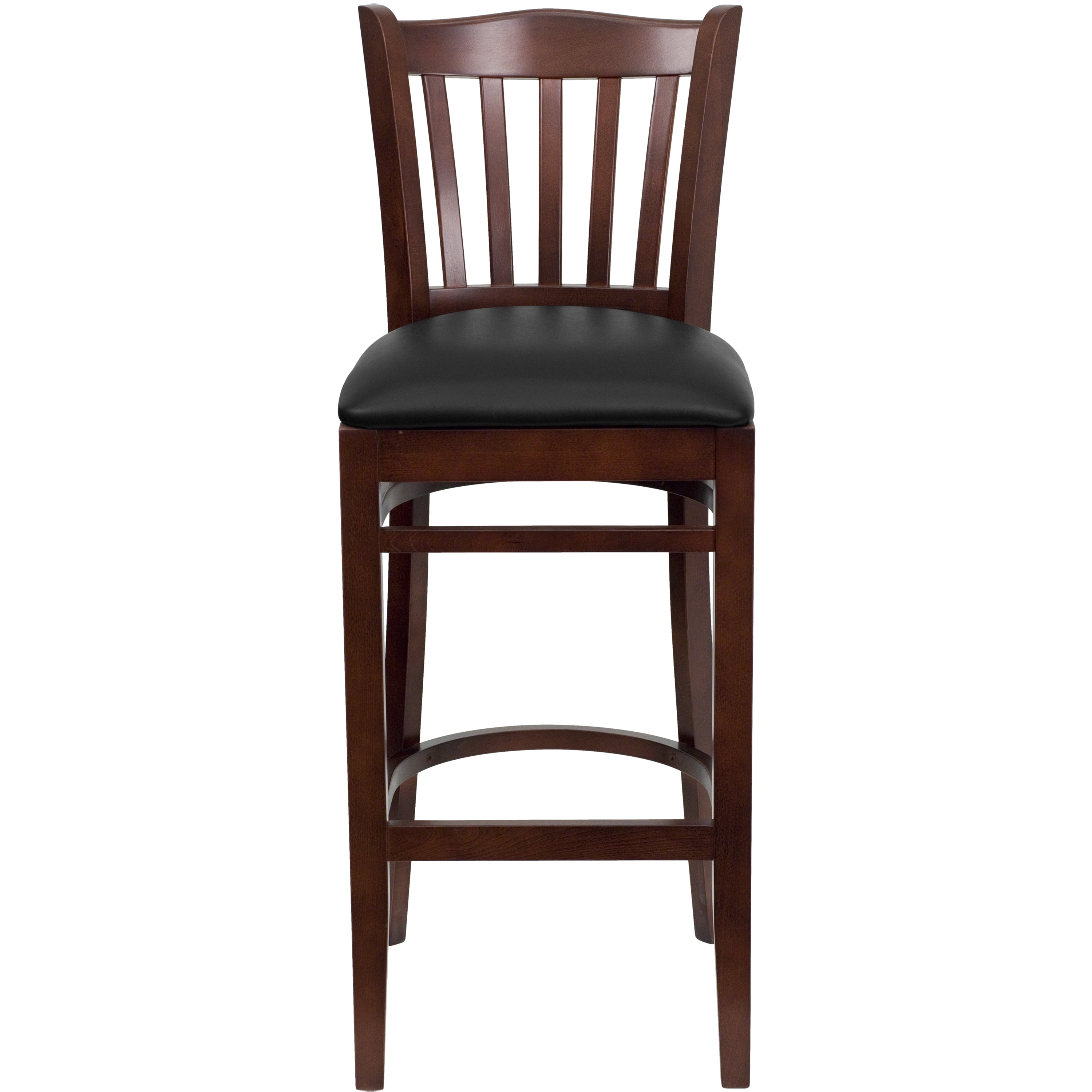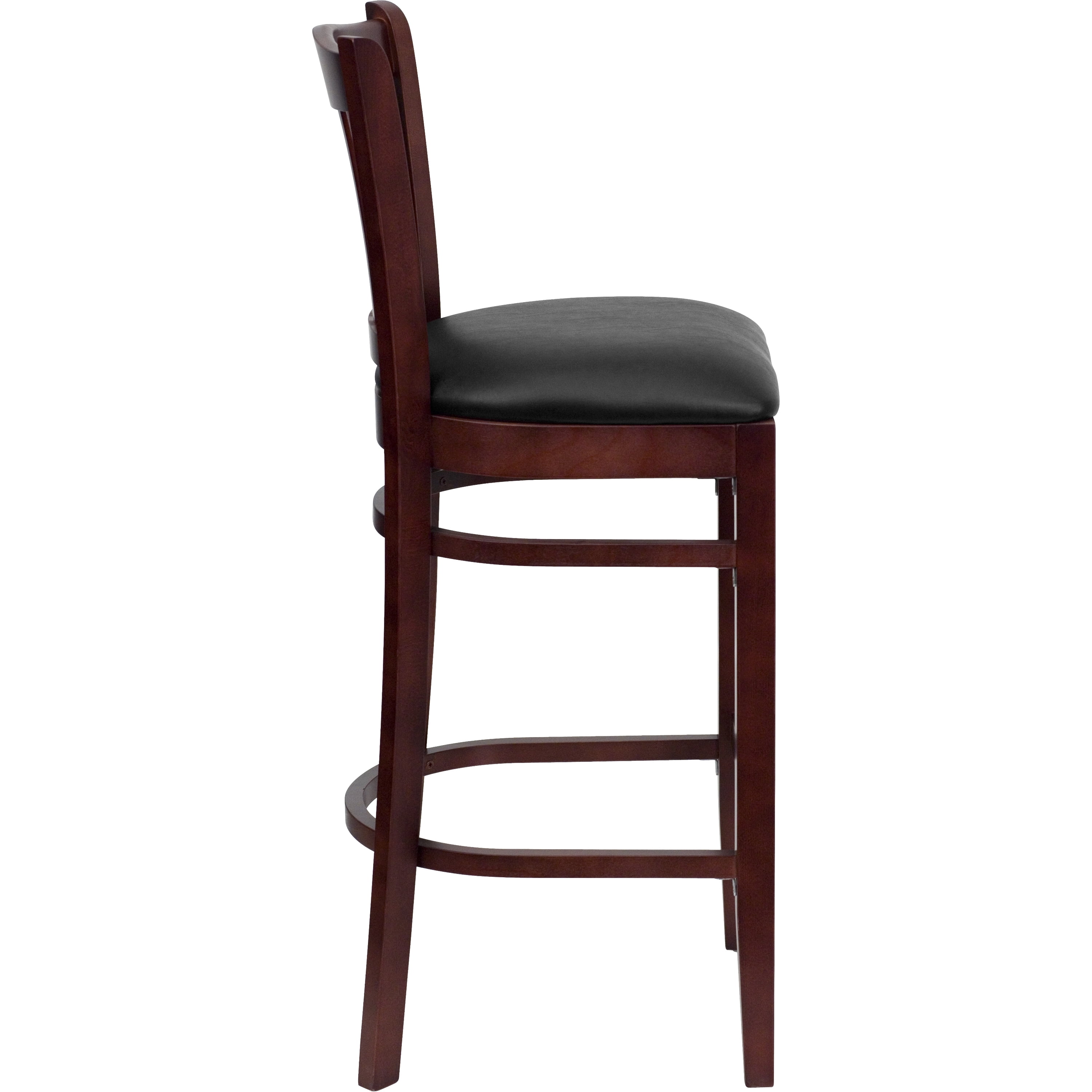 Create a first-rate dining experience by offering your patrons great food, service and attractive furnishings. This classic mahogany wood bar stool will offer guests a warm, inviting look when entering your establishment. This chair will make an attractive addition to your restaurant, pool hall, lounge, bar or other high traffic venue. This stool is easy to clean, which is an important aspect when it comes to a business. This bar stool was designed to withstand the daily rigors in the hospitality industry, but will also provide a cozy, intimate quality to your home. The vertical slat back design and thickly padded, black vinyl upholstered seat will keep your guests comfortable. The durable frame is stabilized with mortise and tenon construction with metal wood screw reinforcements. Two curved support bars provide extra stability and include a footrest for improved posture. The floor glides help protect your floors and ensure smooth gliding. This charmingly styled chair is a must have, whether used in the home or your commercial business.