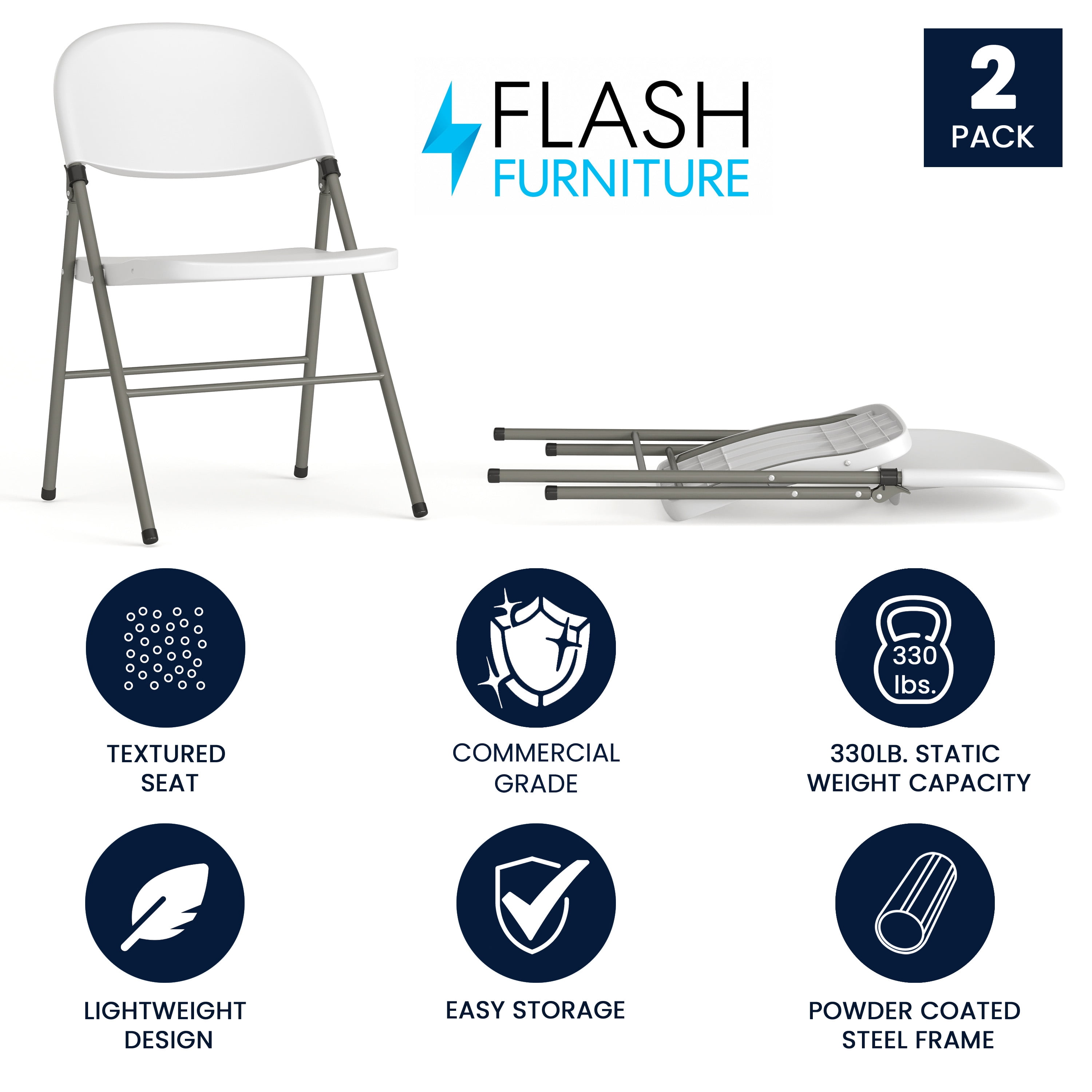 Flash Furniture HERCULES Series White Plastic Folding Chairs | Set of 2 Lightweight Folding Chairs with Gray Frame Set of 2 white plastic folding chairs with gray frame 330 lb. Weight Capacity Lightweight design for easy transport and storage Textured seat reduces slipping Steel Frame Supports on Sides of Seat Gray Powder Coated Frame Finish Floor Protector Caps Designed for Commercial Use Folded Size: 19″W x 4.5″D x 41″H PRODUCT MEASUREMENTS: Overall Size: 19″W x 22″D x 32.75″H; Folded Size: 19″W x 4.5″D x 41″H; Seat Size: 16.5″W x 17″D x 17″H; Back Size: 19.25″W x 17.5″H; No Assembly Required