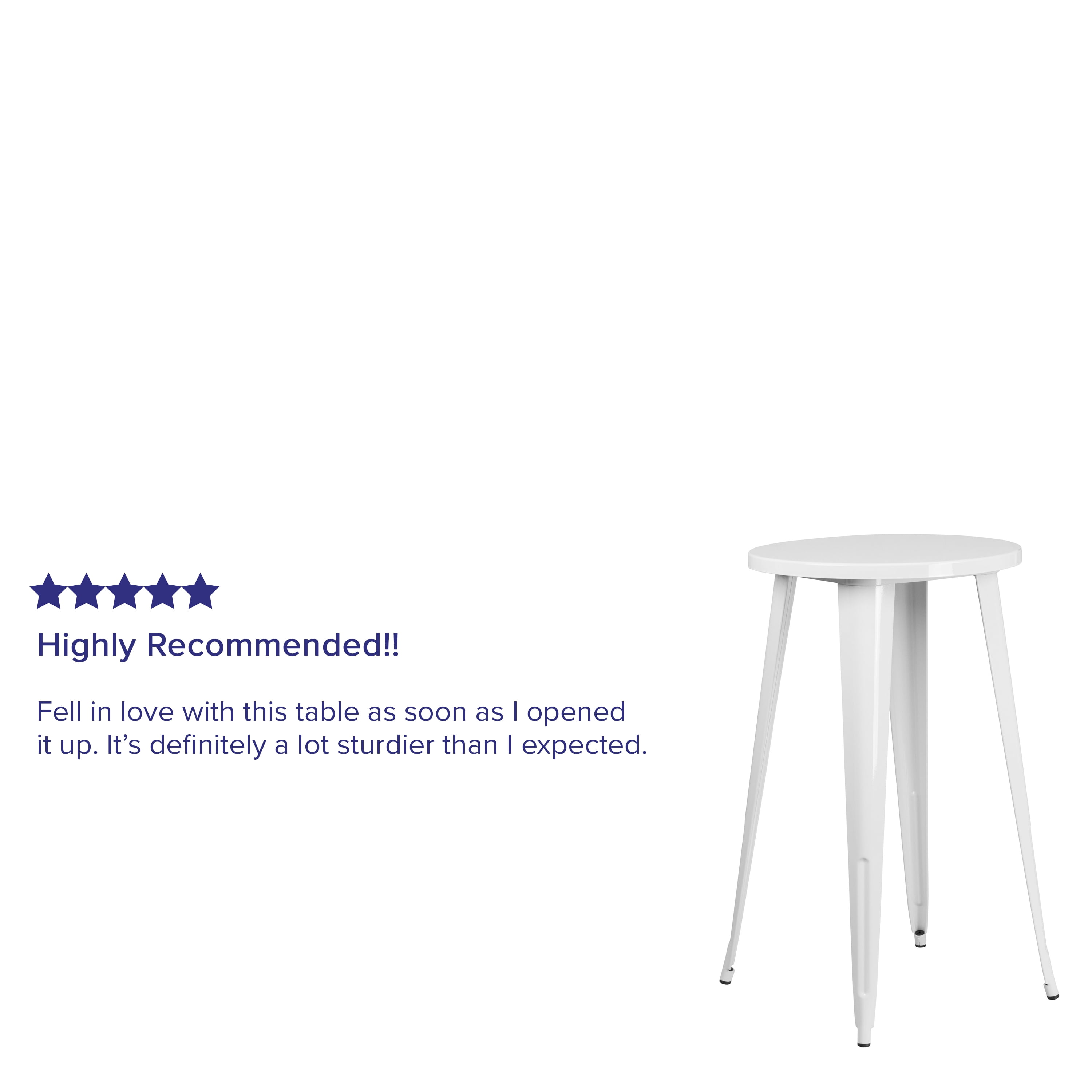 Flash Furniture James Commercial Grade 24″ Round White Metal Indoor-Outdoor Bar Height Table Metal Cafe Bar Table Top Size: 24″ Round Base Size: 21.25″W Smooth Top with 1.25″ Thick Edge White Powder Coat Finish Brace underneath top provides extra stability Protective Rubber Floor Glides Designed for Indoor and Outdoor Use Designed for Commercial and Residential Use PRODUCT MEASUREMENTS: Overall Size: 24″W x 24″D x 41″H
