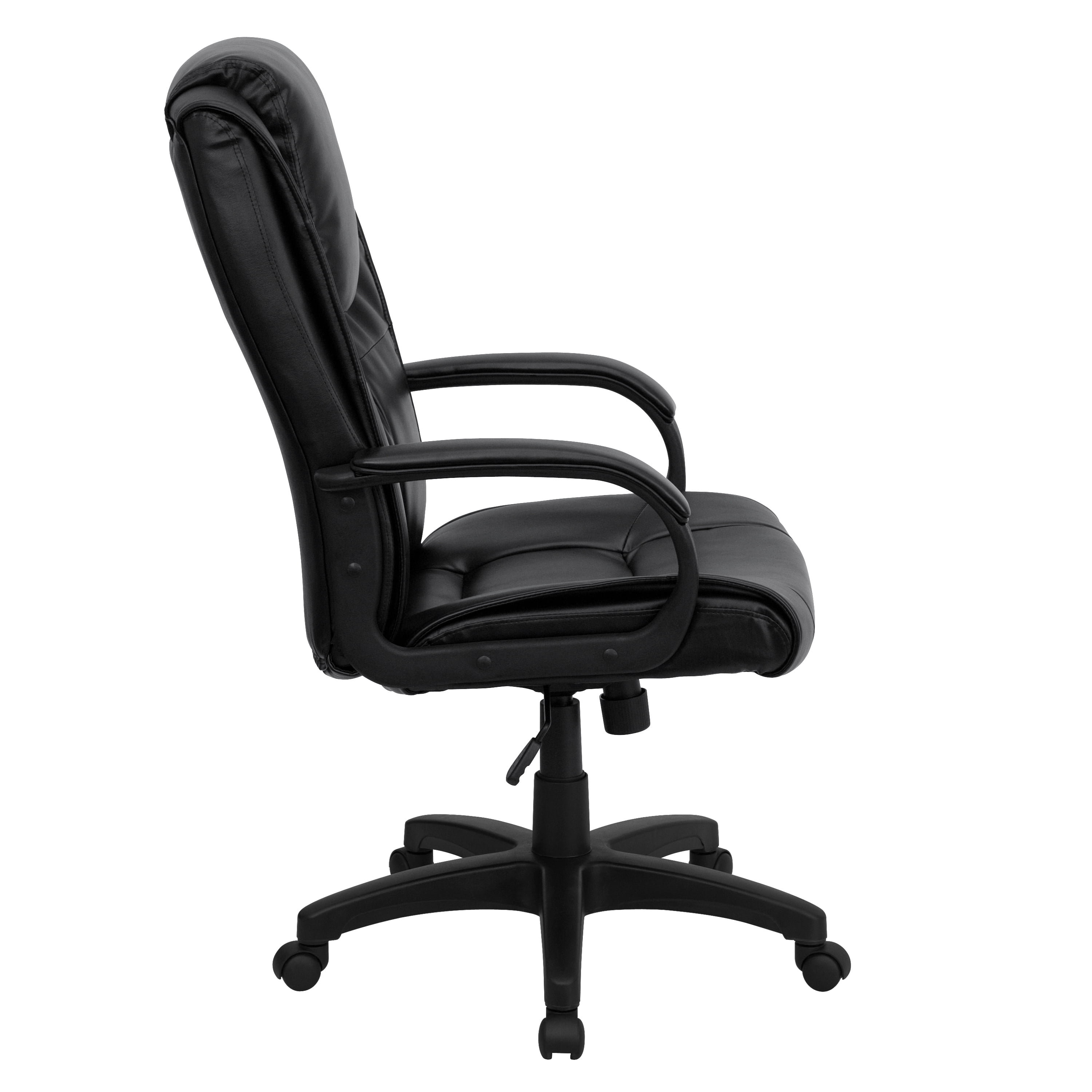 Flash Furniture Jessica High Back Black LeatherSoft Executive Swivel Office Chair with Oversized Headrest and Arms Contemporary Office Chair Black LeatherSoft Upholstery High Back Design with Oversized Headrest Built-In Lumbar Support Contoured Back and Seat Tilt Lock Mechanism rocks/tilts the chair and locks in an upright position Tilt Tension Adjustment Knob adjusts the chair’s backward tilt resistance CA117 Fire Retardant Foam Swivel Seat Pneumatic Seat Height Adjustment Padded Arms Heavy Duty Nylon Base Dual Wheel Casters LeatherSoft is leather and polyurethane for added Softness and Durability PRODUCT MEASUREMENTS: Overall Size: 26.25″W x 31.5″D x 44-48″H; Seat Size: 21.25″W x 21.75″D x 18.5-22.5″H; Back Size: 21.5″W x 27.5″H; Arm Size: 26.75-30.75″H from floor; 7.25″H from seat