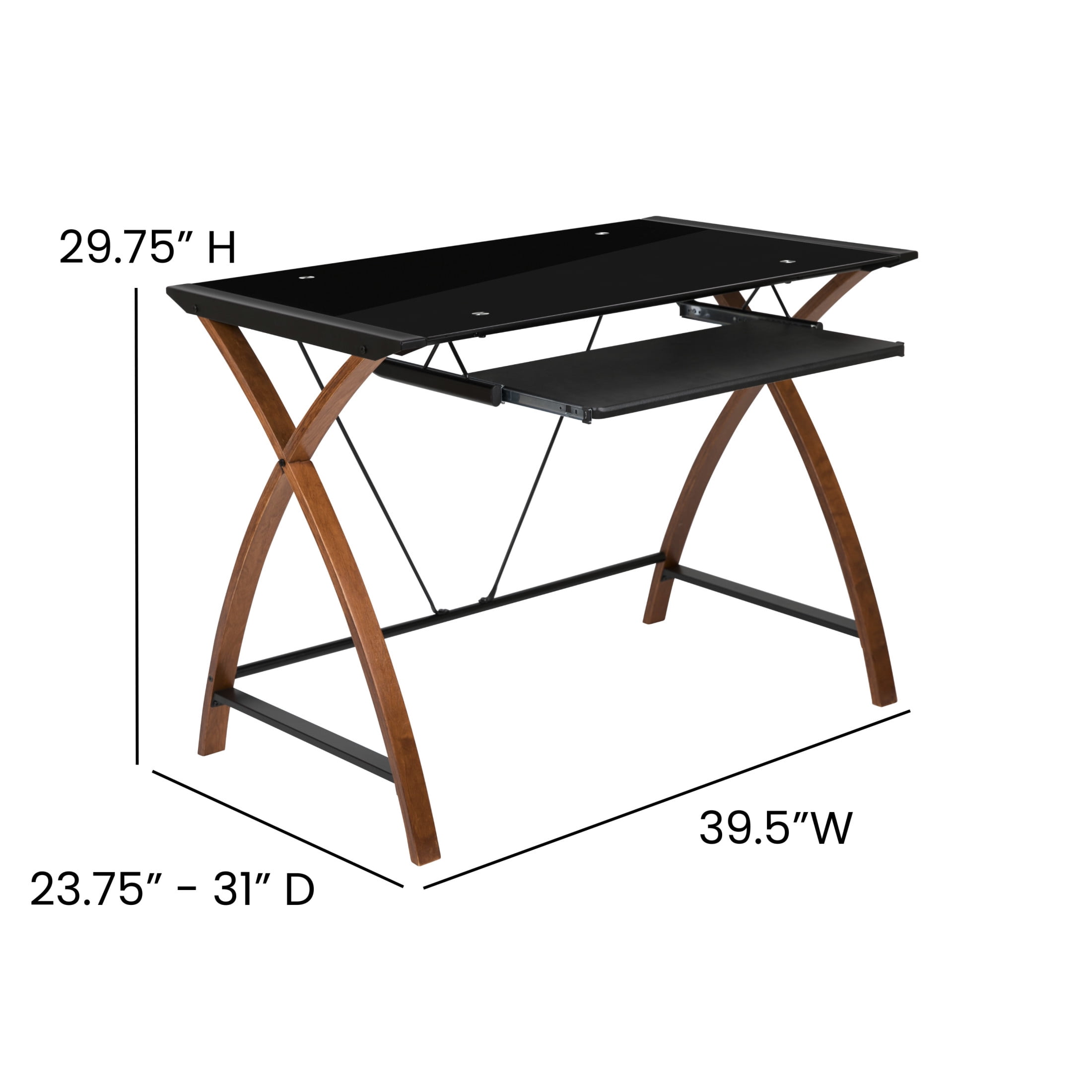 Flash Furniture Jude Black Glass Computer Desk with Pull-Out Keyboard Tray and Crisscross Frame Contemporary Compact Size Workstation Slide Out Keyboard can be used as a writing surface or to hold cell/tablet Black Sliding Keyboard Tray: 23.5″W x 11.75″D x 3.5″H from top; 25.75″H from floor Black Tempered Glass Surface lends an open airy feel to small spaces 5mm Thick Glass holds up to 110 lbs. static weight capacity Cherry Finished Plywood Crisscross Legs appeal in any décor Black Powder Coated Brace Frame Finish prevents scratches Floor Glides protect hard flooring surfaces when moving the desk Small but mighty computer desk ideal in dorms, bedrooms and home offices PRODUCT MEASUREMENTS: Overall Size: 39.5″W x 23.75″D x 29.75″H