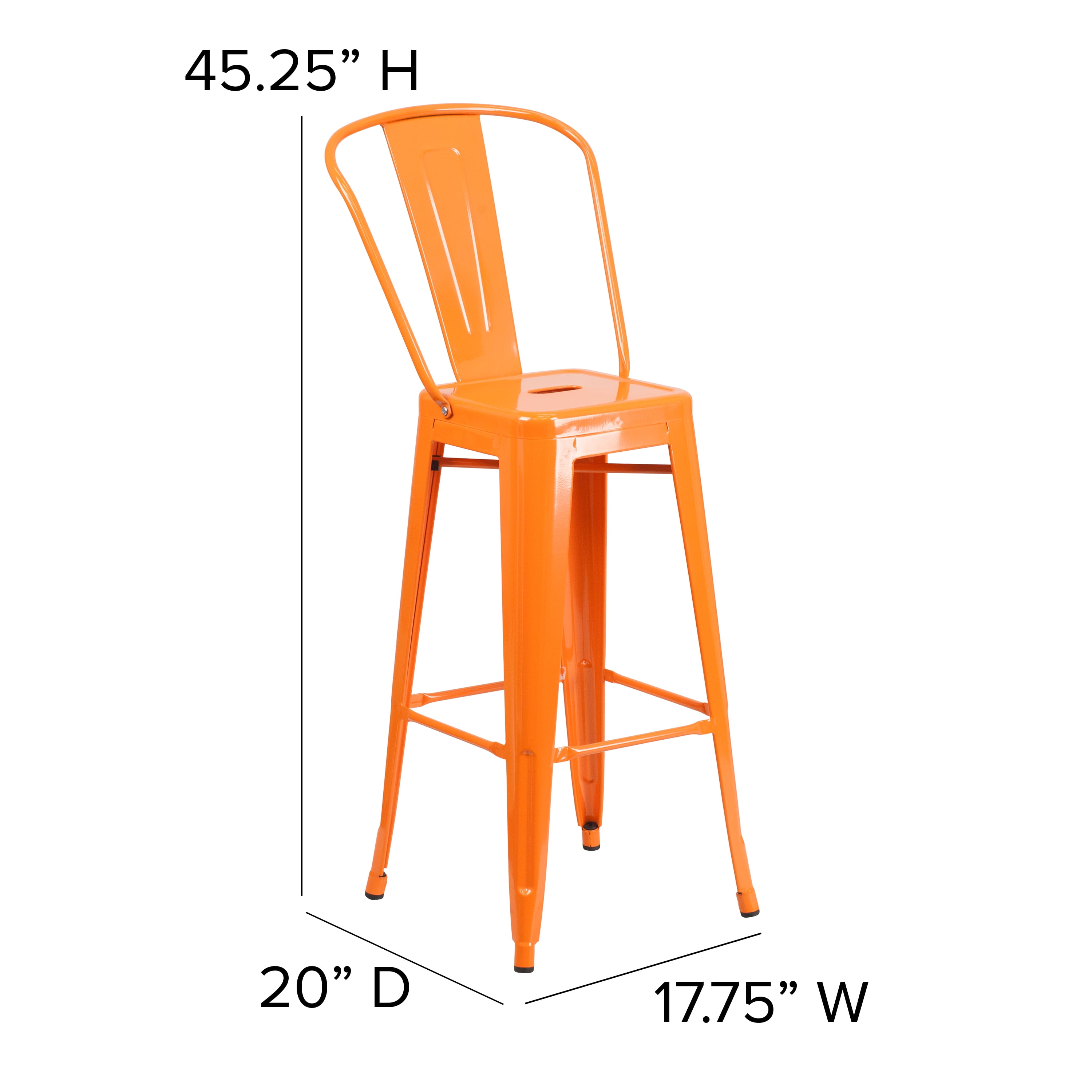 Flash Furniture Kai Commercial Grade 30″ High Orange Metal Indoor-Outdoor Bar Height Stool with Removable Back and Teak All-Weather Poly Resin Seat Modern Commercial Grade Bar Stool with Poly Resin Seat Orange Galvanized Steel Frame Teak Polystyrene Seat Will Not Rot, Chip, or Peel Convertible Back Design Underseat Cross Bracing and Integrated Footrest Holds up to 500 LBS. Static Weight Wipe Clean with a Water and a Neutral Detergent Assembles in 10 Minutes or Less with Included Materials Designed for Indoor and Outdoor Use PRODUCT MEASUREMENTS: Chair Size: 17.75″W x 20″D x 45.25″H; Seat Size: 12″W x 12″D x 30.25″H; Back Size: 17.75″W x 16.25″H | Poly Resin Seat Size: 12″W x 12″D x .75″H
