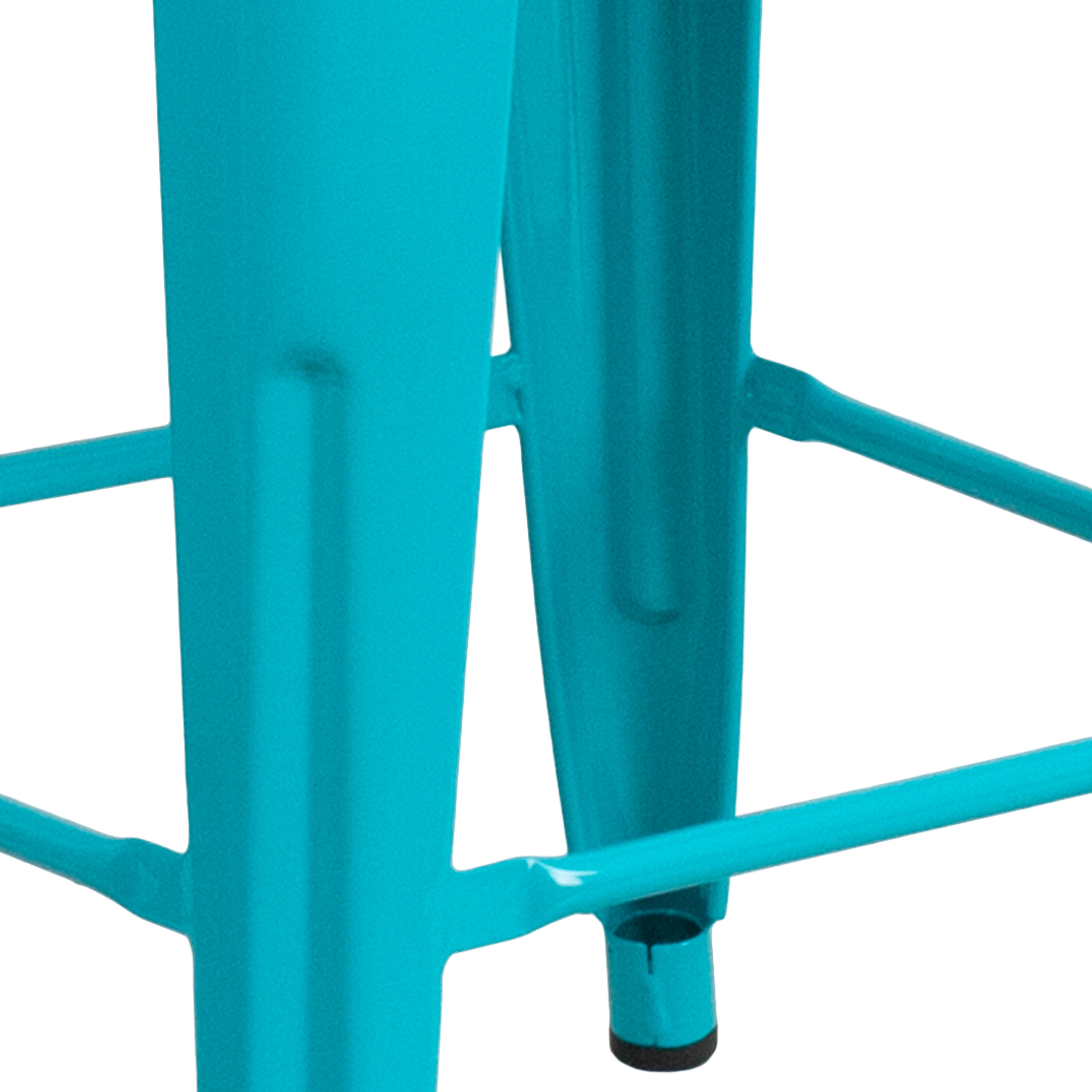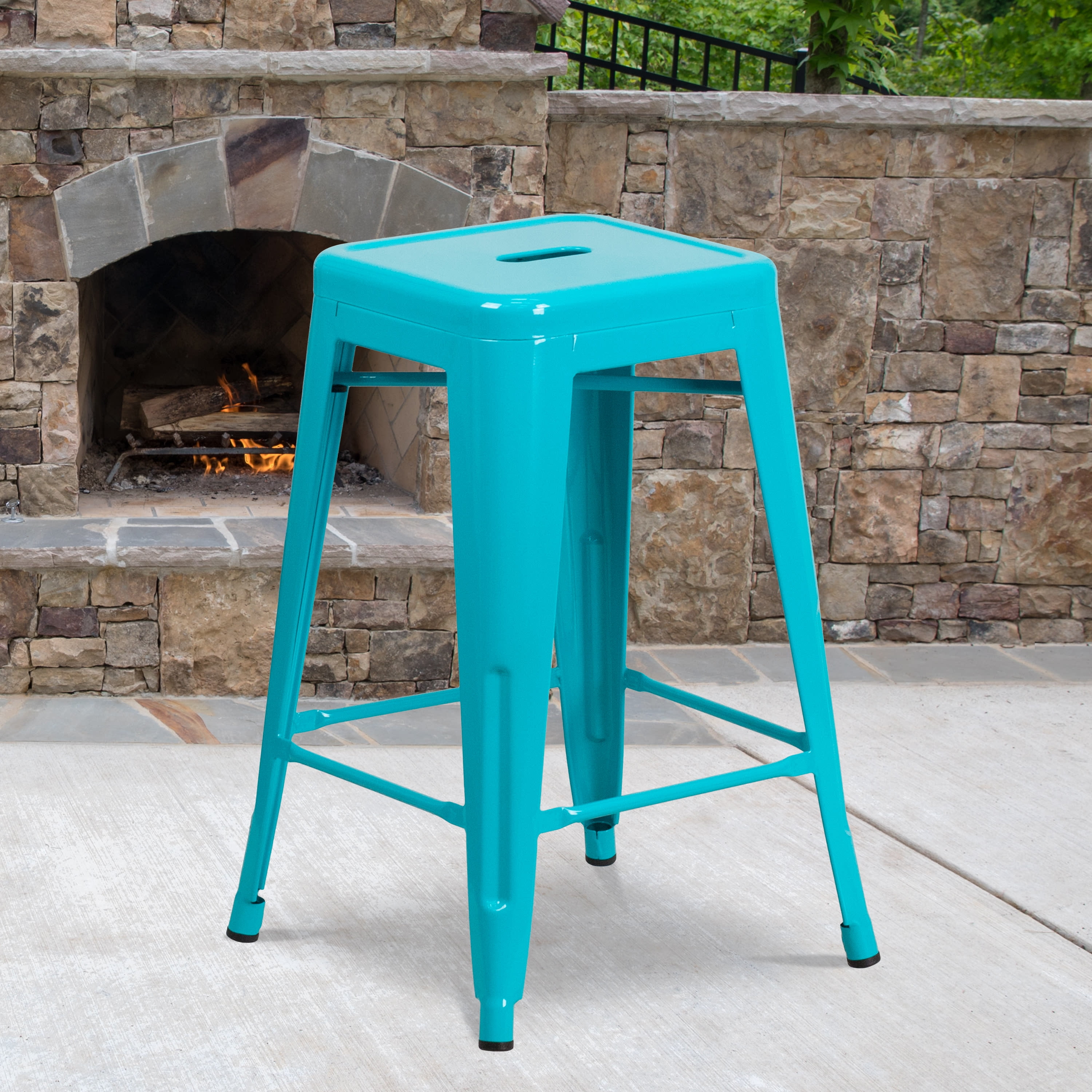 Flash Furniture Kai Commercial Grade 4 Pack 24″ High Backless Crystal Teal-Blue Indoor-Outdoor Counter Height Stool Set of 4 Industrial Backless Counter Height Stools for Indoor or Outdoor Use 500 lb. Weight Capacity Stack Quantity: 10 12″ Seat Width with Drain Hole to assist with drying Plastic Caps on cross brace protect finish when stacked Crystal-Teal Blue Powder Coated Frame Finish Footrest promotes better sitting experience Floor Glides to protect floors when used indoors Quality constructed metal stool, lightweight for ease of movement Metal Stack Stool for kitchen, dining room, bar, patio, pool, restaurant or game room PRODUCT MEASUREMENTS: Overall Size: 16″W x 16″D x 24″H; Seat Size: 12″W x 12″D x 24″H