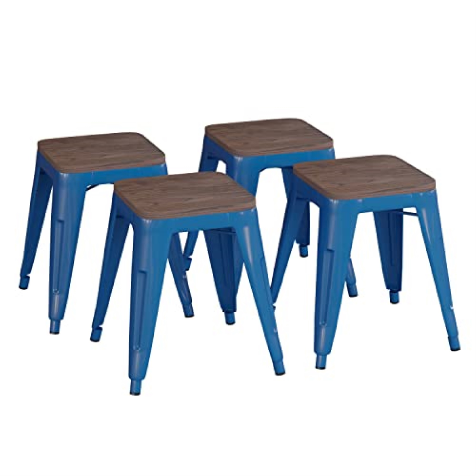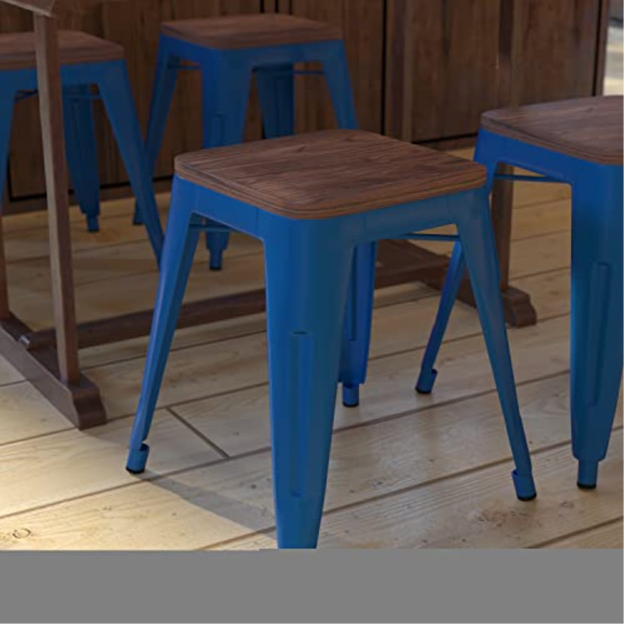 Give your kitchen or dining room an instant revamp when you choose the on-trend square shape of this set of 4 indoor metal kitchen table height stools with wooden seats. The streamlined silhouette of this short bar stool allows it to tuck under your dining room, cafe, or restaurant table to open up floor space. Great for small spaces like breakfast nooks, apartments or the corner bistro, the backless design gives an unobstructed view of your room for more visual space. The wooden seat add extra style to this on-trend seating perch. Whether you’re furnishing your home or business, a quality product is number one on your must-have list. Featuring welded construction with under seat bracing and created from 1 inch thick iron, this table stool will be a long-lasting addition to any space. This dining height stool has fixed plastic floor glides that will prevent damage to your hard flooring surfaces and is stackable up to 10 high for storage or routine cleaning. Easy clean up makes this standard height stool ideal for breakroom and lunchroom seating. Simply wipe clean with water followed by a dry cloth to maintain great looks. These dining chairs require the wooden seat to be attached and attaches in minutes. Choose from an array of colors to match any decor.