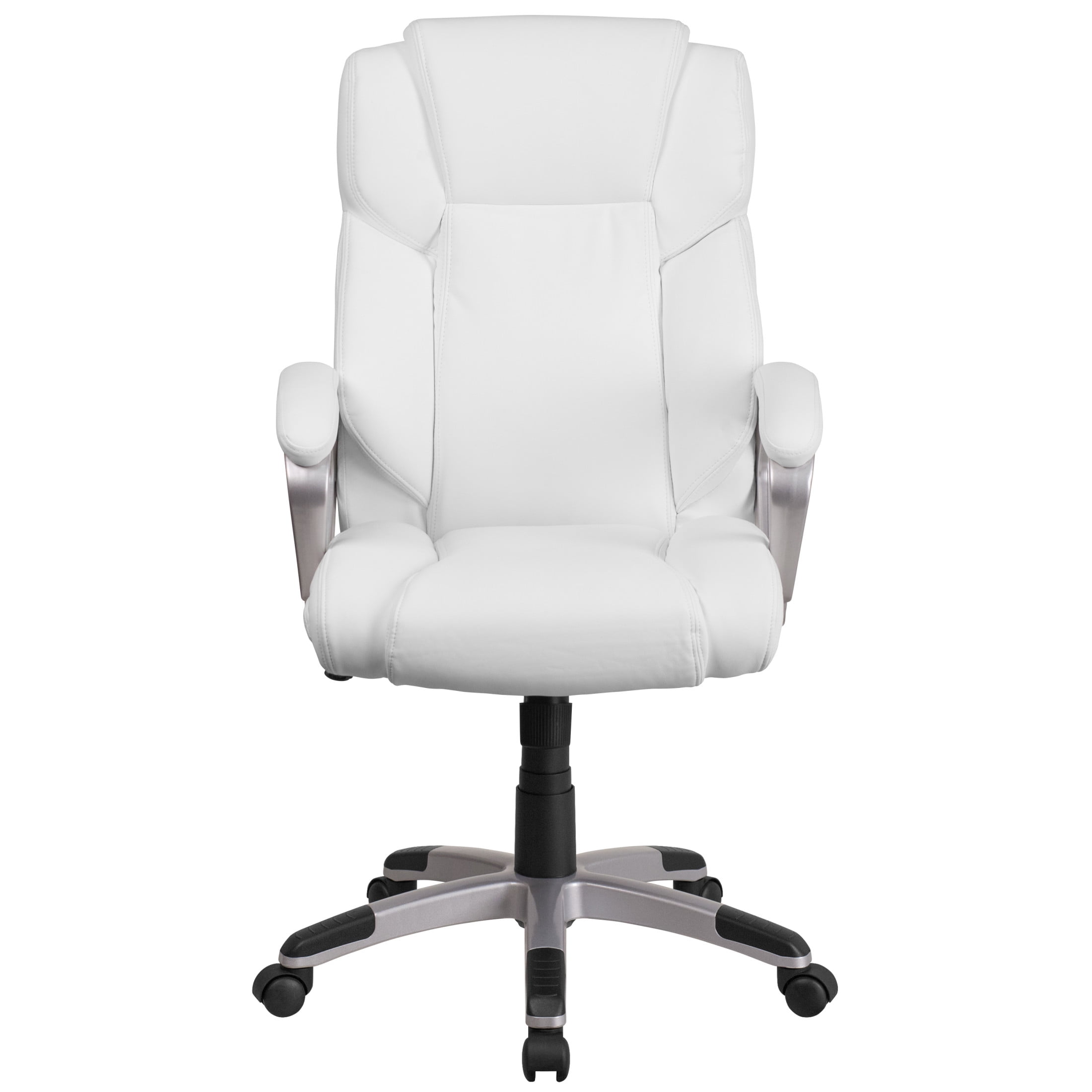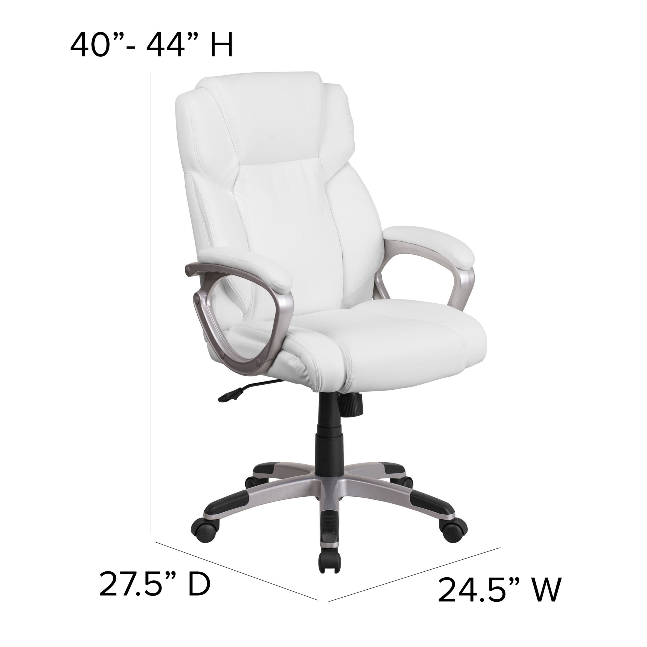Flash Furniture Kalman Modern Mid-Back LeatherSoft Executive Swivel Office Chair, Black Great for offices, nail salons, retail stores, and at-home work desks Soft and durable LeatherSoft upholstered back and seat Thickly padded waterfall front seat relieves pressure from the legs Padded armrests and mid-back design provide all-day comfort Pneumatic height adjustable 360-degree swivel seat Convenient tilt lock mechanism Easy to assemble with included tools and step-by-step instructions Overall size: 24.5″W x 27.5″D x 40-44″H; Seat size: 19″W x 19″D x 18-22″H; Back size: 19″W x 24″H; Arm size: 25.25-29.25″H from floor; 7″H from seat PRODUCT MEASUREMENTS: Overall Size: 24.5″W x 27.5″D x 40-44″H; Seat Size: 19″W x 19″D x 18-22″H; Back Size: 19″W x 24″H; Arm Size: 25.25-29.25″H from floor; 7″H from seat