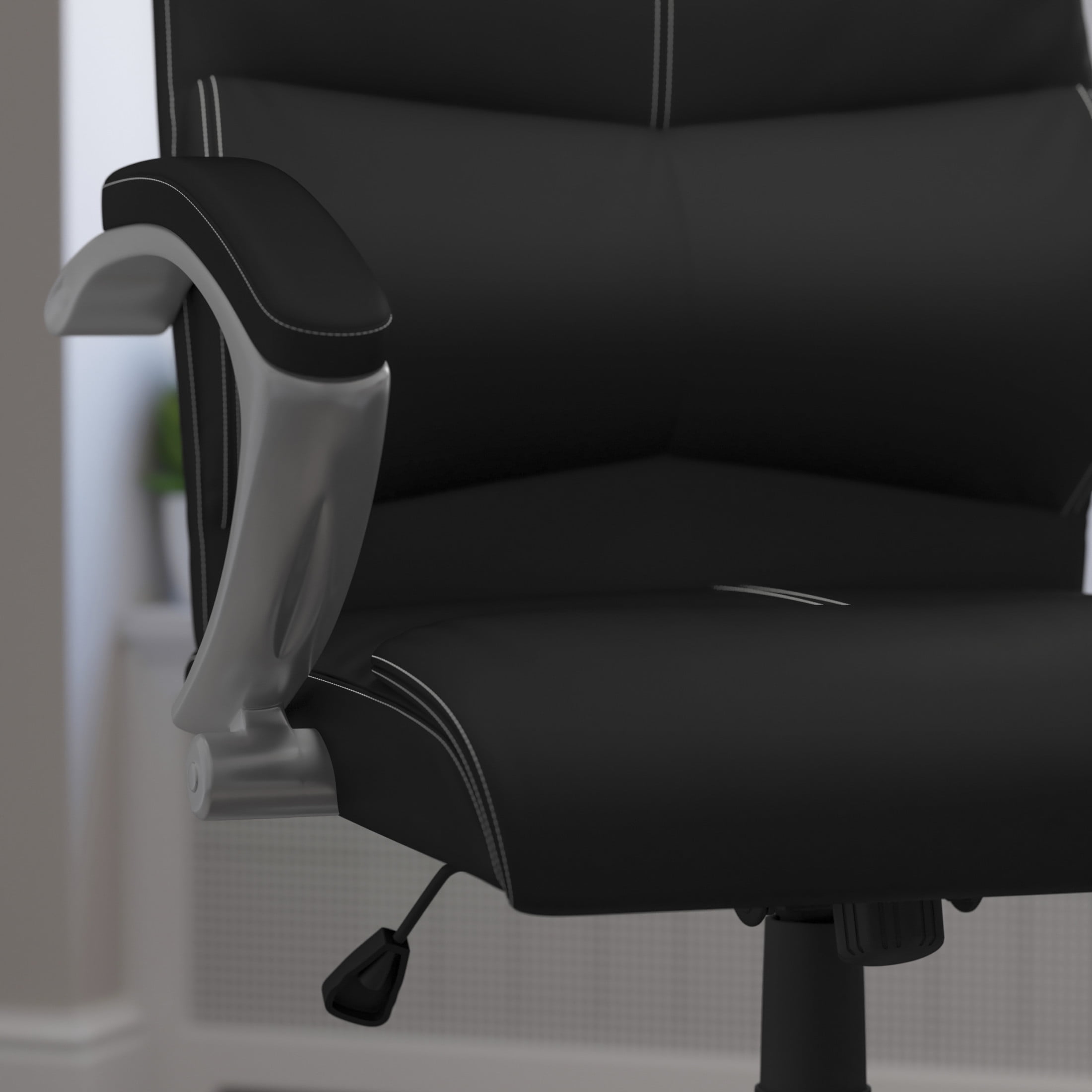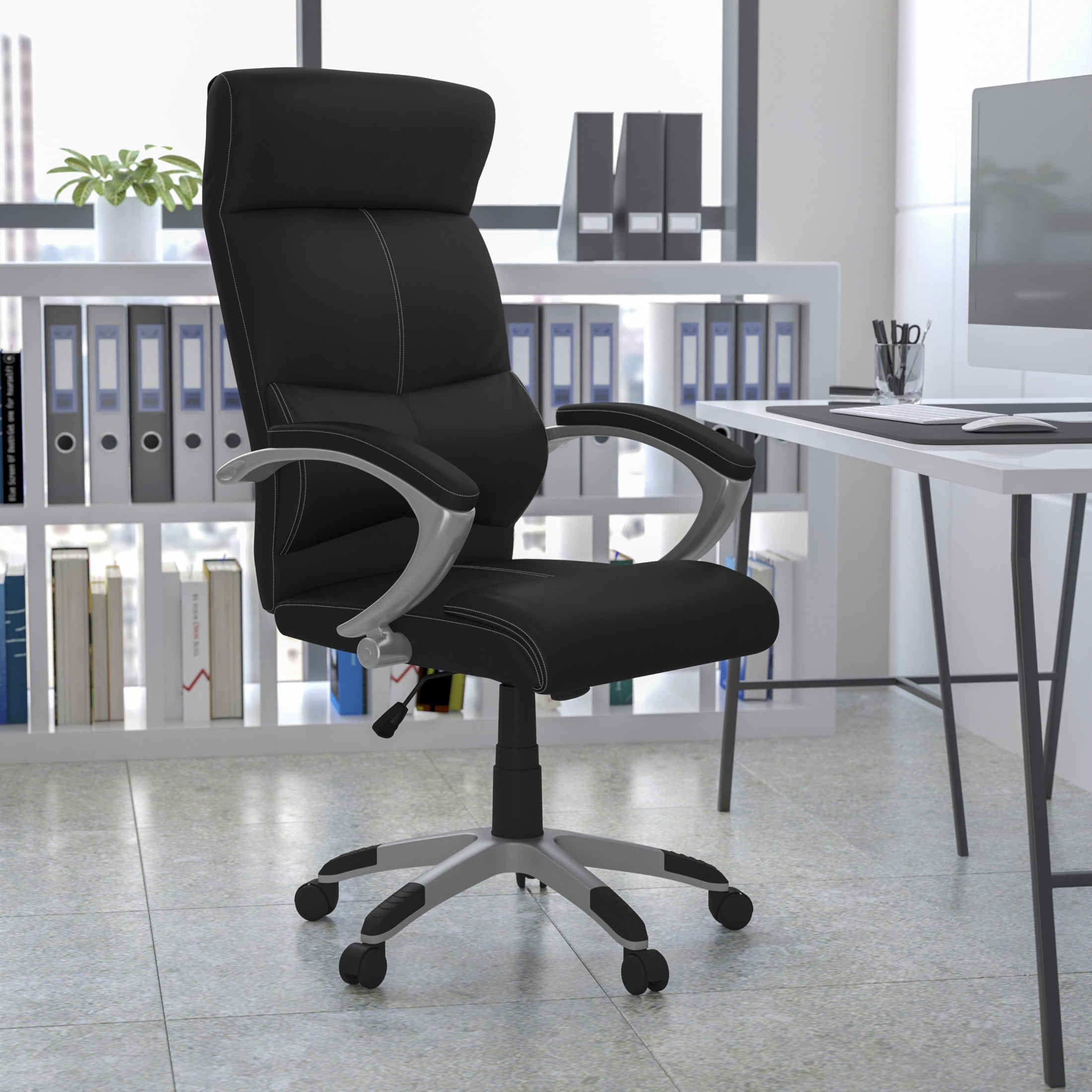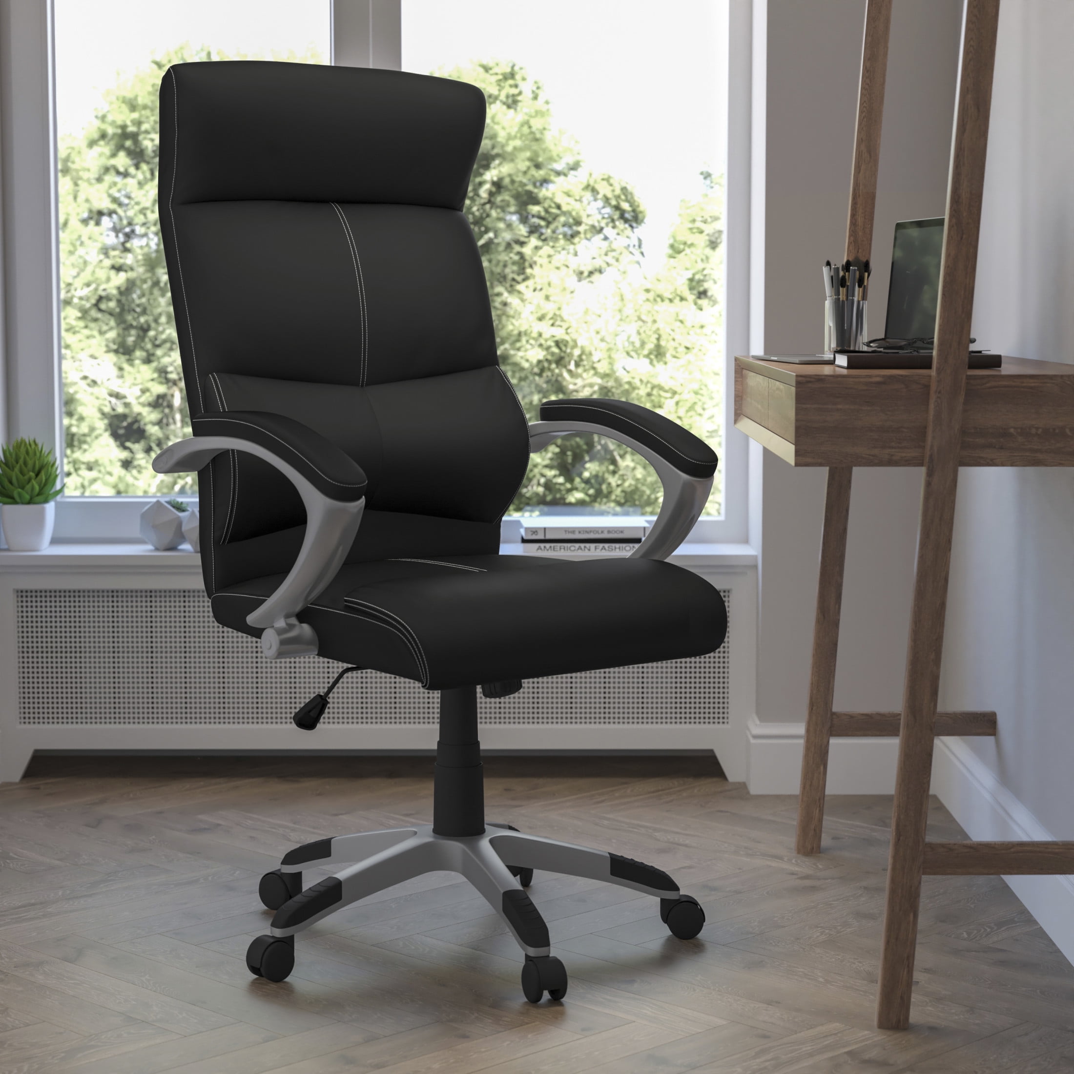 Flash Furniture Karen High Back Black LeatherSoft Executive Swivel Office Chair with Curved Headrest and White Line Stitching Contemporary Office Chair Black LeatherSoft Upholstery High Back Design with Headrest Built-In Lumbar Support Contrasting White Stitching Tilt Lock Mechanism rocks/tilts the chair and locks in an upright position Tilt Tension Adjustment Knob adjusts the chair’s backward tilt resistance CA117 Fire Retardant Foam Swivel Seat Pneumatic Seat Height Adjustment Padded Silver Finished Nylon Loop Arms Heavy Duty Silver Nylon Base with Black End Caps Dual Wheel Casters LeatherSoft is leather and polyurethane for added Softness and Durability PRODUCT MEASUREMENTS: Overall Size: 26.5″W x 29″D x 46.25-50″H; Seat Size: 22″W x 19.5″D x 19.25-23″H; Back Size: 21″W x 28″H; Arm Size: 28.5-32.25″H from floor; 10″H from seat