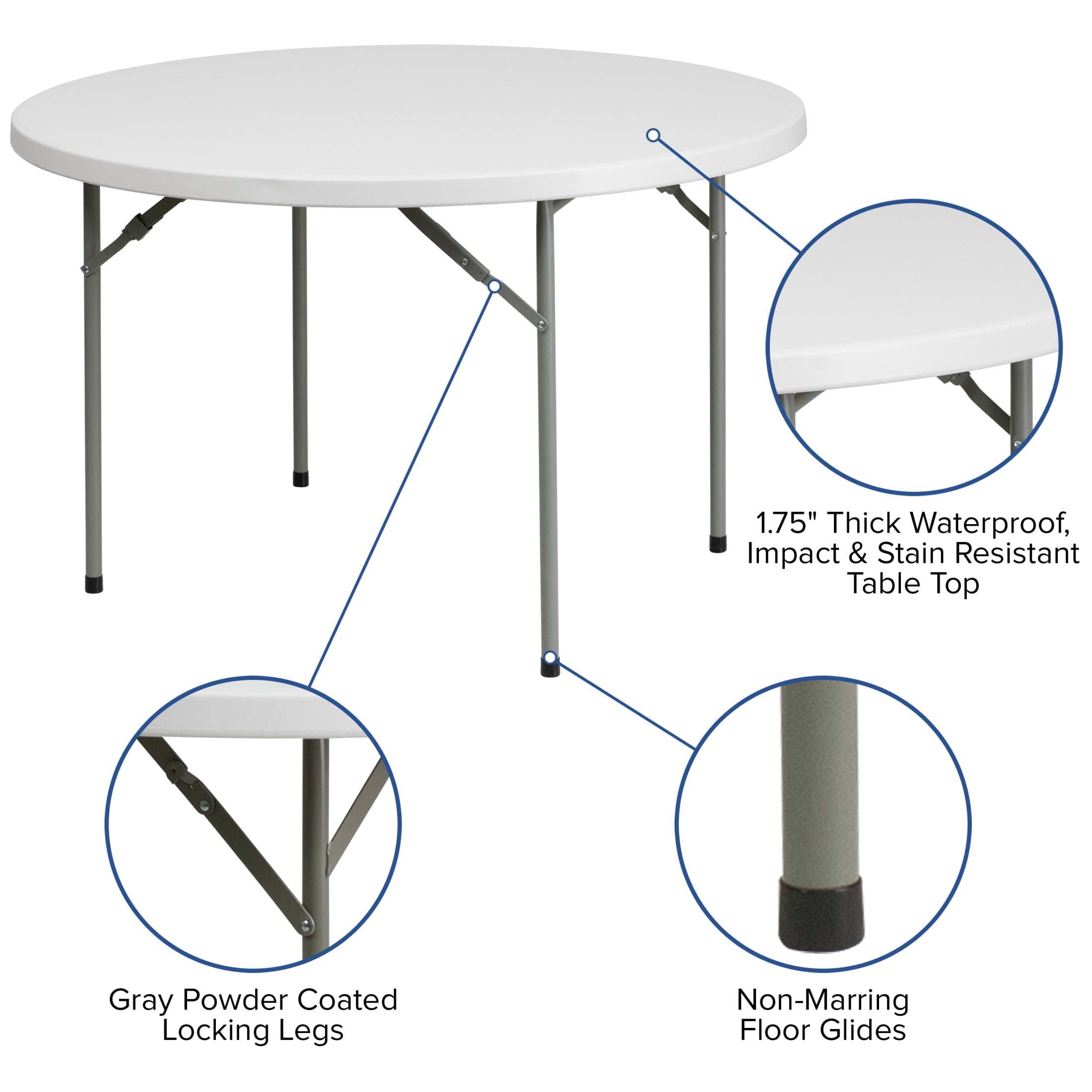 Flash Furniture Kathryn 4′ Round Plastic Event Folding Table, White Comfortably seats 6 adults at various indoor or outdoor events Convenient foldable design for easy transportation and storage Powder-coated locking legs with non-marring floor caps 1.75″ thick waterproof and impact and stain-resistant tabletop Can be used as is or dressed up with a tablecloth to achieve a custom look No assembly required; wipes down with a damp cloth for easy cleaning Overall size: 48″ W x 48″ D x 29″ H; Supports up to 500 lbs. of static weight Easy to clean – wipe down with a damp cloth as needed Supports up to 500 lbs. of static weight Overall size: 48″W x 48″D x 29″H NO ASSEMBLY REQUIRED: Supports up to 500 lbs. of static weight and measures 48″W x 48″D x 29″H with no assembly required, so you can start setting up for events right away