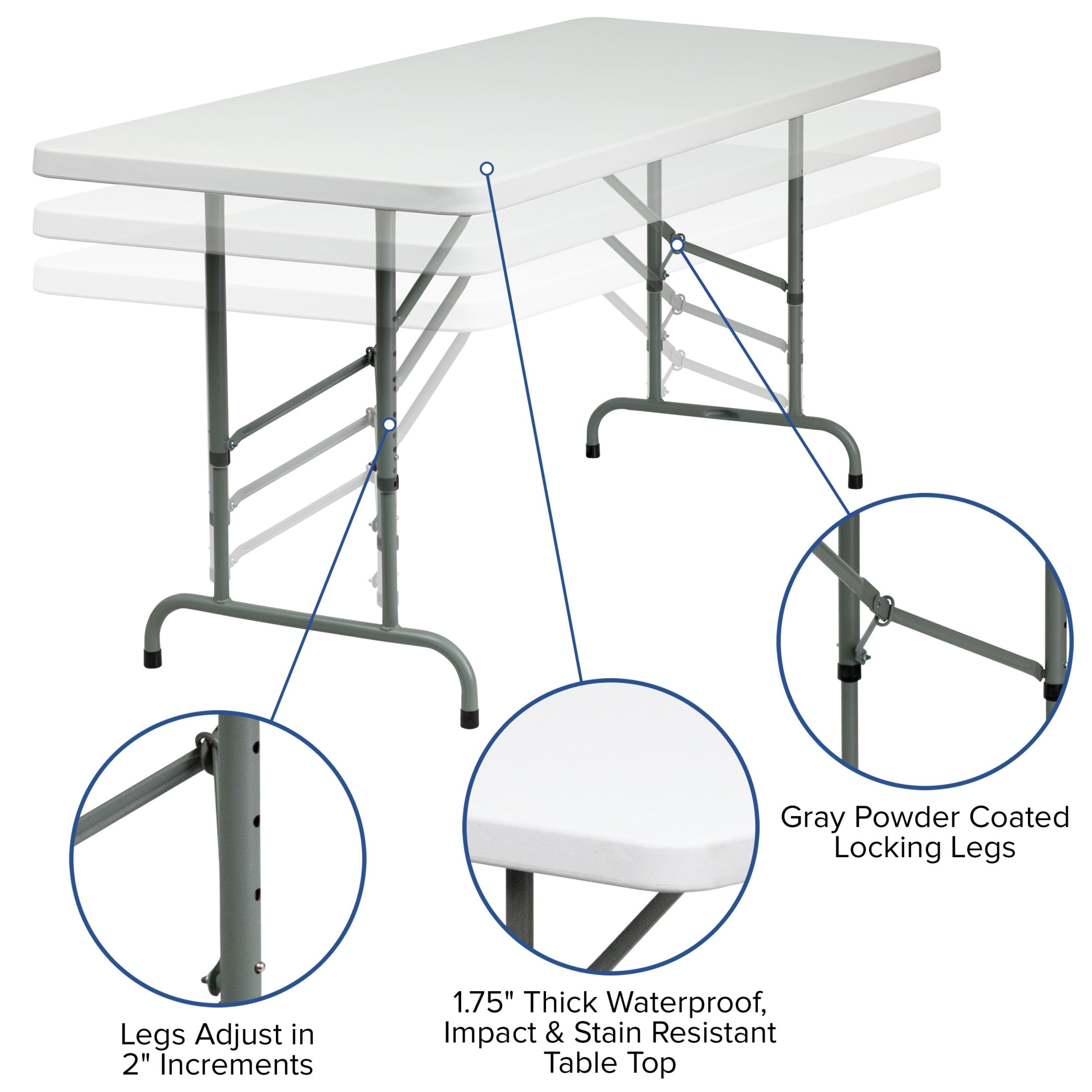 Flash Furniture Kathryn 6′ Rectangular Adjustable Plastic Folding Event Table, White Great for various indoor or good-weather outdoor home, school, or business events Comfortably seats up to 8 adults Foldable design for easy transportation and storage Height-adjustable, powder-coated locking legs Constructed with a 1.75″ thick waterproof and impact and stain-resistant tabletop Can be used as is or dressed up with a tablecloth to achieve a custom look No assembly required Easy to clean – wipe down with a damp cloth as needed Supports up to 330 lbs. of static weight Overall size: 30″W x 72″D x 24.125-32″H NO ASSEMBLY REQUIRED: Supports up to 330 lbs. of static weight and measures 30″W x 72″D x 24.125-32″H with no assembly required, so you can start setting up for events right away
