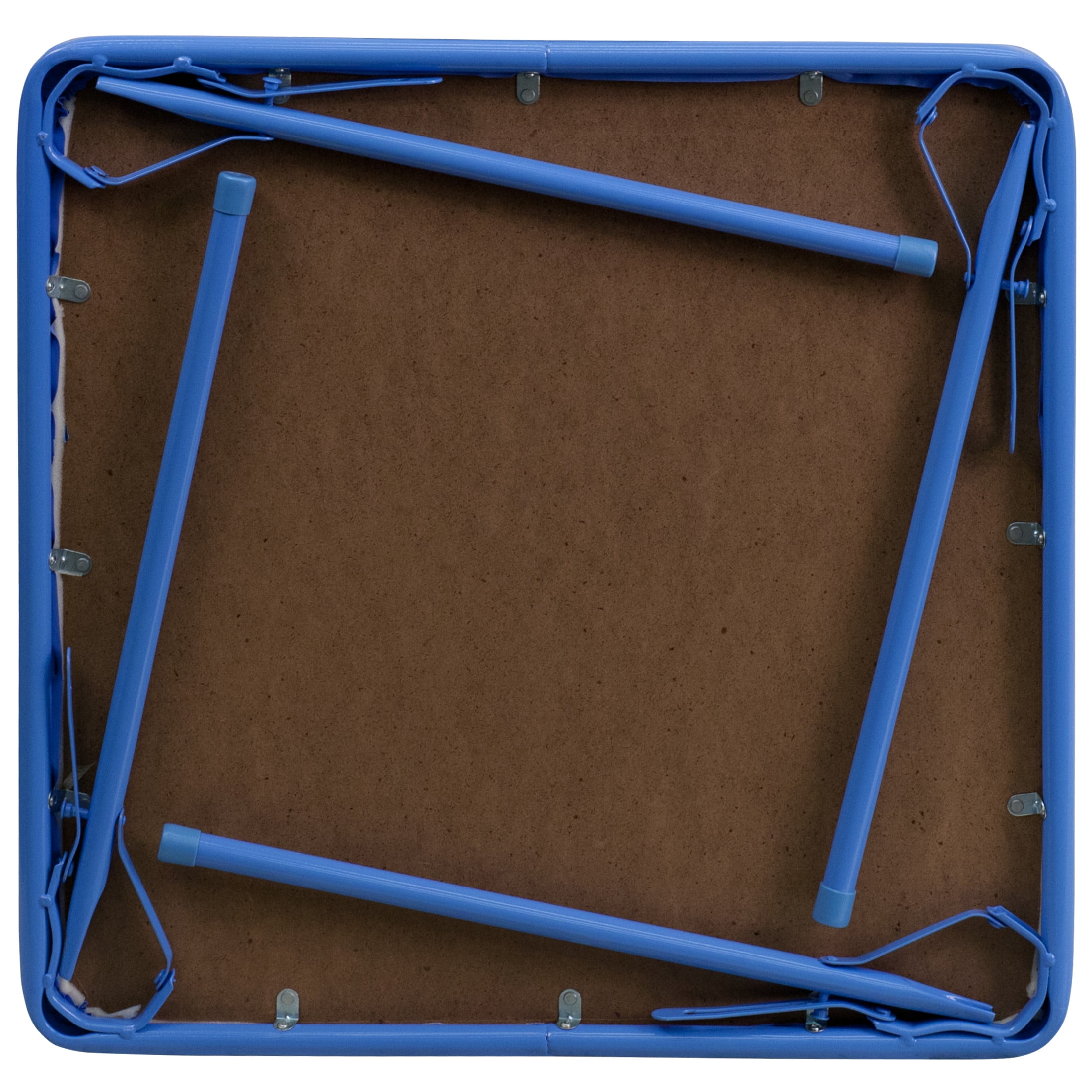 Multipurpose Kids Folding Table for eating and activities 70 lb. Distributed Weight Capacity Seats up to 4 Kids .1875″ Thick Blue Vinyl Padded Table Top CA117 Sponge Foam Padding Blue Powder Coated Locking Legs with non-marring floor caps Safety Feature: accidental folding measure, fold legs by pushing levers inward Ships Fully Assembled