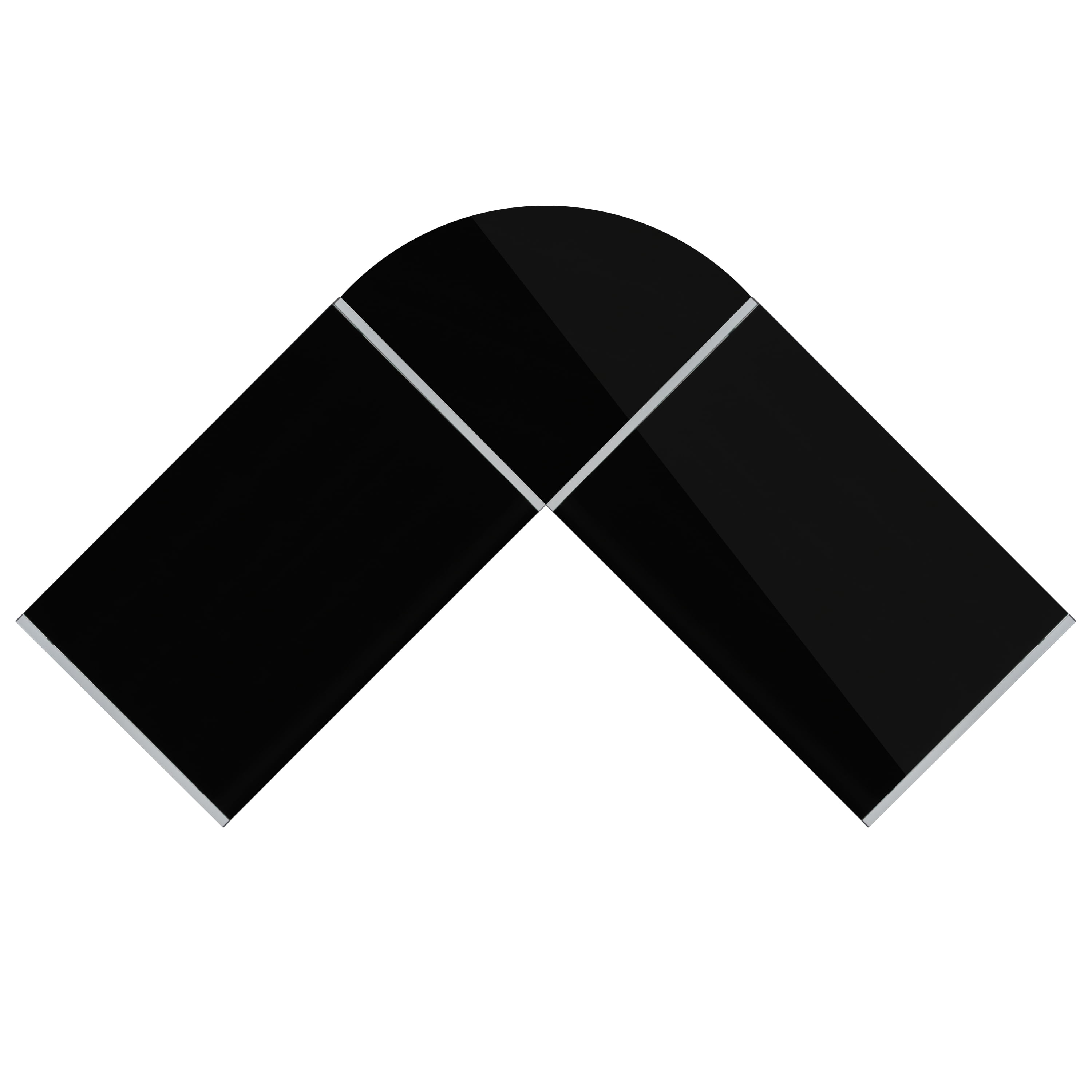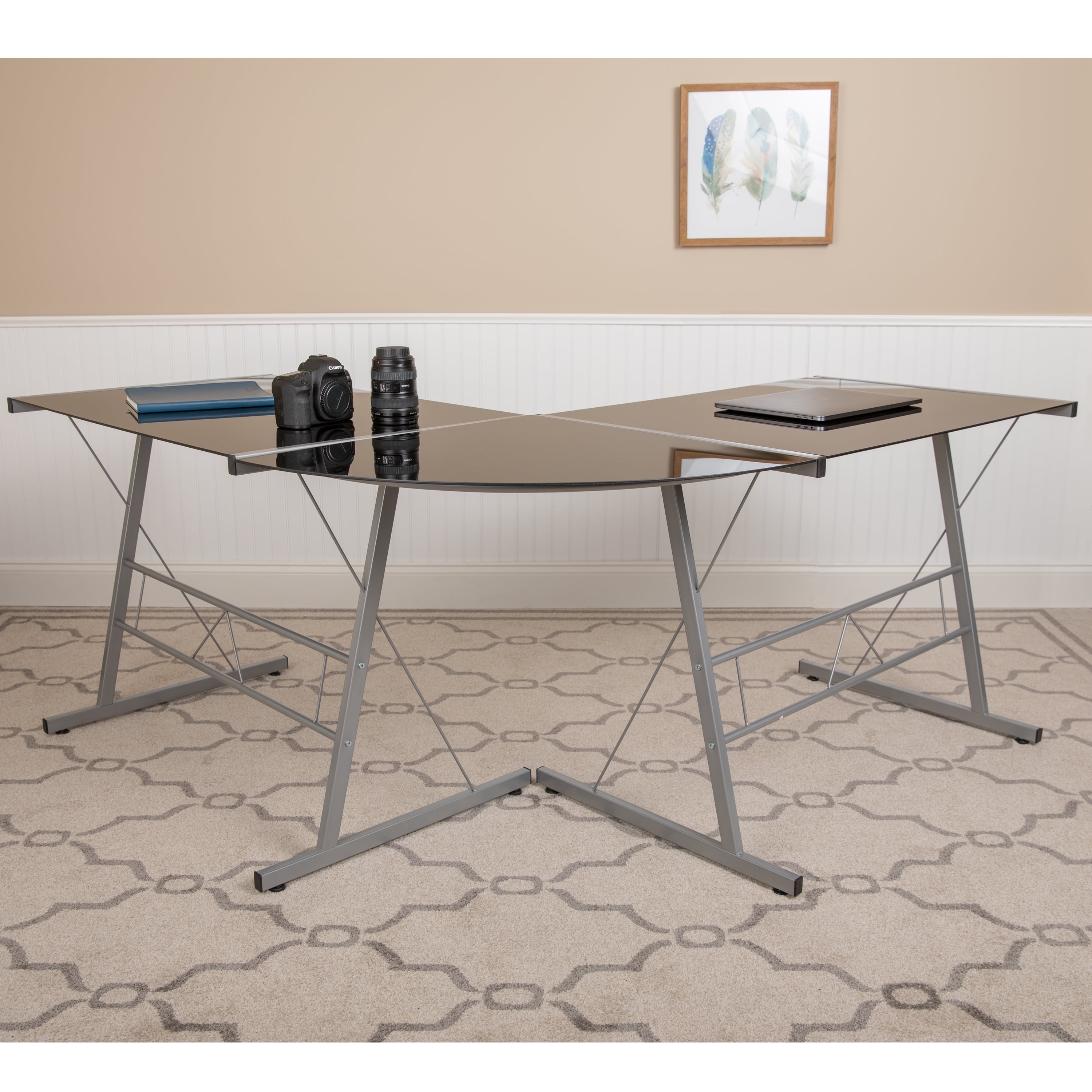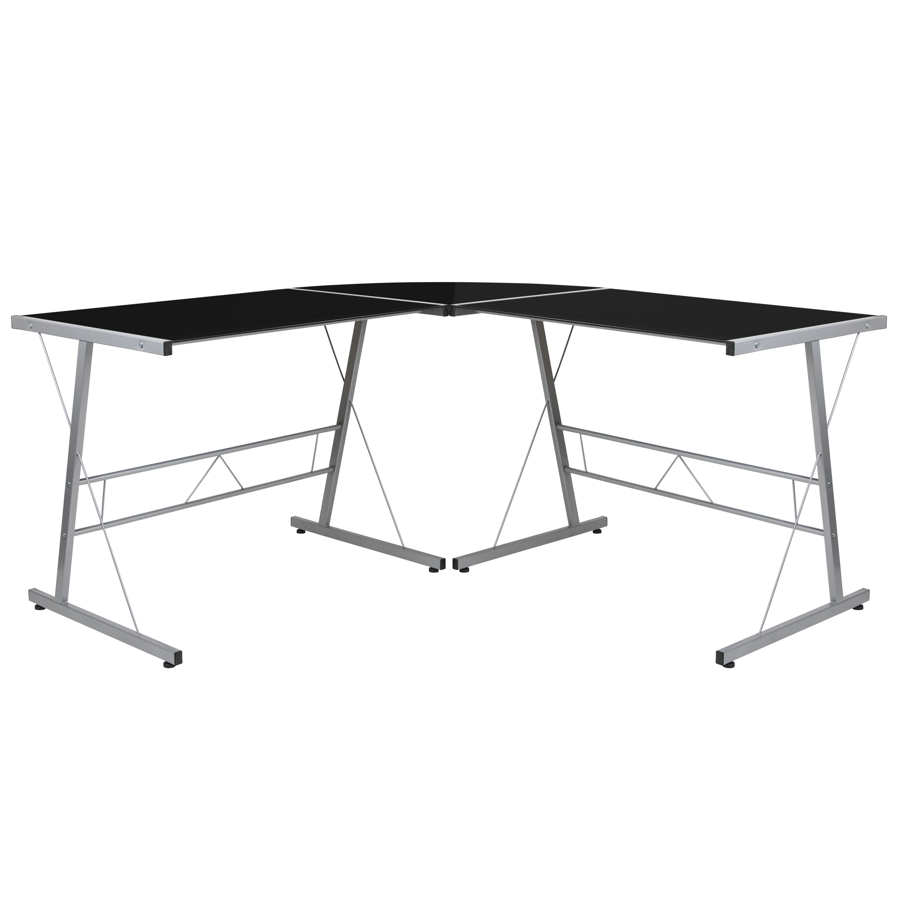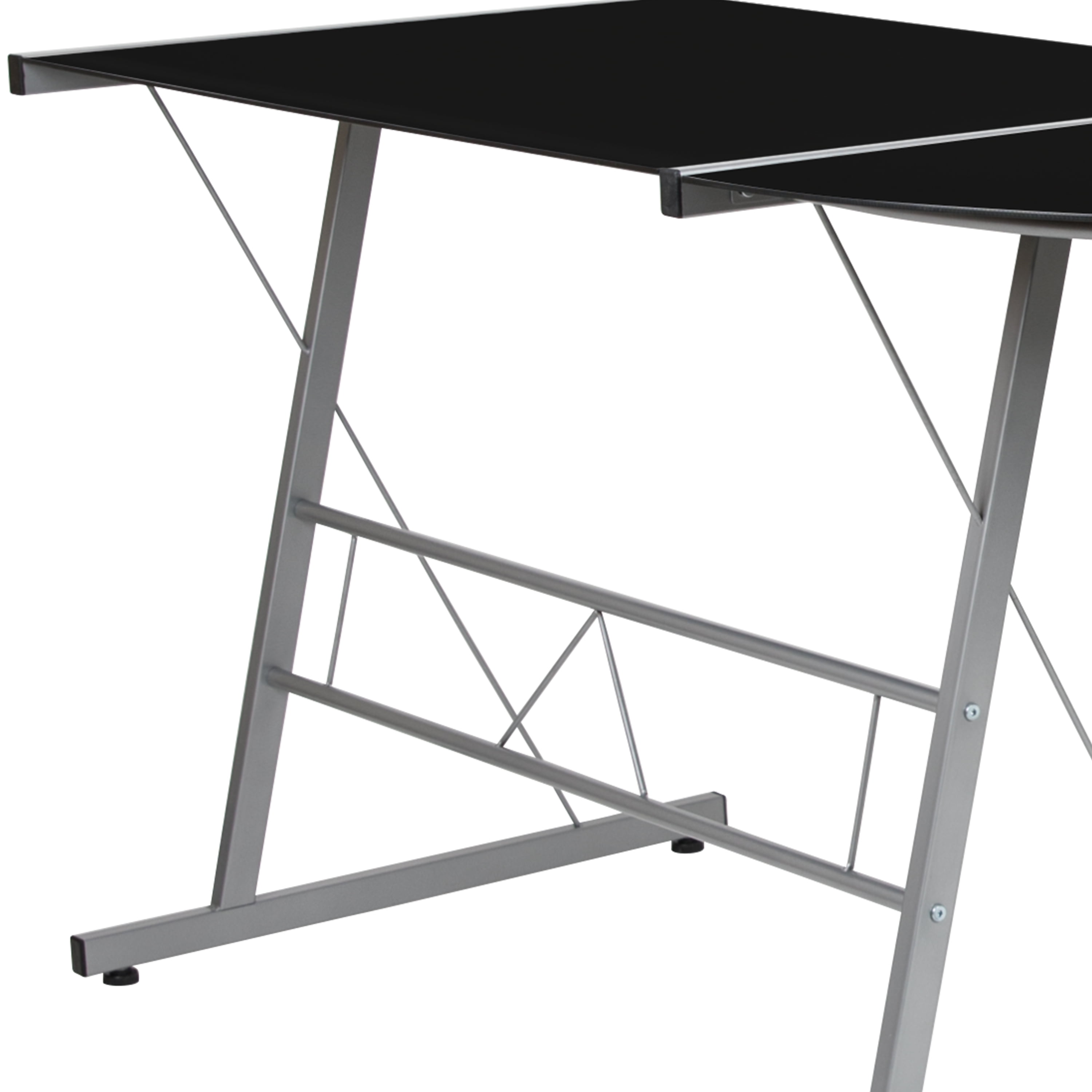 Contemporary Style matches almost any décor Black Tempered Glass Surface for easy cleaning 5mm Thick Glass Top Holds up to 110 lbs. static weight capacity L-Shaped desktop provides large surface for working or gaming Silver Powder Coated Metal Frame for strength and durability Self-Leveling Floor Glides keep the desk steady Components: Overall Diagonal Width: 83.5″ Glass Desks (2): 35.5″W x 23.5″D x 29″H Corner Connector: 33.25″W x 23.5″D