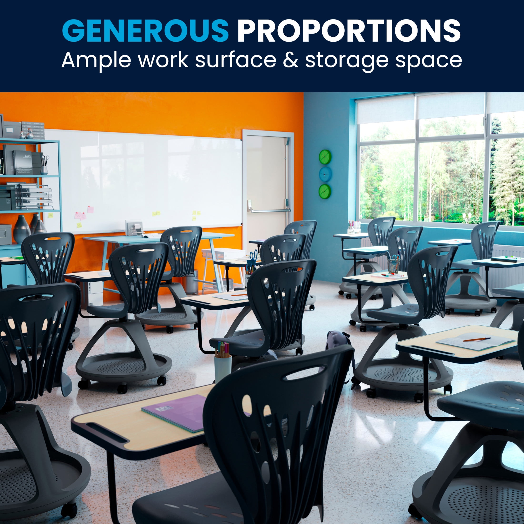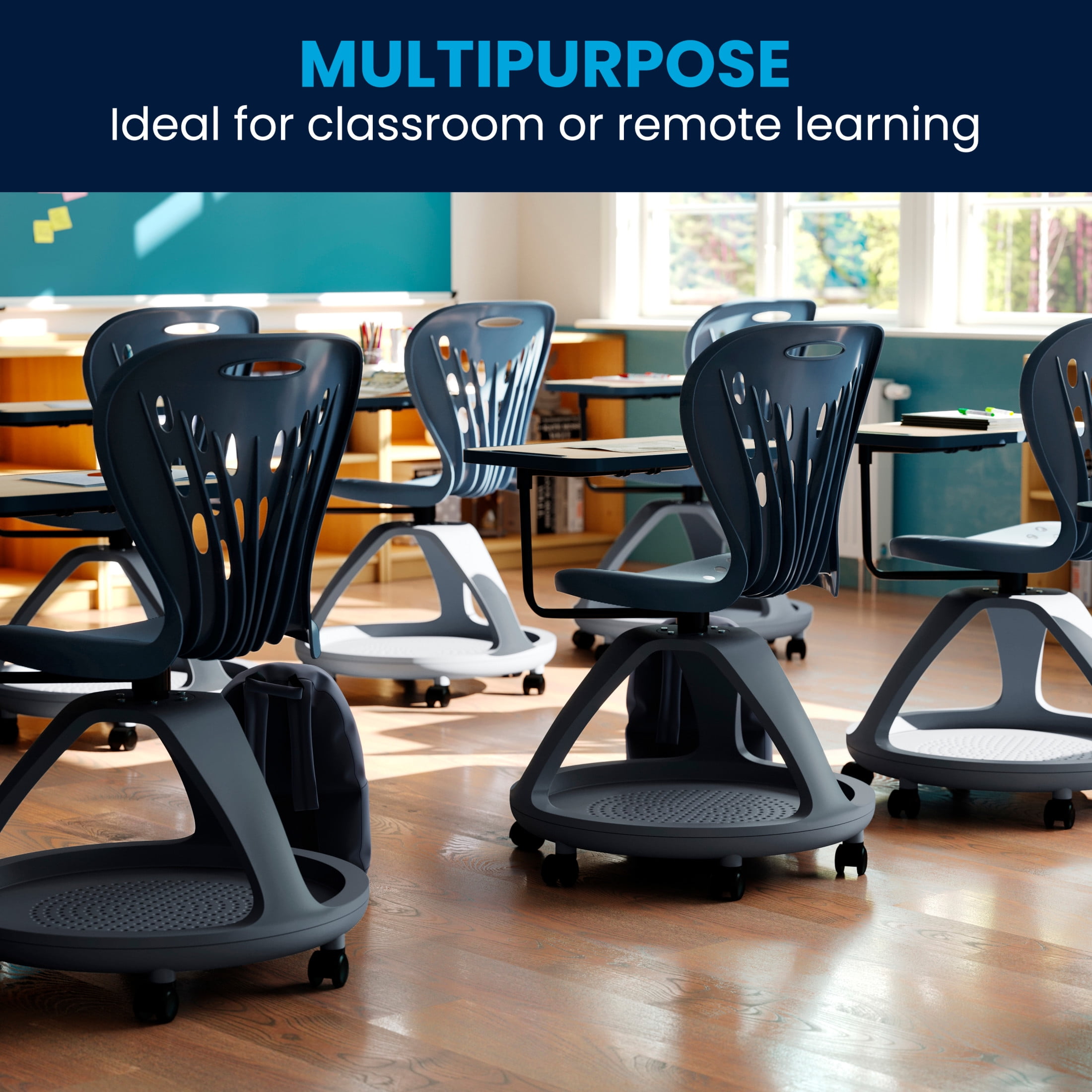 Flash Furniture Laikyn Dark Gray Mobile Desk Chair with 360 Degree Tablet Rotation and Under Seat Storage Cubby Mobile Tablet Arm Chair with Book Storage – Recommended for Grades 7 and Up 360 Degree Rotating Tablet Arm holds laptops or tablets Tablet Arm Size with Pen/Pencil Holder: 19.50″W x 11.75″D x 0.75″H Full range of motion ideal for collaborative learning Ergonomic Design with Ventilated Plastic Back and Seat for comfort Great for commercial settings, non-upholstered seat cleans easily with water based cleaner Iron Frame with 6 Heavy Duty Casters 265 lb. Seating Capacity accommodates most users, Underseat Storage Cubby holds up to 22 lbs. Assembles within 30 minutes for quick use – tools included Rotating desk chair for classrooms, remote learning, homeschooling HIGH-QUALITY CONSTRUCTION: Durable solid iron frame and heavy-duty plastic withstands years of quality use and supports up to 265 lbs., and the chair can be cleaned with a water based cleaner as needed