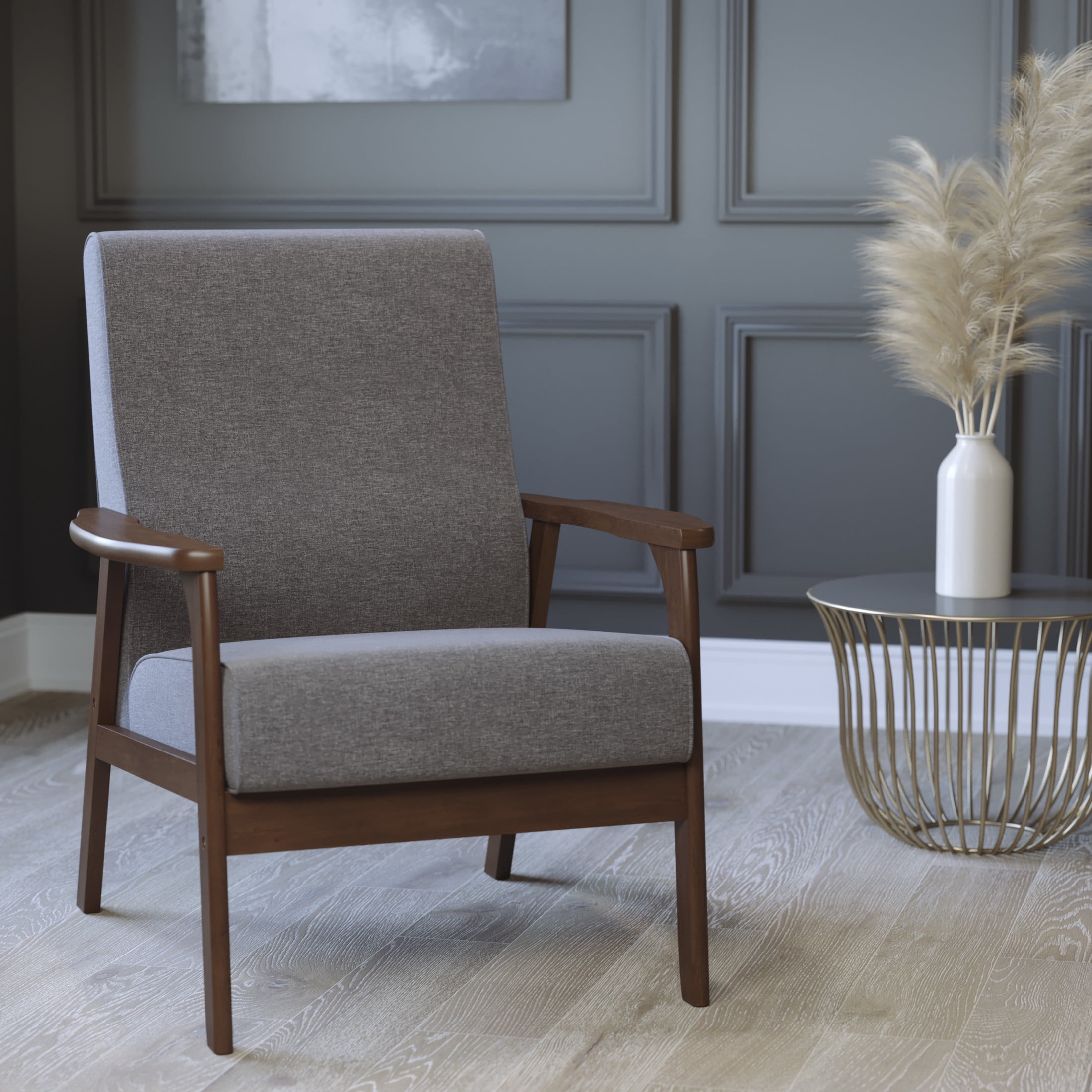 Flash Furniture Langston Living Room Chair, Dark Gray Faux Linen Mid-Century Modern Commercial Grade Upholstered Accent Armchair Gray Faux Linen Upholstered Back and Seat Padded Back and Seat Cushions with Sinuous Springs Walnut Finished Wooden Frame and Armrests Solid Wood Legs Hold up to 300 LBS. Static Weight Capacity Fixed Floor Glides Protect Hard Flooring Surfaces Wipes Clean with a Dry Cloth Assembles in 30 Minutes or Less with Included Materials PRODUCT MEASUREMENTS: Overall Size: 25.25″W x 30″D x 33.25″H; Seat Size: 20″W x 19.75″D x 17″H; Back Size: 20″W x 20″H; Arm Size: 20.75″H from floor; 5.5″H from seat