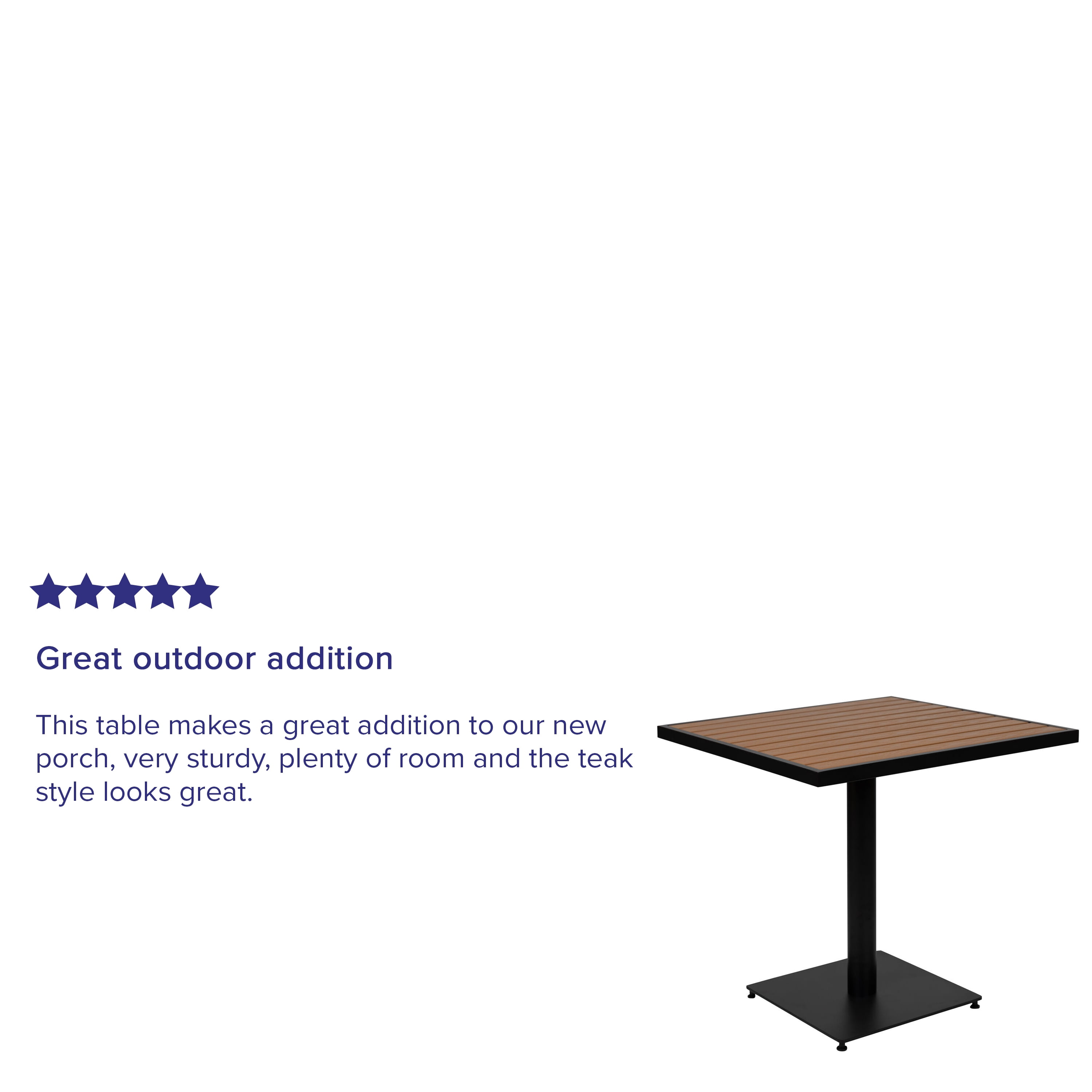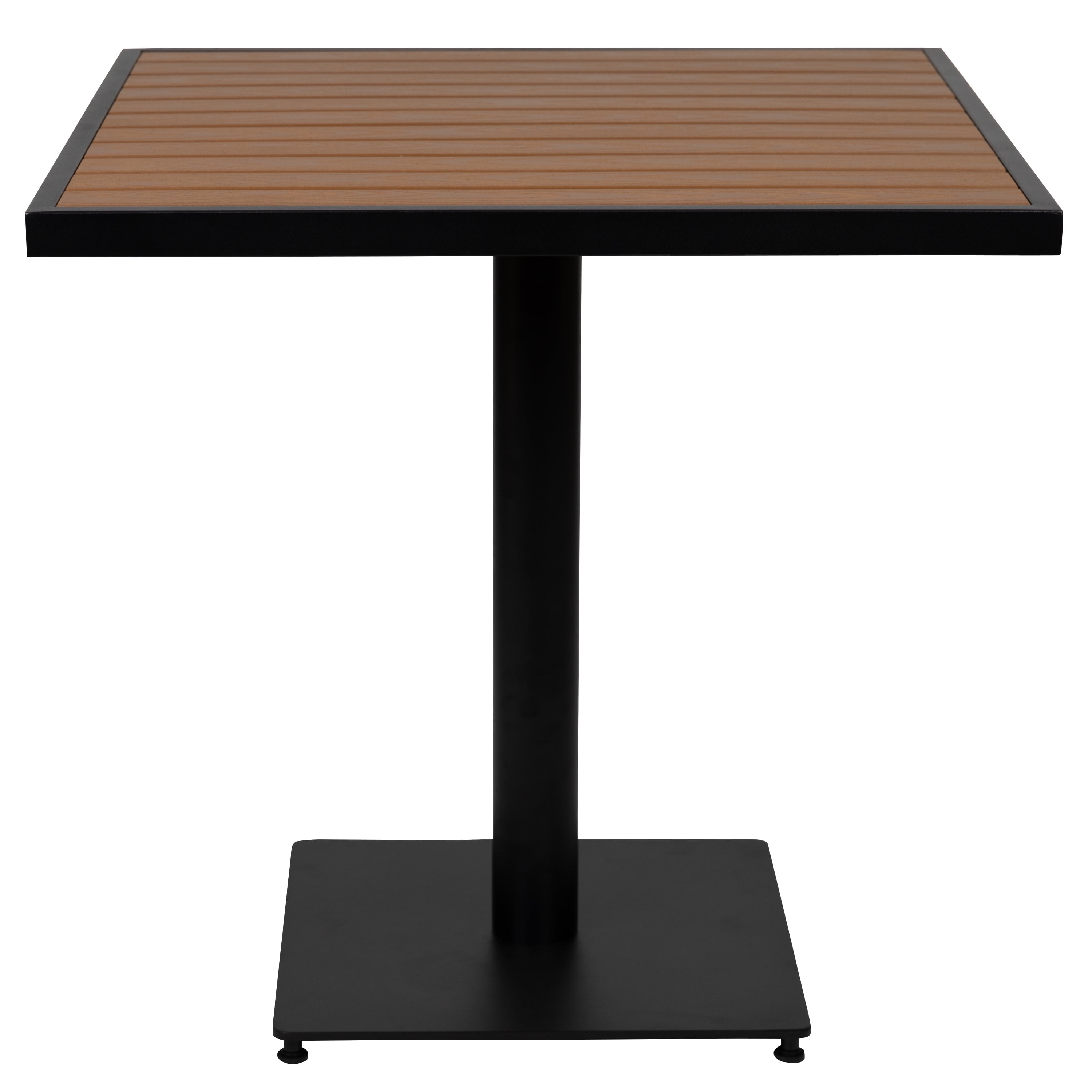 Create the perfect space for relaxing evenings and great conversations with this faux teak outdoor patio table. This beautiful square outdoor table boasts a slatted poly top and strong steel frame capable of holding up to 150 lbs. static weight capacity. This faux teak patio table is weather and rust resistant so you won’t need to move it or put it away when the seasons change. Assembly is easy so you can start enjoying as soon as possible. The faux teak slats pair nicely with the black powder coated frame finish to create a sophisticated look for your outdoor space. Adjustable plastic floor glides will allow ease of movement and spills clean up easily with a water based cleaning agent making this bistro patio table very low maintenance. Complete the set by adding our outdoor faux teak side chair and make the most of your evenings and weekends.