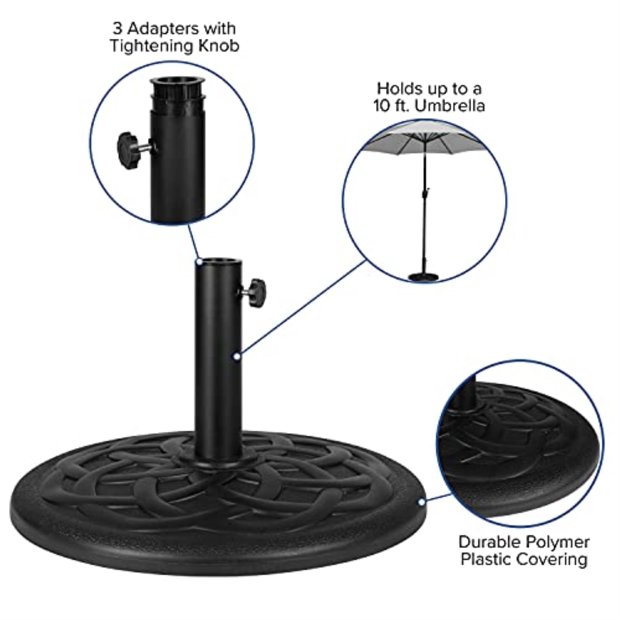 3 Piece Faux Teak Patio Table and 9FT Umbrella Set for residential or commercial use Patio Table Size: 48″W x 30″D x 29.5″H; Umbrella Hole: 1.75″ Diameter Faux Teak Slatted Table Top; Powder Coated Steel Frame 300 Lbs. Static Weight Capacity; Assembles in 30 Minutes or Less Patio Umbrella Size: 5.5-104.5″W x 5.5- 104.5″D x 96.5″H; Pole Diameter: 1.5″ 30+ UV Treated Polyester Vented Top withstands light breezes and rain Smooth Crank Motion and 33° Push Button Tilt for custom shading Umbrella Base 5.5-104.5″W x 5.5- 104.5″D x 96.5″H; Pole Diameter: 1.5″ 30 Lb. Cement Filled Base Holds Umbrellas up to 10 FT Wide Plastic Covering Resists Rot and Weather Damage PRODUCT MEASUREMENTS: Table Size: 48″W x 30″D x 29.5″H | Umbrella Size: 5.5-104.5″W x 5.5- 104.5″D x 96.5″H | Base Size: 19.25″W x 19.25″D x 3.25″H; Post Size: 2.25″W x 2.25″D x 10″H 3 Piece Faux Teak Patio Table and 9FT Umbrella Set for residential or commercial use Patio Table Size: 48″W x 30″D x 29.5″H; Umbrella Hole: 1.75″ Diameter Faux Teak Slatted Table Top; Powder Coated Steel Frame 300 Lbs. Static Weight Capacity; Assembles in 30 Minutes or Less Patio Umbrella Size: 5.5-104.5″W x 5.5- 104.5″D x 96.5″H; Pole Diameter: 1.5″ 30+ UV Treated Polyester Vented Top withstands light breezes and rain Smooth Crank Motion and 33° Push Button Tilt for custom shading Umbrella Base 5.5-104.5″W x 5.5- 104.5″D x 96.5″H; Pole Diameter: 1.5″ 30 Lb. Cement Filled Base Holds Umbrellas up to 10 FT Wide Plastic Covering Resists Rot and Weather Damage PRODUCT MEASUREMENTS: Table Size: 48″W x 30″D x 29.5″H | Umbrella Size: 5.5-104.5″W x 5.5- 104.5″D x 96.5″H | Base Size: 19.25″W x 19.25″D x 3.25″H; Post Size: 2.25″W x 2.25″D x 10″H 3 Piece Faux Teak Patio Table and 9FT Umbrella Set for residential or commercial use Patio Table Size: 48″W x 30″D x 29.5″H; Umbrella Hole: 1.75″ Diameter Faux Teak Slatted Table Top; Powder Coated Steel Frame 300 Lbs. Static Weight Capacity; Assembles in 30 Minutes or Less Patio Umbrella Size: 5.5-104.5″W x 5.5- 104.5″D x 96.5″H; Pole Diameter: 1.5″ 30+ UV Treated Polyester Vented Top withstands light breezes and rain Smooth Crank Motion and 33° Push Button Tilt for custom shading Umbrella Base 5.5-104.5″W x 5.5- 104.5″D x 96.5″H; Pole Diameter: 1.5″ 30 Lb. Cement Filled Base Holds Umbrellas up to 10 FT Wide Plastic Covering Resists Rot and Weather Damage PRODUCT MEASUREMENTS: Table Size: 48″W x 30″D x 29.5″H | Umbrella Size: 5.5-104.5″W x 5.5- 104.5″D x 96.5″H | Base Size: 19.25″W x 19.25″D x 3.25″H; Post Size: 2.25″W x 2.25″D x 10″H 3 Piece Faux Teak Patio Table and 9FT Umbrella Set for residential or commercial use Patio Table Size: 48″W x 30″D x 29.5″H; Umbrella Hole: 1.75″ Diameter Faux Teak Slatted Table Top; Powder Coated Steel Frame 300 Lbs. Static Weight Capacity; Assembles in 30 Minutes or Less Patio Umbrella Size: 5.5-104.5″W x 5.5- 104.5″D x 96.5″H; Pole Diameter: 1.5″ 30+ UV Treated Polyester Vented Top withstands light breezes and rain Smooth Crank Motion and 33° Push Button Tilt for custom shading Umbrella Base 5.5-104.5″W x 5.5- 104.5″D x 96.5″H; Pole Diameter: 1.5″ 30 Lb. Cement Filled Base Holds Umbrellas up to 10 FT Wide Plastic Covering Resists Rot and Weather Damage PRODUCT MEASUREMENTS: Table Size: 48″W x 30″D x 29.5″H | Umbrella Size: 5.5-104.5″W x 5.5- 104.5″D x 96.5″H | Base Size: 19.25″W x 19.25″D x 3.25″H; Post Size: 2.25″W x 2.25″D x 10″H