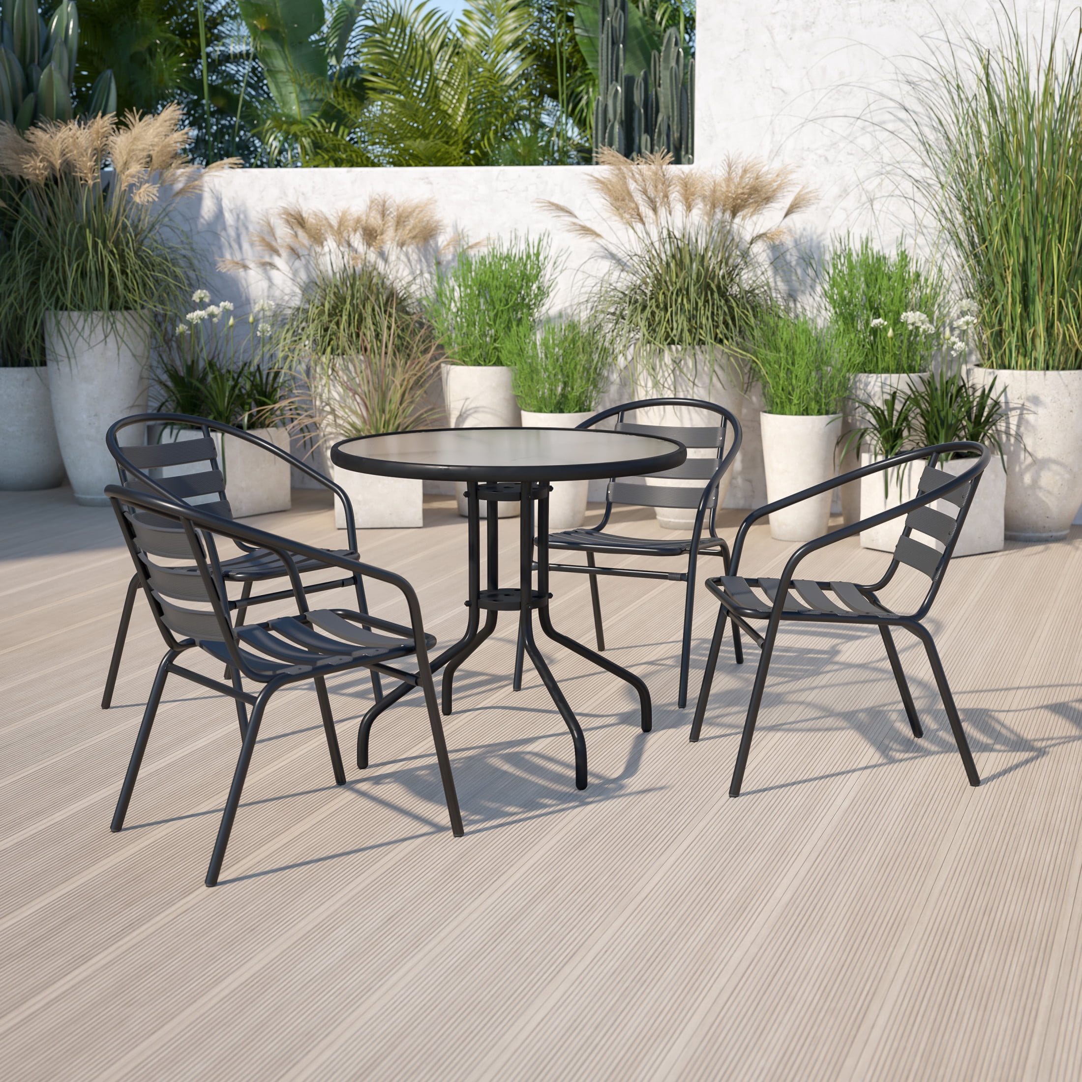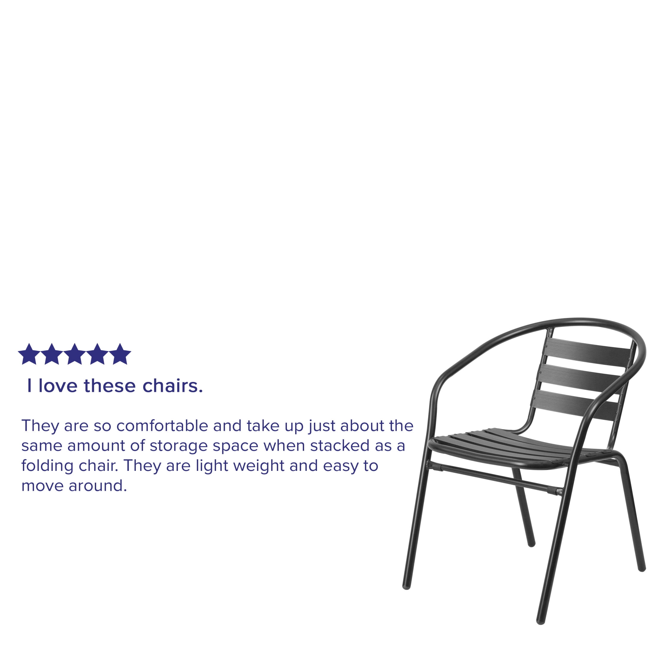 Flash Furniture Lila 4 Pack Black Metal Restaurant Stack Chair with Aluminum Slats Set of 4 Contemporary Patio Chairs for Indoor and Outdoor Use 352 lb. Weight Capacity Stack Quantity: 22 Curved Aluminum Triple Slat Back with Textured Seat to ensure safe seating Electrophoresis Process protects chair from rusting Designed for Commercial or Residential Use Floor Protector Plastic Glides Ships Fully Assembled for quick setup Lightweight Design for easy mobility and storage Stackable metal chair for patio, veranda, restaurant, café, kitchen and outdoor dining PAIR WITH A PATIO TABLE: Chairs measure 21.5″W x 24″D x 28.5″H with a 16.75″W x 14″D x 17″H seat size and 12″W x 15.5″H back size; no assembly required; pair with a glass or metal patio table to complete your setting