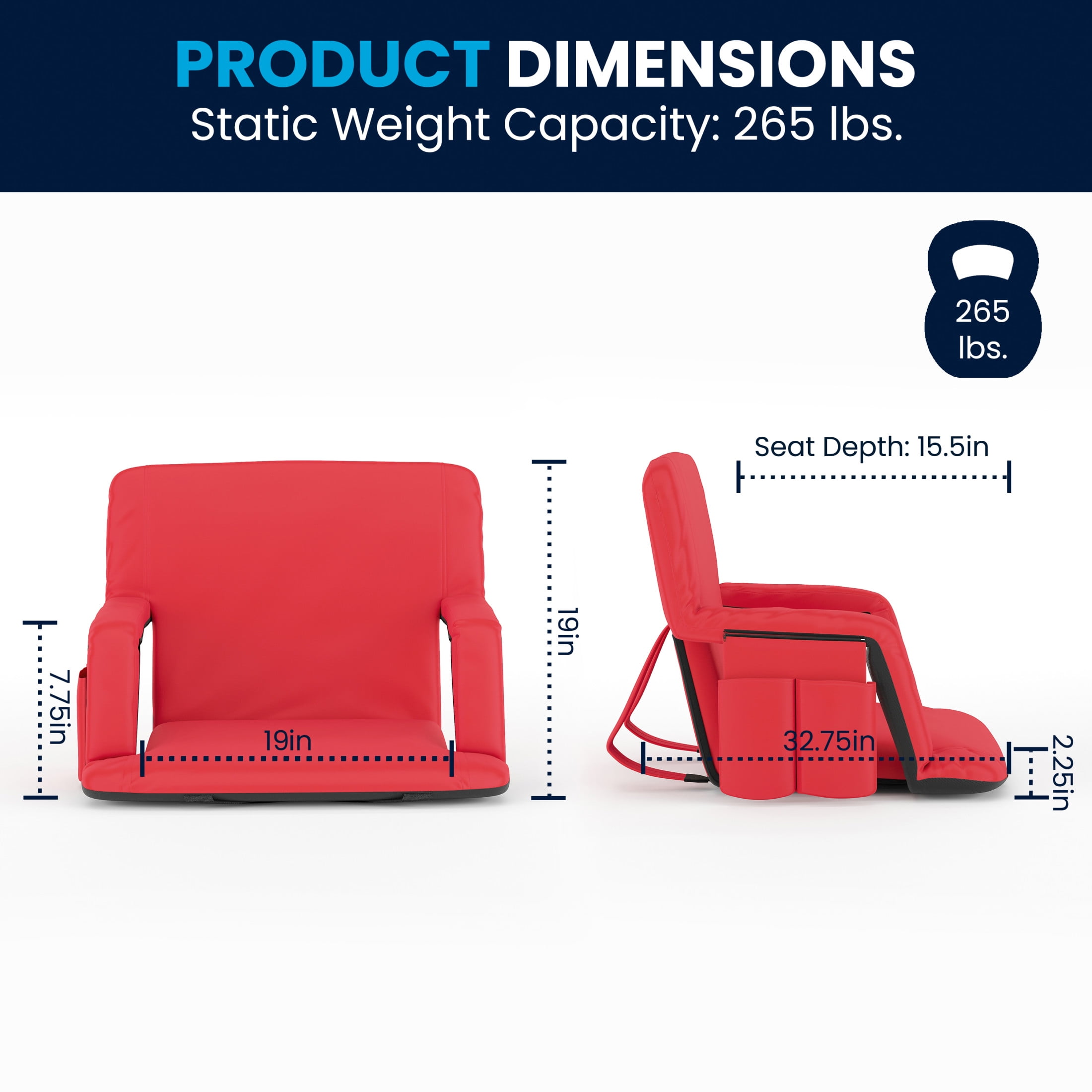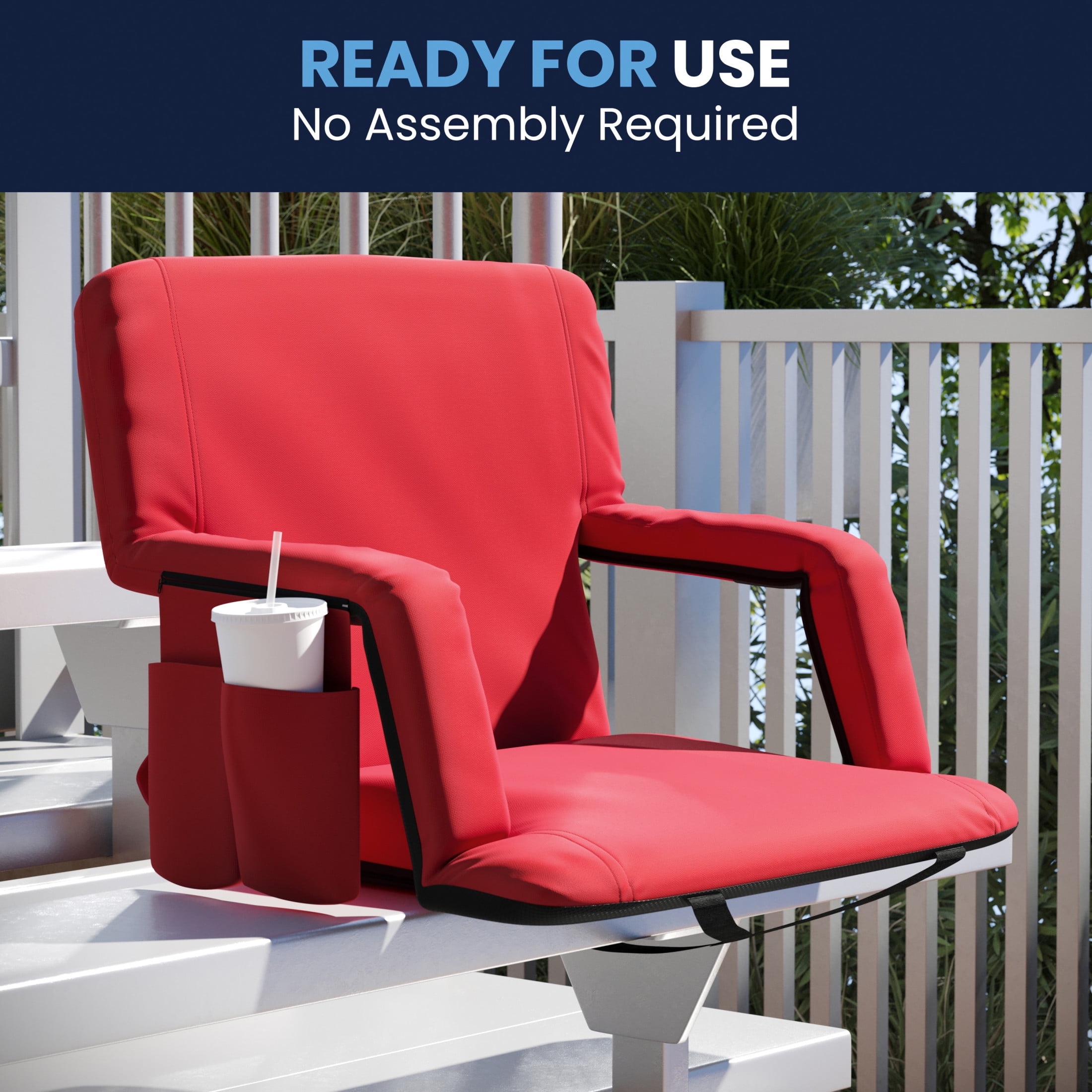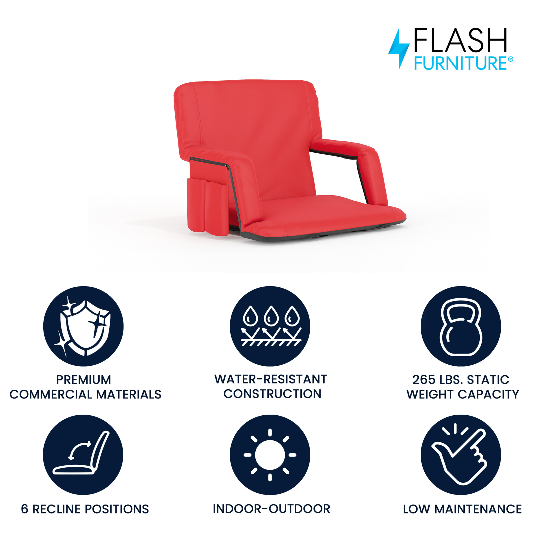 Flash Furniture Malta Collection Fabric Extra Wide Stadium Chair, Red Extra Wide Padded Stadium Bleacher Chairs with Adjustable Backpack Straps Heavy Duty Weather-Resistant Polyester Fabric & Thick Cushioned Back and Seat 24 Gauge Lightweight Metal Frame Accommodates up to 265 LBS. Static Weight 6 Recline Positions and Can Be Used With or Without Armrests Dual Side Pockets, Rear Zippered Storage, and Elastic Arm Pouch Adjustable Bleacher Straps, Gripper Bottom, and Backpack Straps for Safety and Easy Transport Backpack Size: 24.5″W x 32.75″D x 2.75″H Suitable for Indoor/Outdoor Use No Assembly Required Reclining stadium bleacher chair ideal for camping, tailgating, outdoor learning, and beach days NO ASSEMBLY REQUIRED: Measures 24.5″W x 32.75″D x 19″H when laid flat with a 19″W x 15.5″D x 2.75″H seat size and 19″W x 16″H back size, and no assembly is required