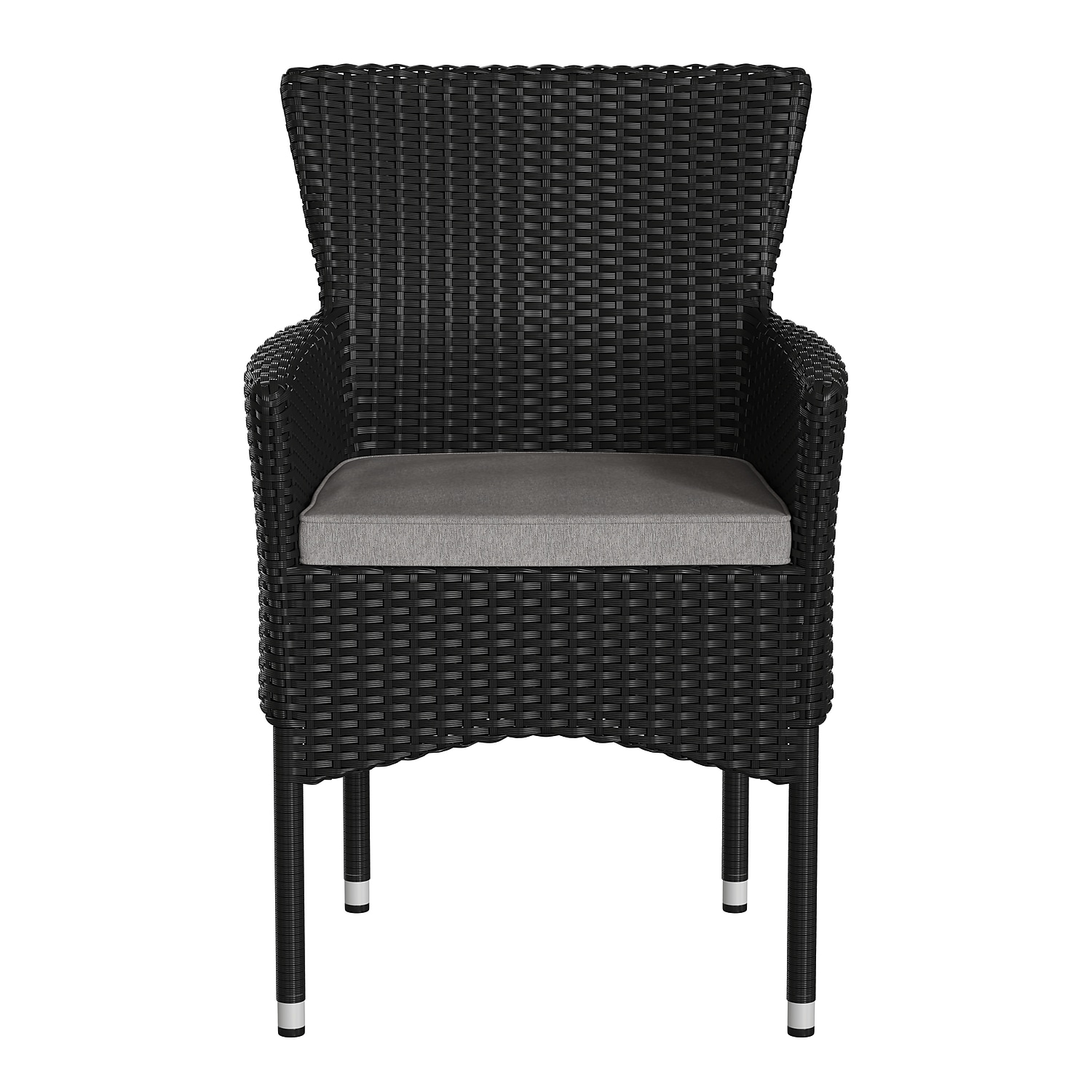 Flash Furniture Maxim Wicker Patio Armchairs Fabric, Steel, Polyester, Foam Black/Gray, Set of 2 Set of 2 modern indoor/outdoor wicker patio chairs with plush cushions Fade and weather-resistant black polyethylene wicker design Comfortable curved back and integrated armrests for added support High-density foam all-weather cushions for enhanced comfort Durable powder-coated steel frame supports up to 350 lbs. static weight Easy to clean with a damp cloth No assembly required for quick setup Perfect for use in the patio, backyard, sunroom, or dining room