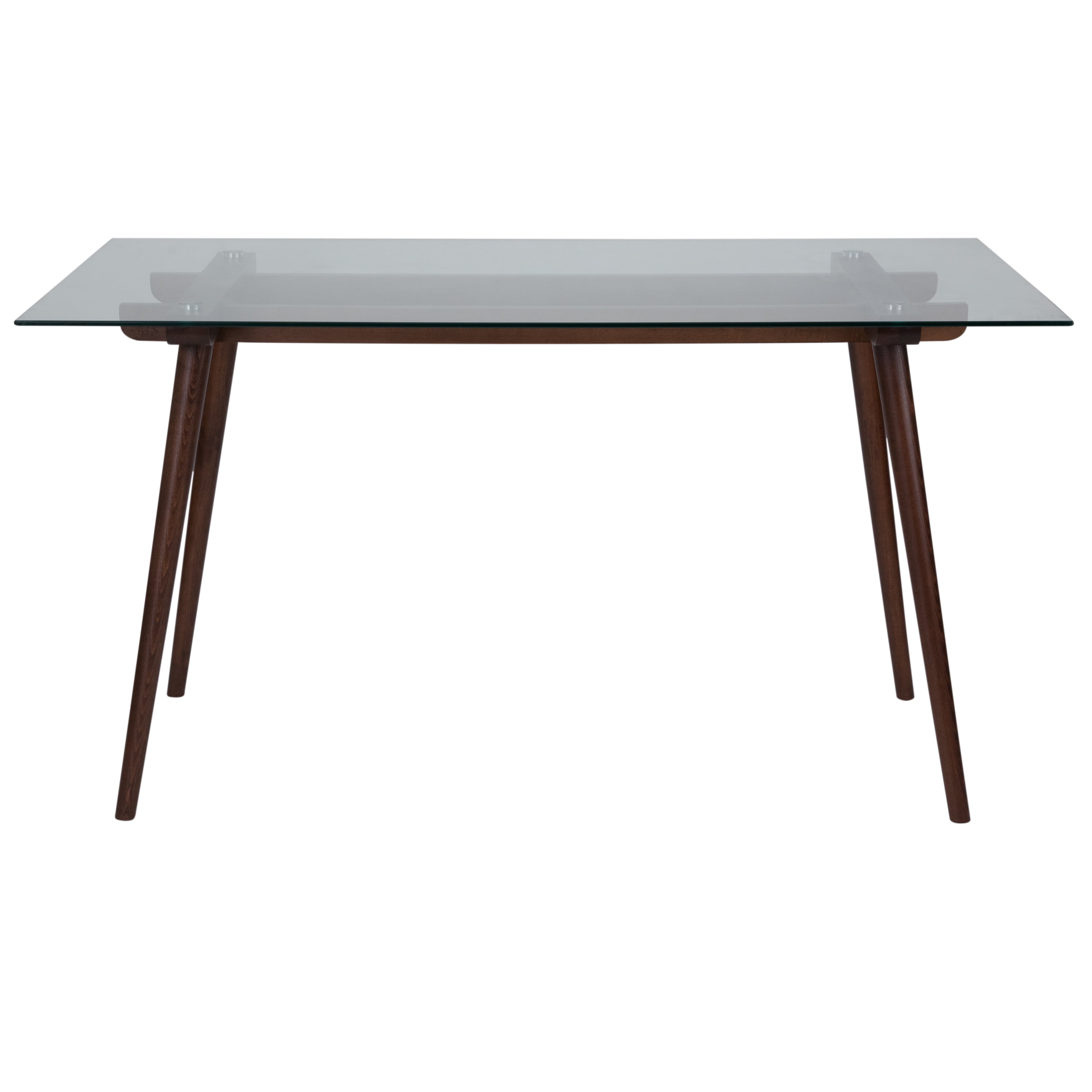When you want a modern, up to date look for your eat-in kitchen, breakfast nook or smaller dining room give this mixed media standard height dining table a try. The pairing of a clear glass top with the solid beechwood frame gives this contemporary rectangular dining table a cultivated look that will match any decor. The transparent glass top lends an open airy feel to your space and contrasts beautifully with the rich walnut finish. The sturdy beechwood frame and 8mm thick tempered glass top are ultra strong to hold up to 330 lbs. static weight capacity. Fixed glides on the feet will protect your flooring from damage due to accidental movement or when you want to rearrange your space. No need to worry about spills, this table cleans up easily with a solvent and water based cleaning agent such as foam to leave this piece looking pristine after every meal. Assembly is under 30 minutes with the included tools for quick set up and use. Gather family and friends around this chic, rectangular dining table that can seat up to 6 people for a great meal, game night or to just hang out.