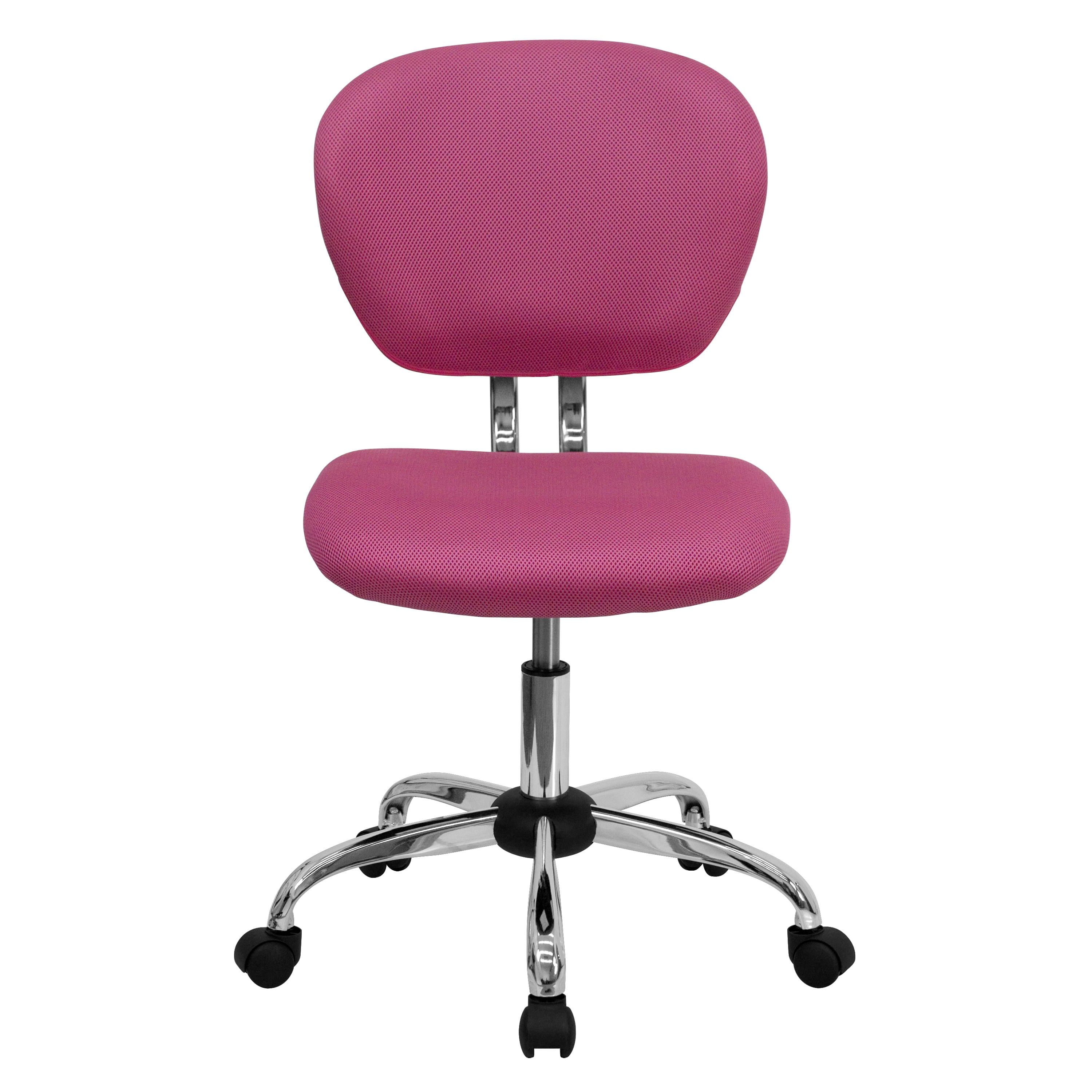 Modern Armless Task Chair Pink Mesh Upholstery Mid-Back Design Contoured Seat with CAL 117 Fire Retardant Foam 360 Degree Swivel Seat Pneumatic Seat Height Adjustment 5-Star Chrome Base with Dual-Wheel Casters Make your workplace, dorm room or kids room fun with colorful desk chairs