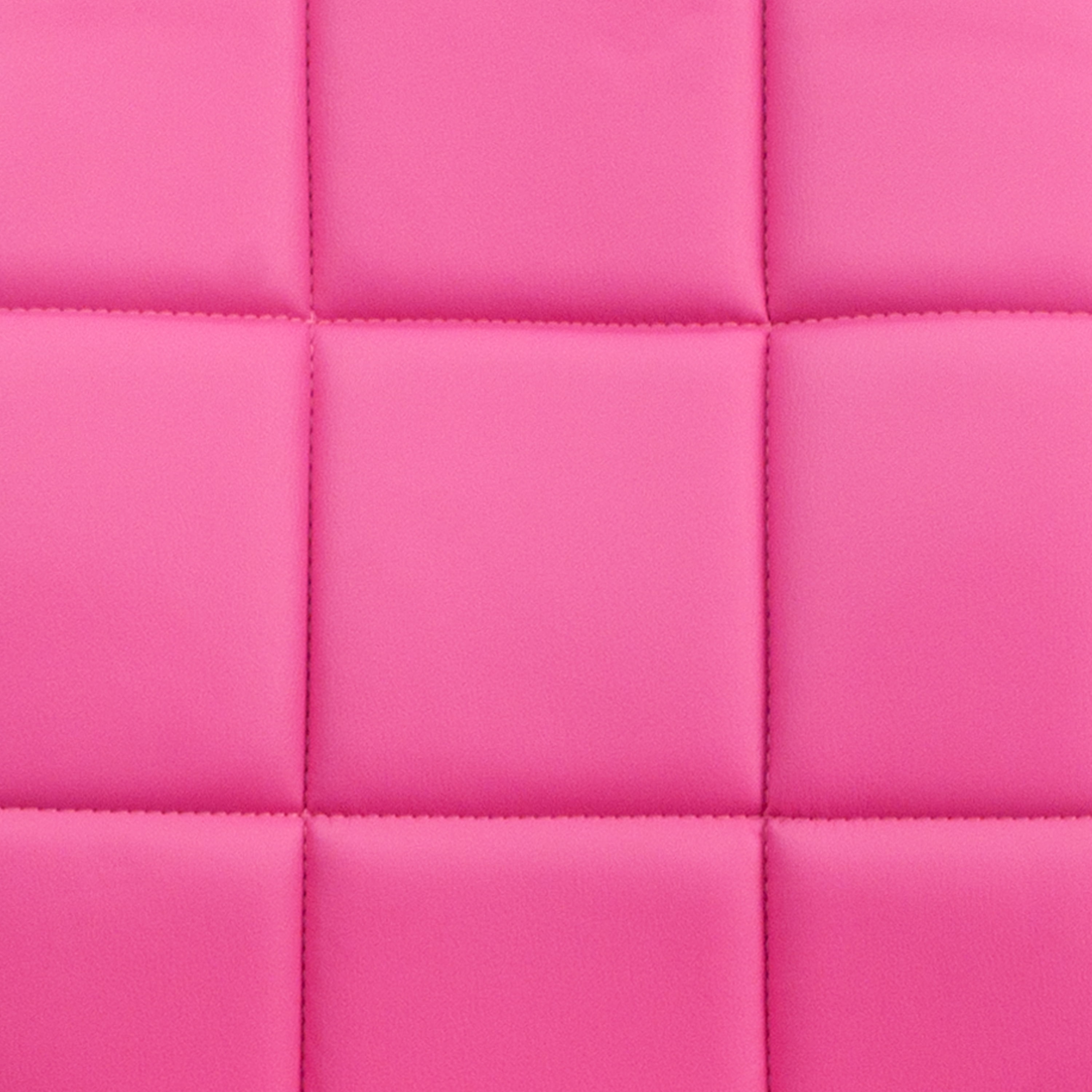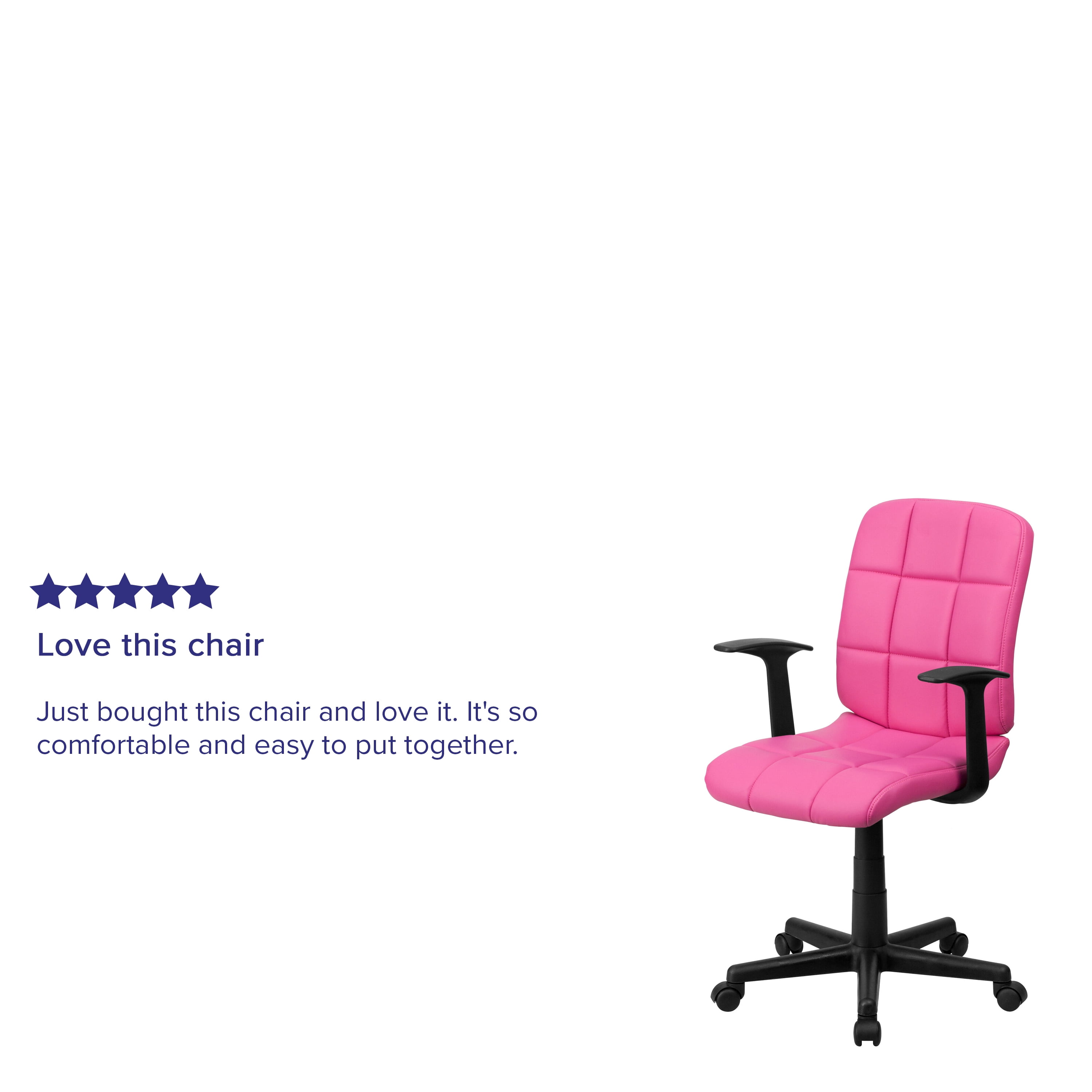 Modern Task Office Chair for professional or home offices Pink Quilted Vinyl Tufted Upholstery for a classic look Mid-Back Design supports the mid to upper back region Padded Upholstered Seat with CAL 117 Fire Retardant Foam T-Shape Arms relieve pressure from the neck and shoulders Waterfall Seat Edge reduces pressure on your legs, improves circulation 360 Degree Swivel Seat allows you to reach multiple work surfaces Pneumatic Seat Height Adjustment for a custom fit 5-Star Nylon Base with Dual-Wheel Casters provide effortless mobility Swivel task armchair perfect for use in small office spaces, home offices and dorm rooms PRODUCT MEASUREMENTS: Overall Size: 23″W x 24″D x 34-38.75″H; Seat Size: 16.5″W x 16.5″D x 16.75-21.75″H; Back Size: 16.5″W x 19″H; Arm Size: 23.5-28.5″H from floor; 7.5″H from seat