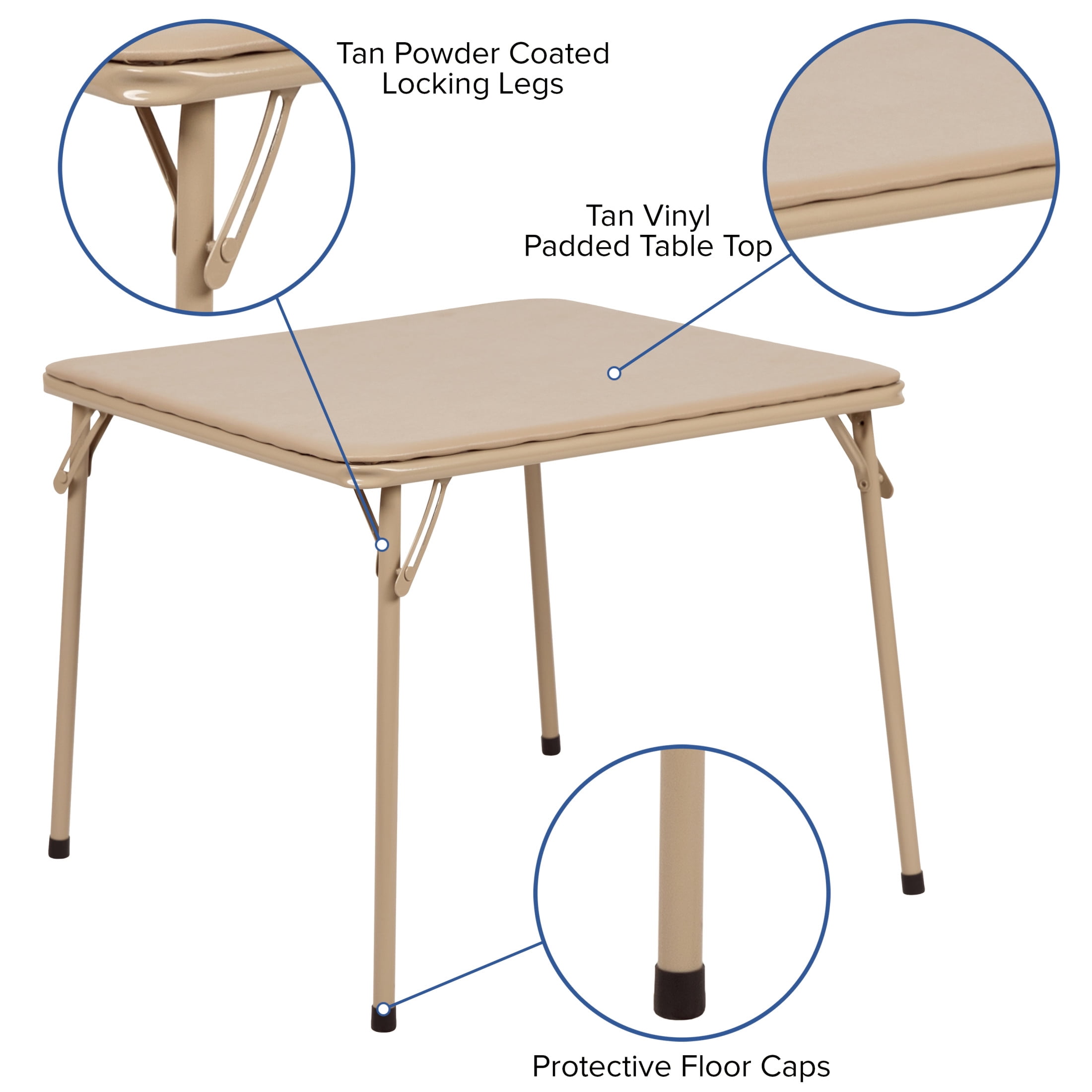 Flash Furniture Mindy Kids 5-Piece Folding Square Activity Table and Chairs Set, Tan Includes 1 square folding table and 4 folding kids chairs Recommended for preschool through first grade aged children Great for daycare centers, preschools, kitchens, bedrooms, or playrooms Folds for easy portability and compact storage Kid-friendly safety measure prevents unintended collapse Constructed from durable vinyl No assembly required; clean with a damp cloth as needed Table measures 24″ W x 24″ D x 20.25″ H; holds up to 70 lbs. Each chair measures 12.5″ W x 13.5″ D x 21.25″ H; holds up to 81 lbs. NO ASSEMBLY REQUIRED: Table measures 24″ W x 24″ D x 20.25″ H and can hold up to 70 lbs. and each chair measures 12.5″ W x 13.5″ D x 21.25″ H and can hold up to 81 lbs. of static weight