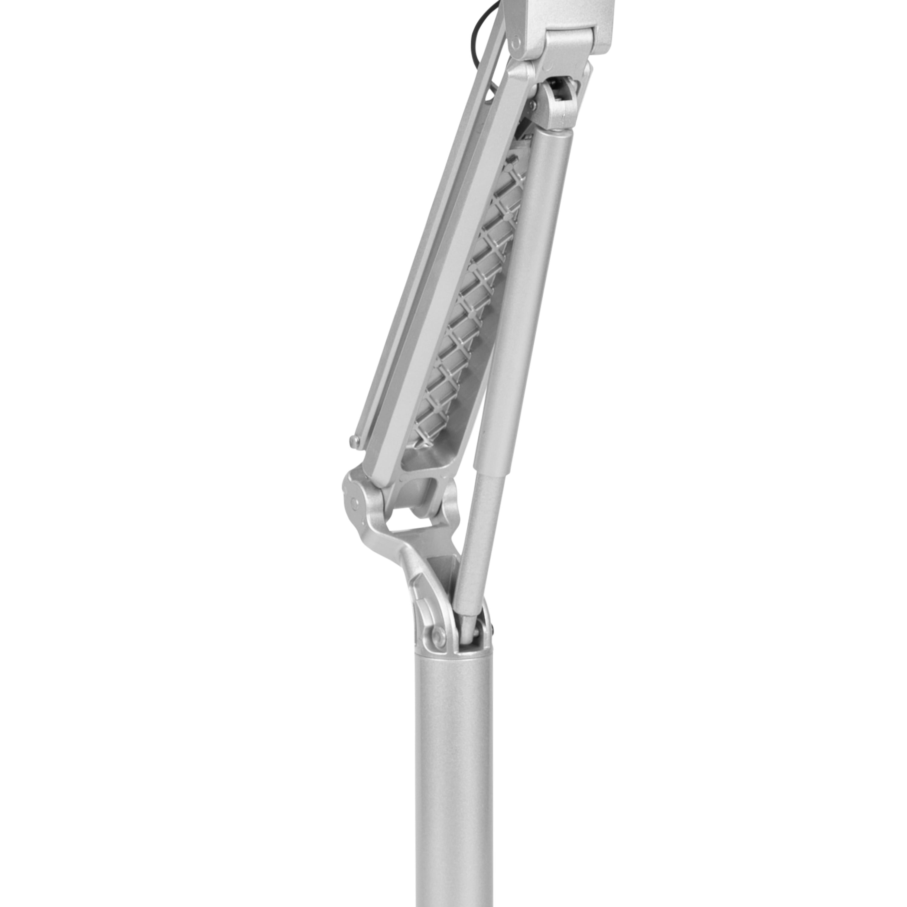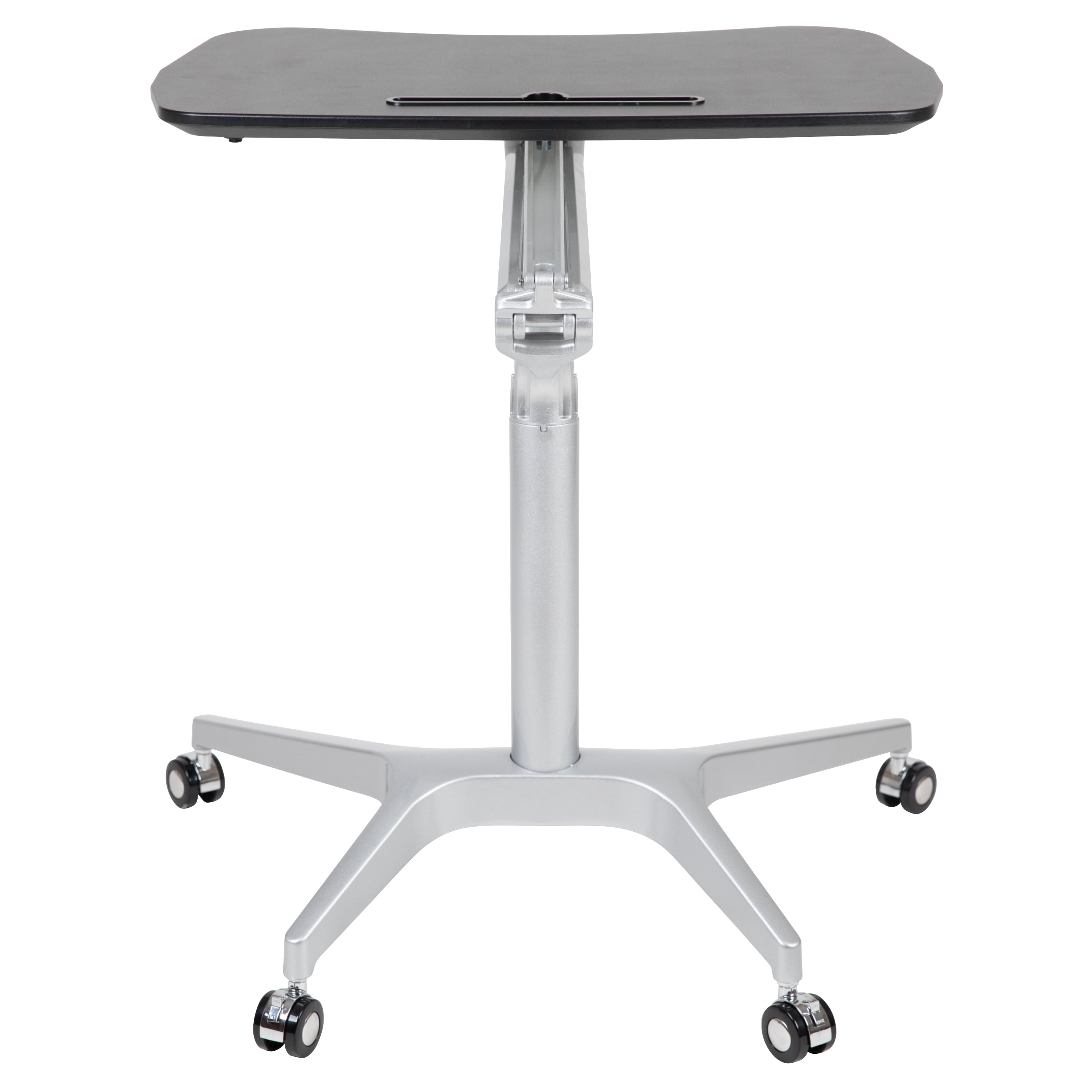 Contemporary Style Ergonomic Sit-Down and Stand-Up Desk Ideal for working on laptops Black Laminate Finish Top Size: 28.25″W x 16.75-18.5″D 1″ Thick Top Pneumatic Height Adjustable Frame Silver Powder Coat Frame Finish Dual Wheel Casters; Two Locking Base Size: 8.5-26.25″W