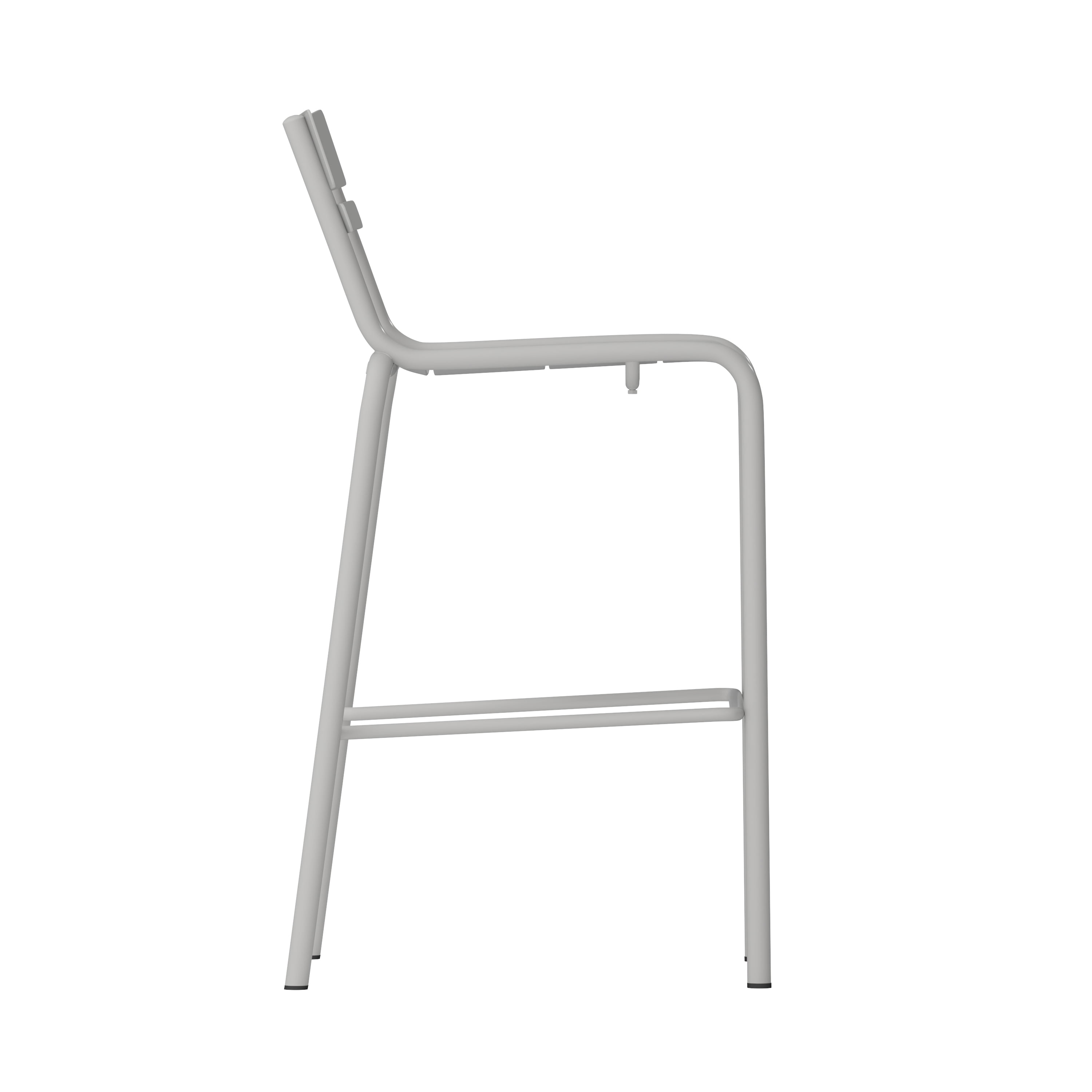 Flash Furniture Nash Commercial Grade Silver Metal Indoor-Outdoor Bar Height Stool with 2 Slats Modern Armless Commercial Grade Indoor/Outdoor Steel Stacking Bar Stool Glossy Silver Finish Ergonomically Contoured Dry Assist Slatted Back and Seat Powder Coated Steel Frame Holds up to 300 LBS. Static Weight Integrated Footrest Reduces Leg Pressure UV and Weather Resistant Recommended Stack Height up to 6 Stools Easily Wipes Clean with a Damp Cloth No Assembly Required Pairs With Other Items In The Collection PRODUCT MEASUREMENTS: Overall Size: 23.25″W x 21.5″D x 41″H; Seat Size: 15.25″W x 16.5″D x 30.25″H; Back Size: 18.75″W x 10.25″H