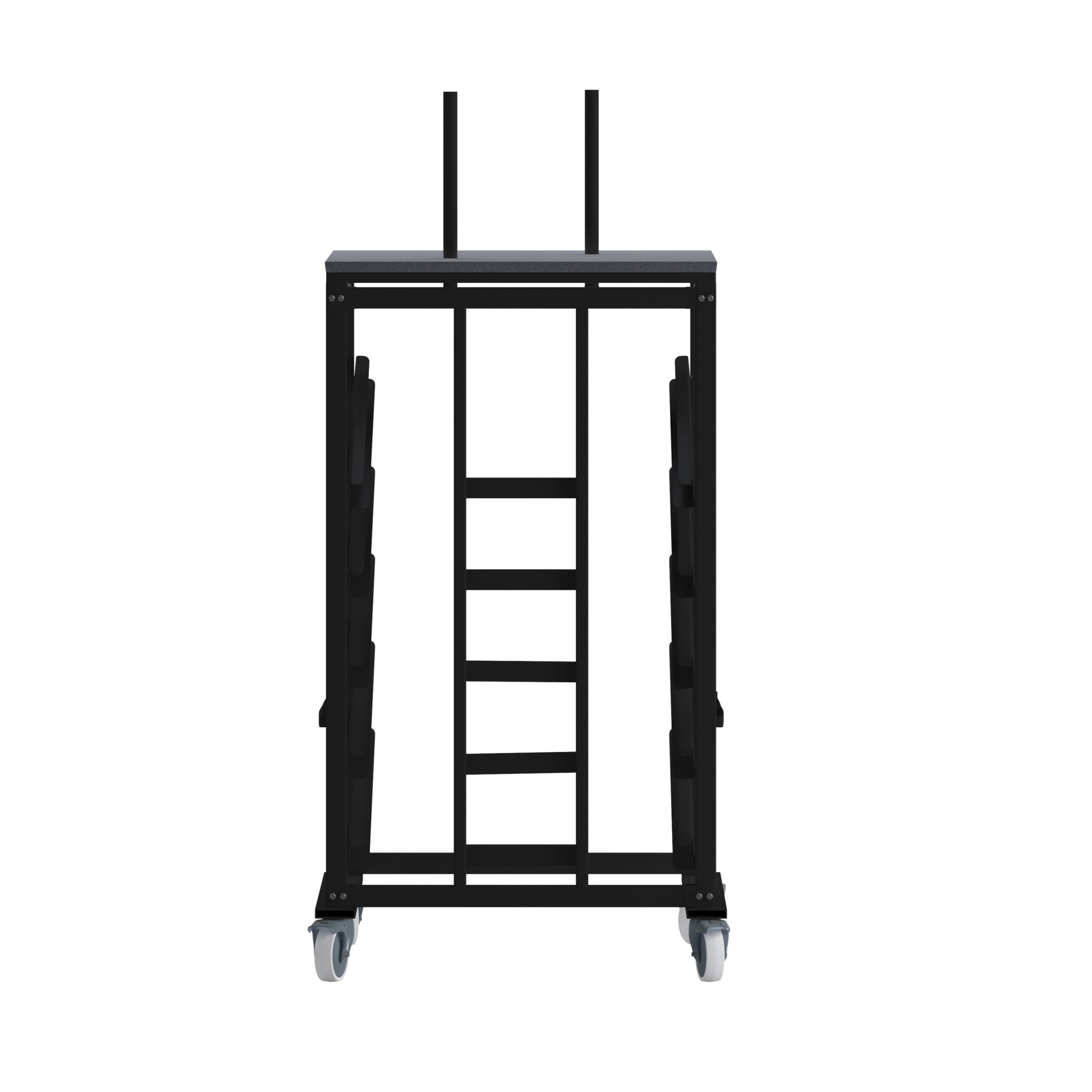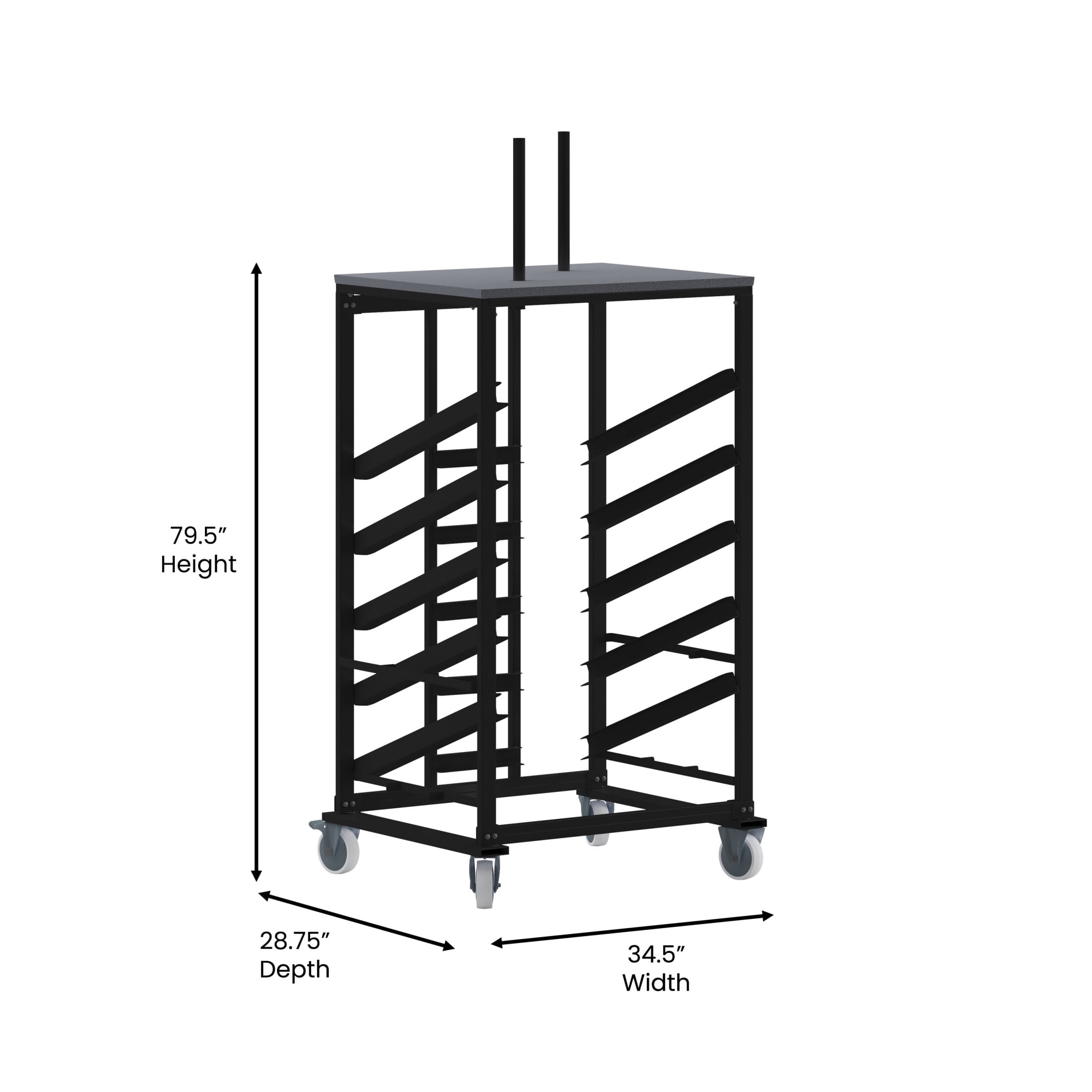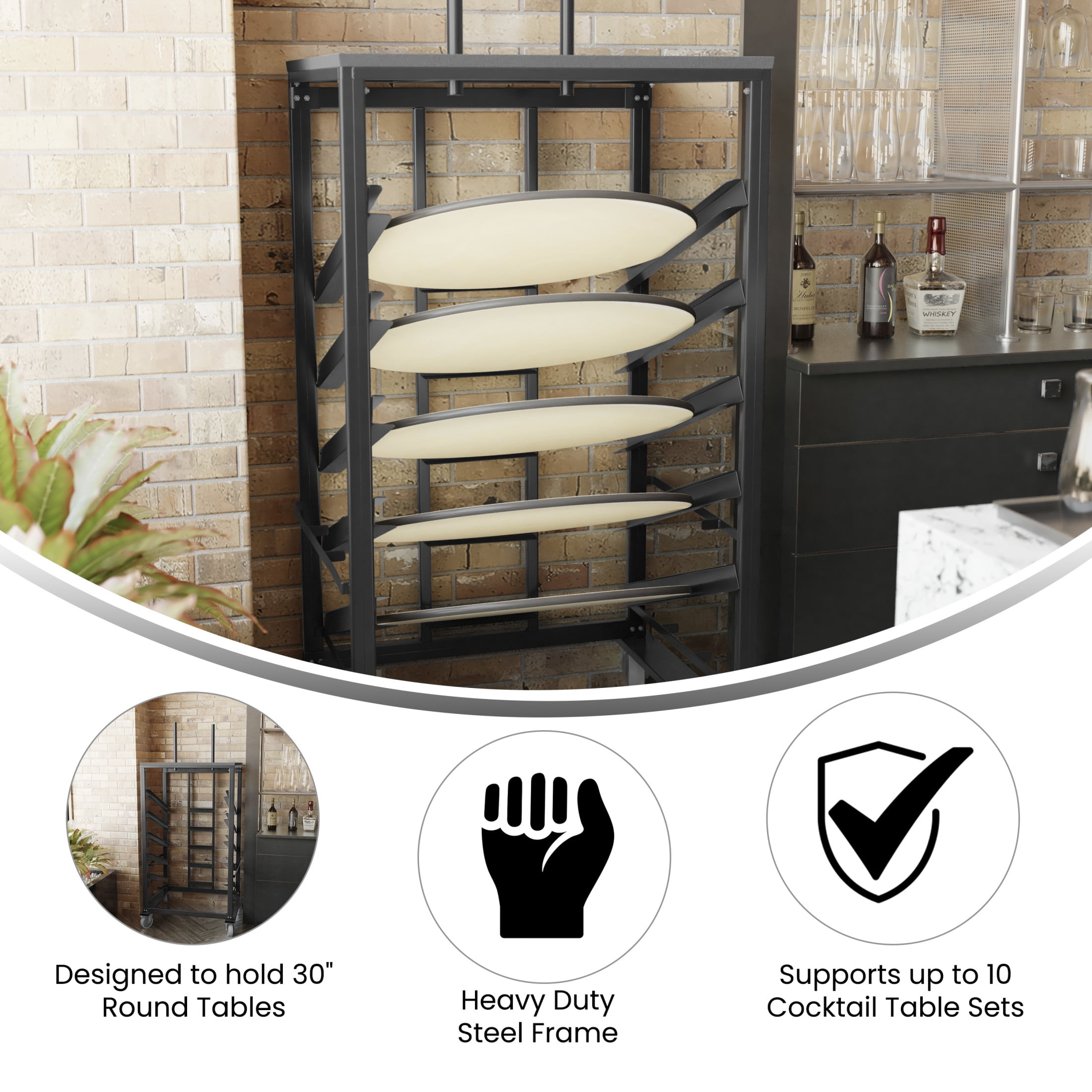 Flash Furniture Neena Cocktail Table Dolly for 30” Round Tables Pub Table Cart Designed to hold 30″ Round Tables Supports up to 10 Cocktail Table Sets 5 Sloped Shelves with stops prevent table from sliding out Carpeted Platform for bases Heavy Duty Steel Frame Black Metal Frame 5″ Rubber Casters; Two Locking Floor to Platform Top Height: 62.5″H Floor to Base Holder Height: 79.5″H PRODUCT MEASUREMENTS: Overall Size: 34.5″W x 28.75″D x 62.5-79.5″H; Floor to Platform Top Height: 62.5″H; Floor to Base Holder Height: 79.5″H