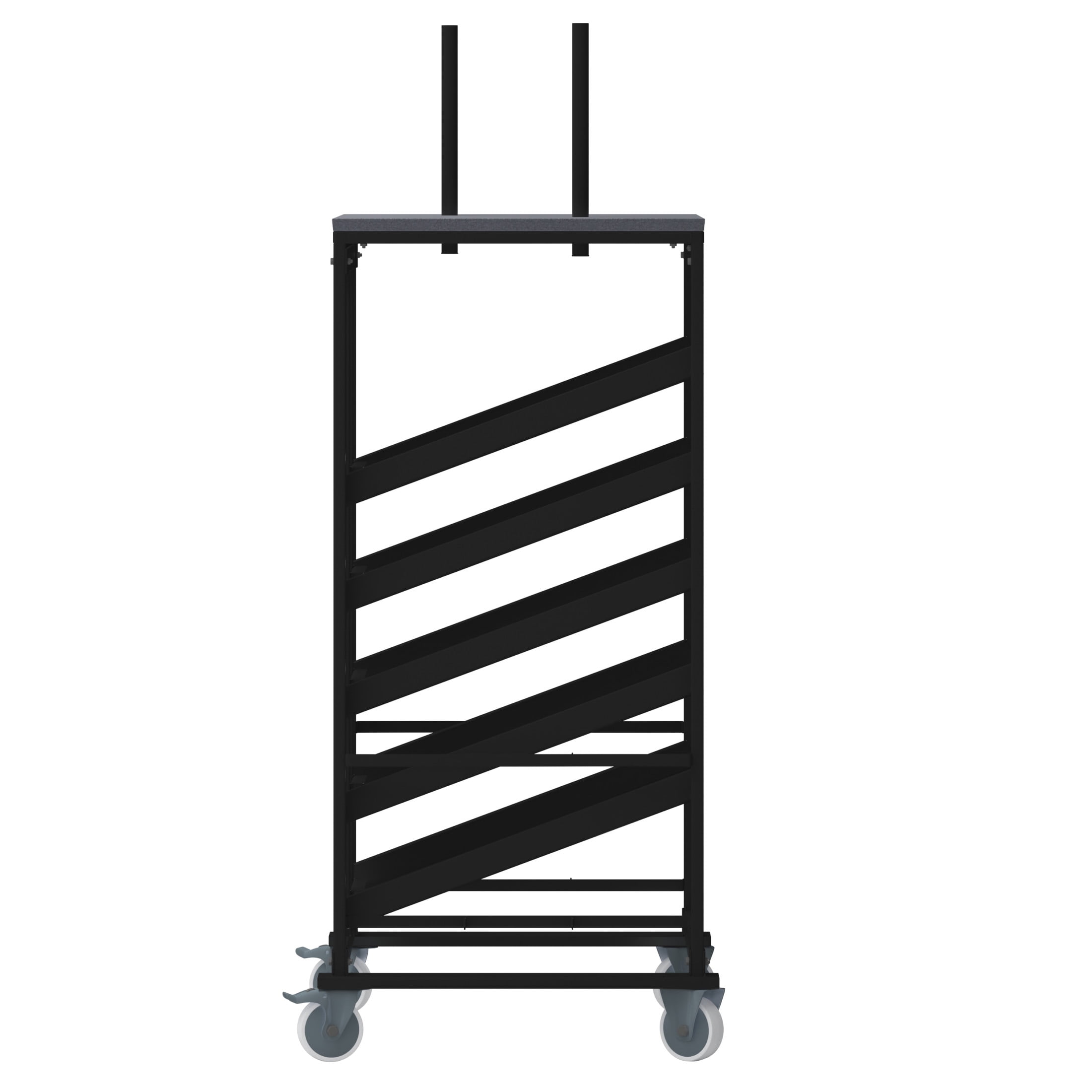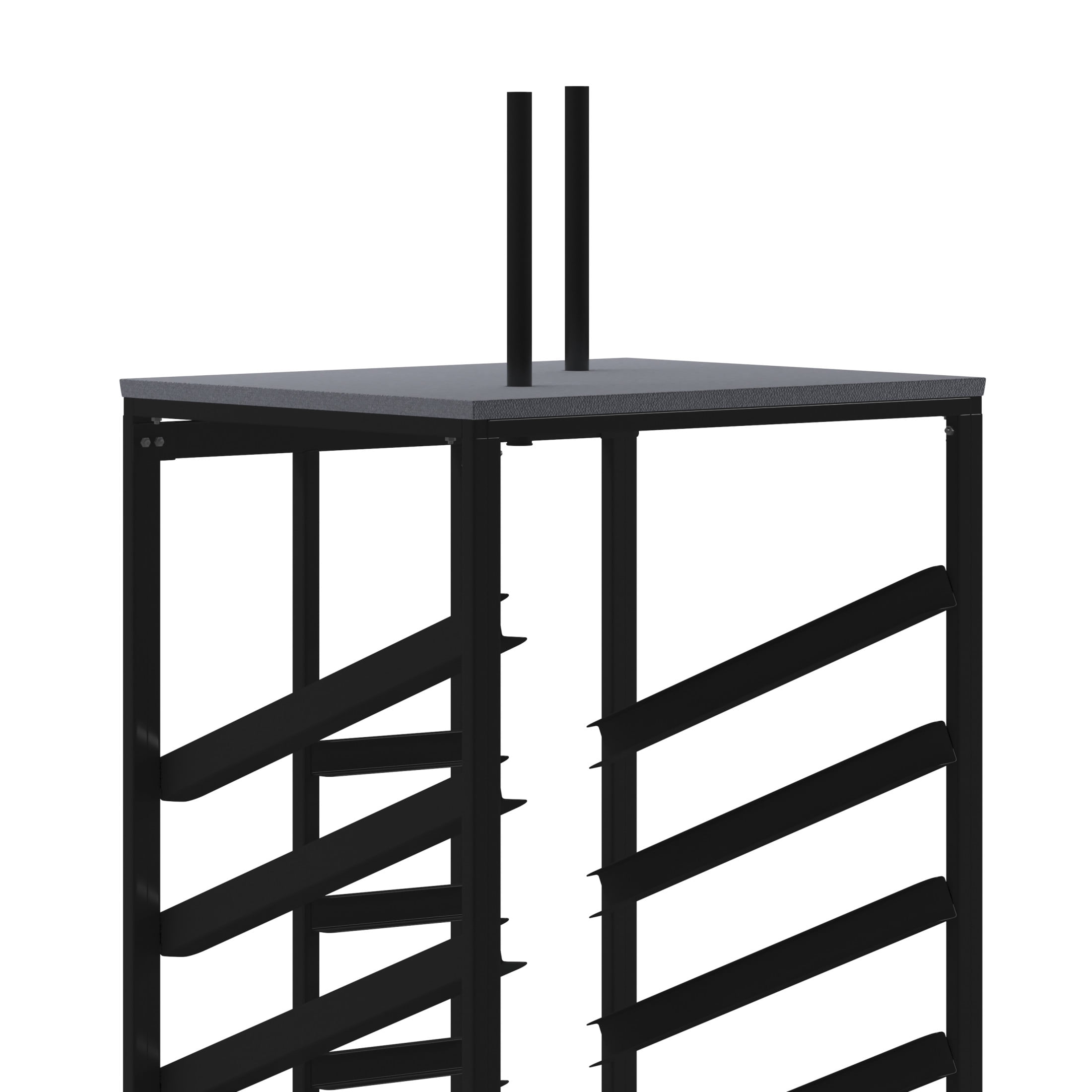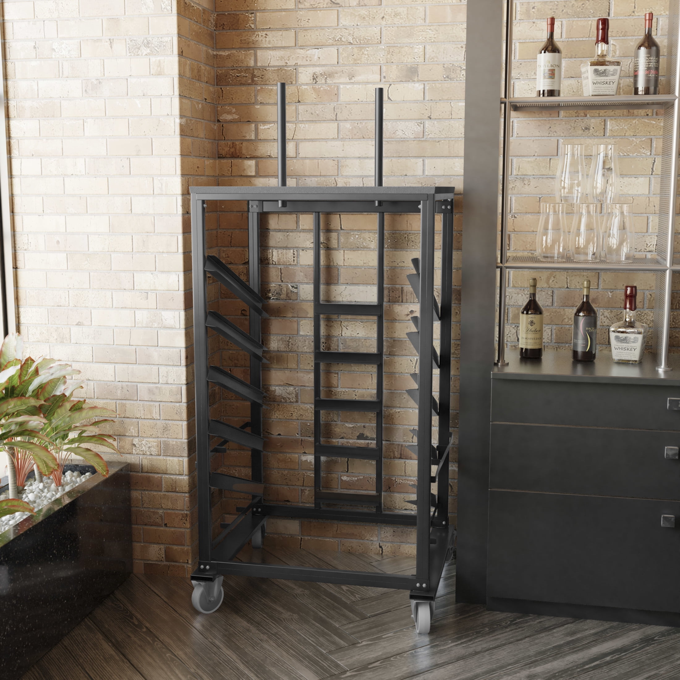 Flash Furniture Neena Cocktail Table Dolly for 30” Round Tables Pub Table Cart Designed to hold 30″ Round Tables Supports up to 10 Cocktail Table Sets 5 Sloped Shelves with stops prevent table from sliding out Carpeted Platform for bases Heavy Duty Steel Frame Black Metal Frame 5″ Rubber Casters; Two Locking Floor to Platform Top Height: 62.5″H Floor to Base Holder Height: 79.5″H PRODUCT MEASUREMENTS: Overall Size: 34.5″W x 28.75″D x 62.5-79.5″H; Floor to Platform Top Height: 62.5″H; Floor to Base Holder Height: 79.5″H