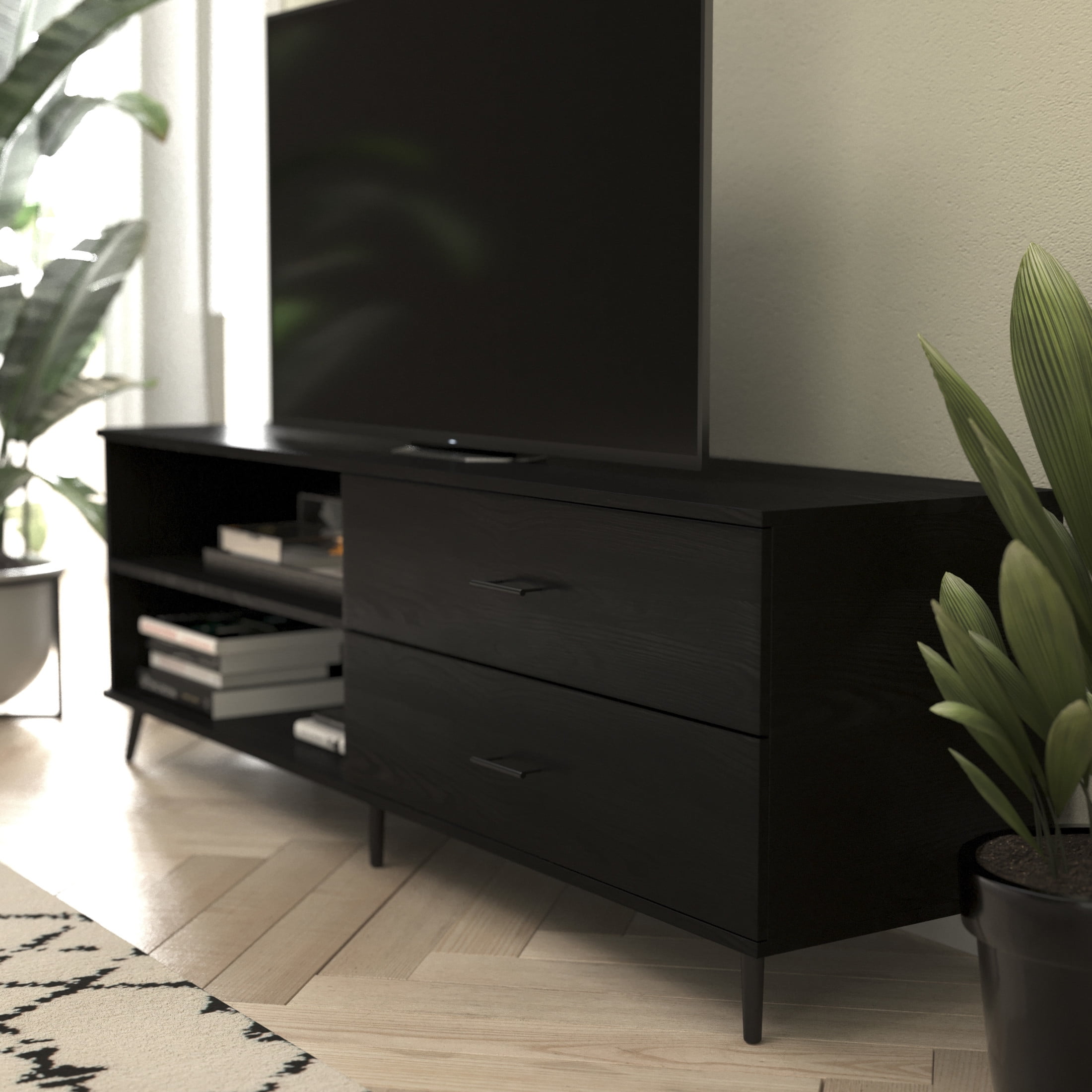Flash Furniture Nelson Mid-Century Televison Stand for TVs up to 60″,Black Mid-Century Modern 65 Inch TV stand with Storage Drawers Sleek Black Wood Grain Finish Open Display Area with Adjustable Shelf Holds up to 25 LBS. Static Weight Dual Storage Drawers Hold up to 25 LBS. Static Weight Each Wire Management Holes Keep Wires Neat and Tidy Console Constructed From Premium Engineered Wood and Holds up to 100 LBS. Static Weight Accommodates up to 60 Inch TV’s Flared Steel Legs with Fixed Floor Glides to Protect Flooring Surfaces Assembles in 60 Minutes or Less with Included Tools Wipes Clean with a Damp Cloth PRODUCT MEASUREMENTS: Overall Size: 65″W x 15.25″D x 22.5″H; Drawer Size (2): 29.5 x 13.75 x 4.25; Shelf Size: 30.5 x 14; Height Between Shelves: 6.5″ – 8.75″