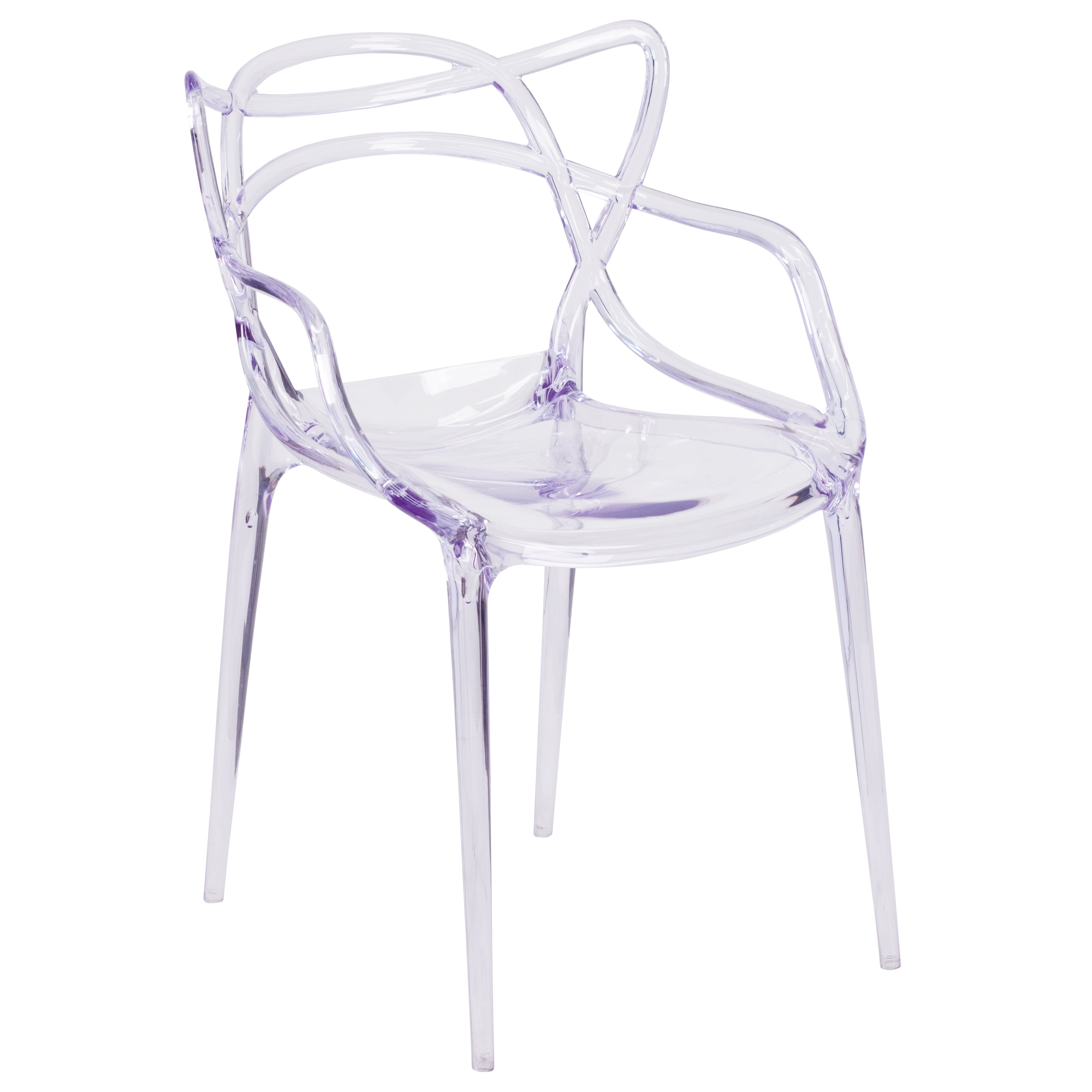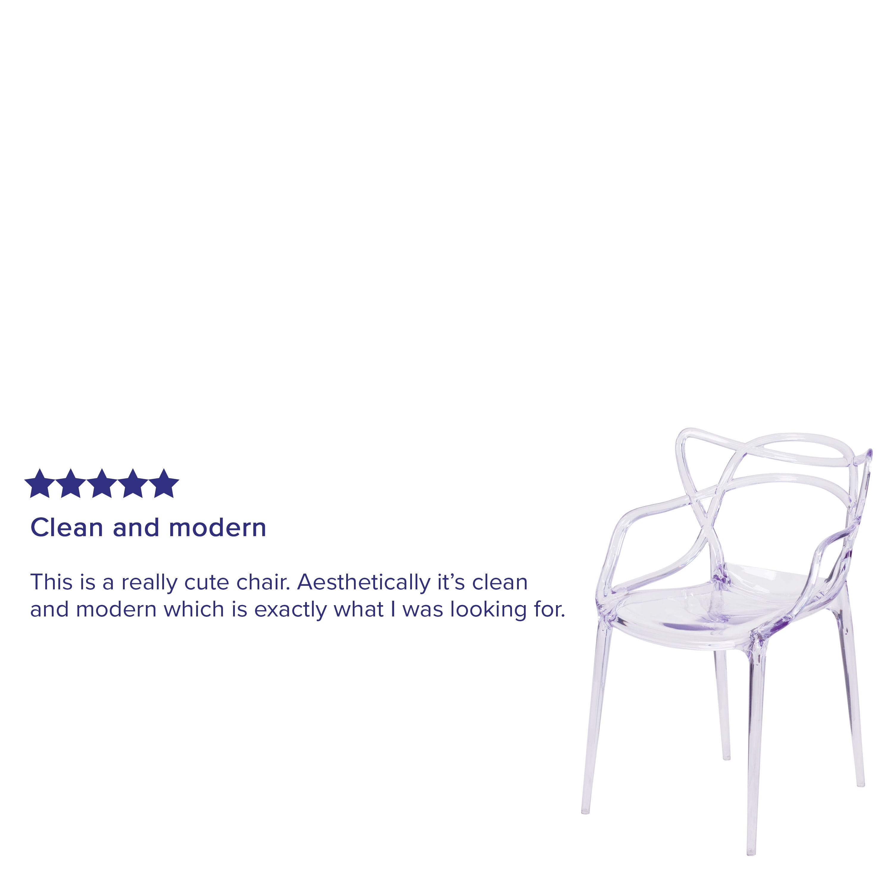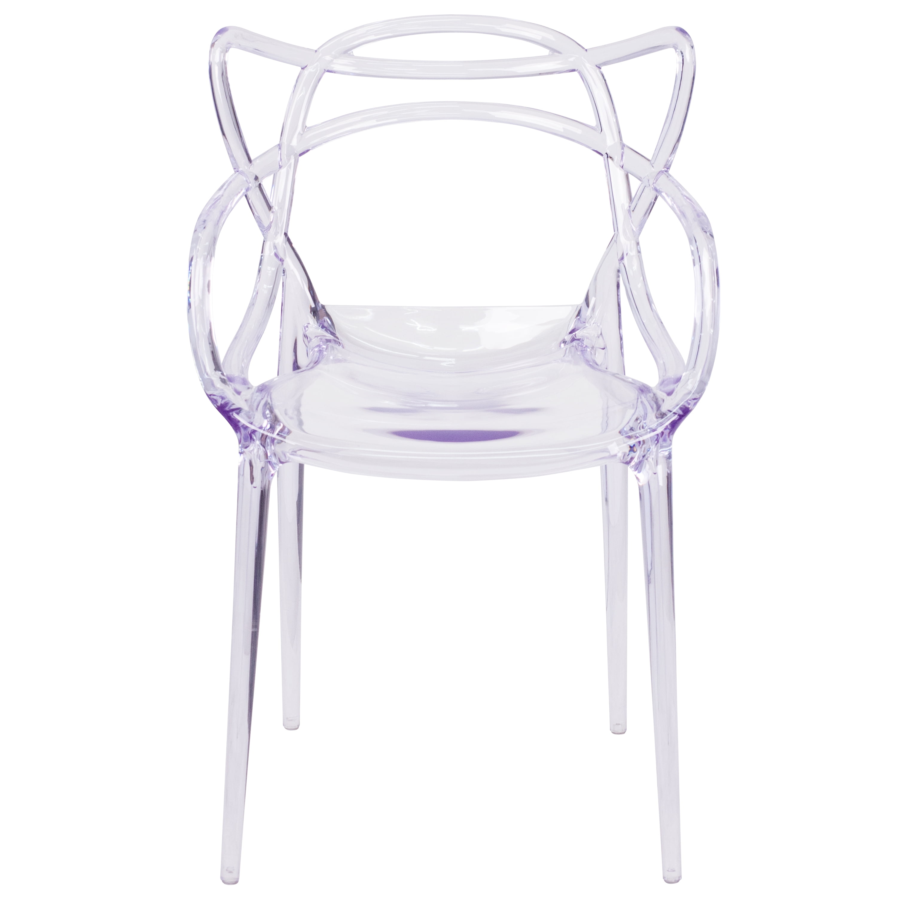 Stackable Accent Chair with Designer Back Stack Quantity: 8 Transparent Crystal Finish Integrated Arms Artistic Design Polycarbonate Molded Structure Waterfall Seat reduces pressure on your legs Floor Protector Rubber Glides Suitable for Outdoor Use Designed for Commercial Use