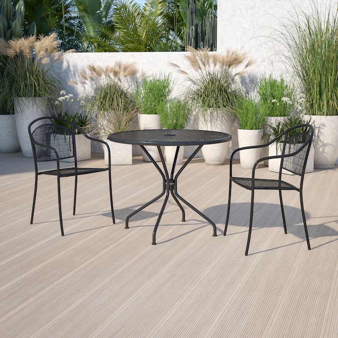 Brighten up your patio space with this beautiful black patio table. The rain flower printed top is very appealing. With the included umbrella hole, you can purchase your desired umbrella to shield you from the sun. This table will enhance your bistro, cafe, restaurant, hotel or home patio space. The table was designed for all-weather use making it a great option for indoor and outdoor settings. For longevity, care should be taken to protect from long periods of wet weather. Pair this table with our rain flower design chairs to complete the look.