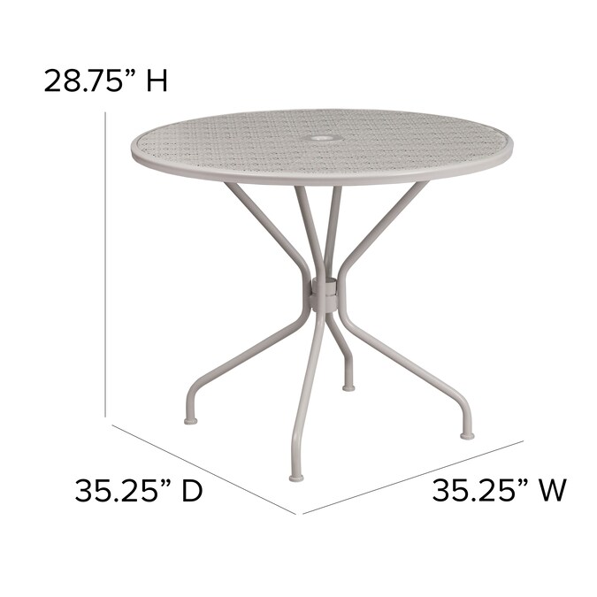 Brighten up your patio space with this beautiful silver patio table. The rain flower printed top is very appealing. With the included umbrella hole, you can purchase your desired umbrella to shield you from the sun. This table will enhance your bistro, cafe, restaurant, hotel or home patio space. The table was designed for all-weather use making it a great option for indoor and outdoor settings. For longevity, care should be taken to protect from long periods of wet weather. Pair this table with our rain flower design chairs to complete the look.