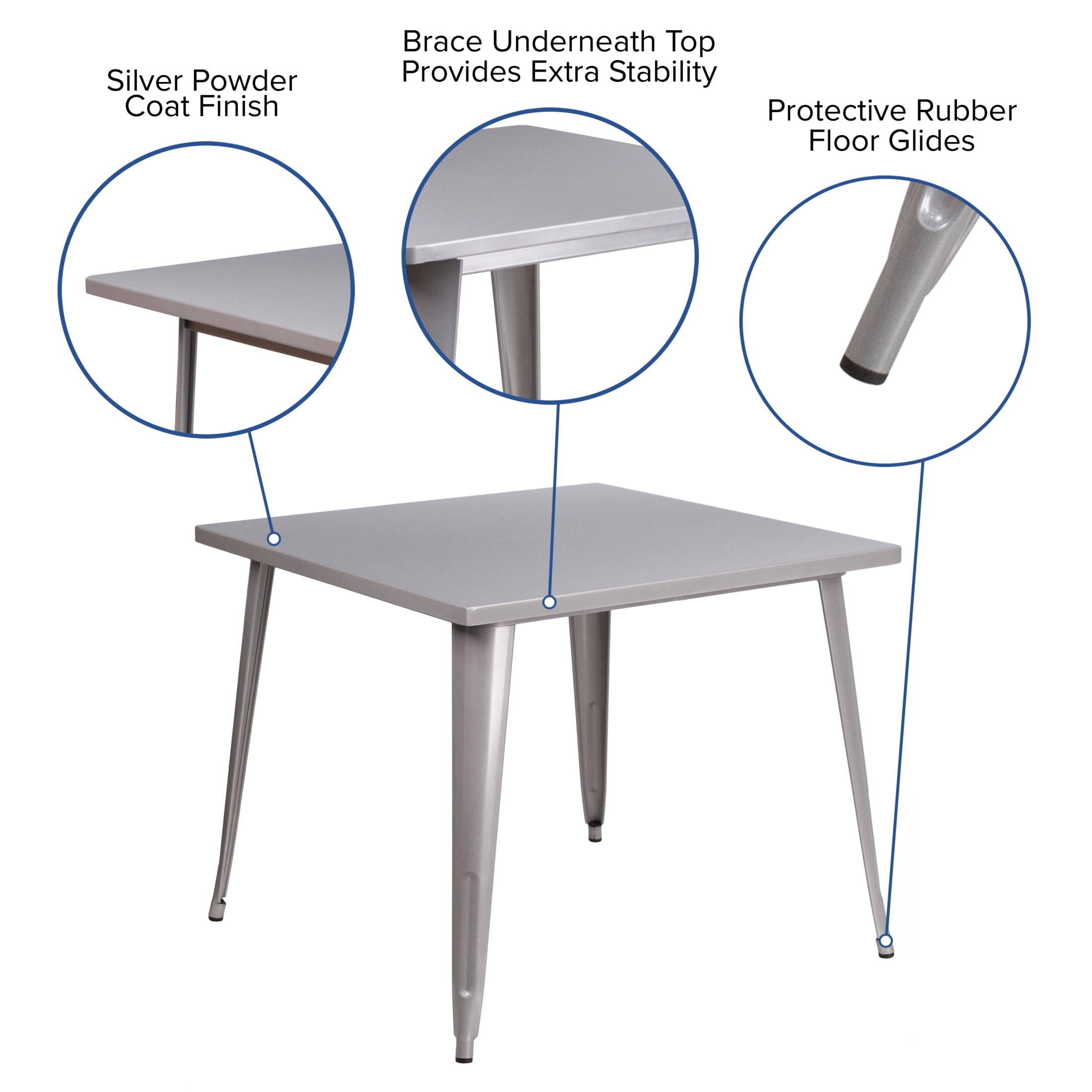 Flash Furniture Parker Commercial Grade 35.5″ Square Silver Metal Indoor-Outdoor Table Metal Cafe Table Top Size: 35.5″ Square Base Size: 35.25″W Smooth Top with 1.25″ Thick Edge Silver Powder Coat Finish Brace underneath top provides extra stability Protective Rubber Floor Glides Designed for Indoor and Outdoor Use Designed for Commercial and Residential Use PRODUCT MEASUREMENTS: Overall Size: 35.5″W x 35.5″D x 29.75″H