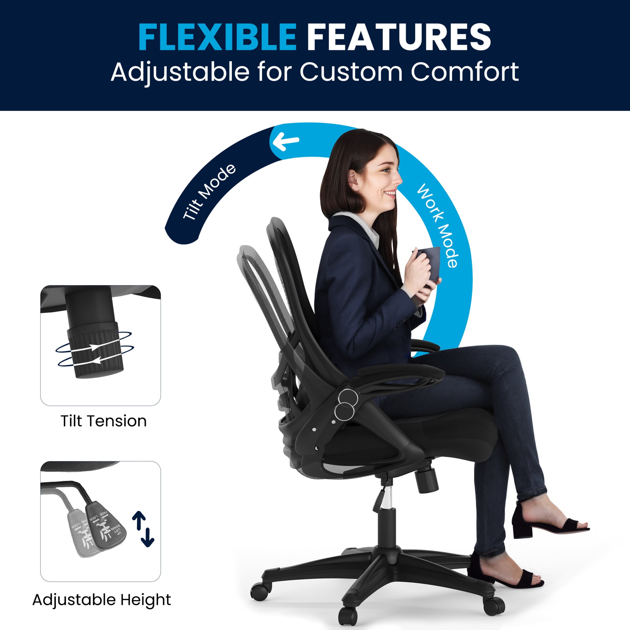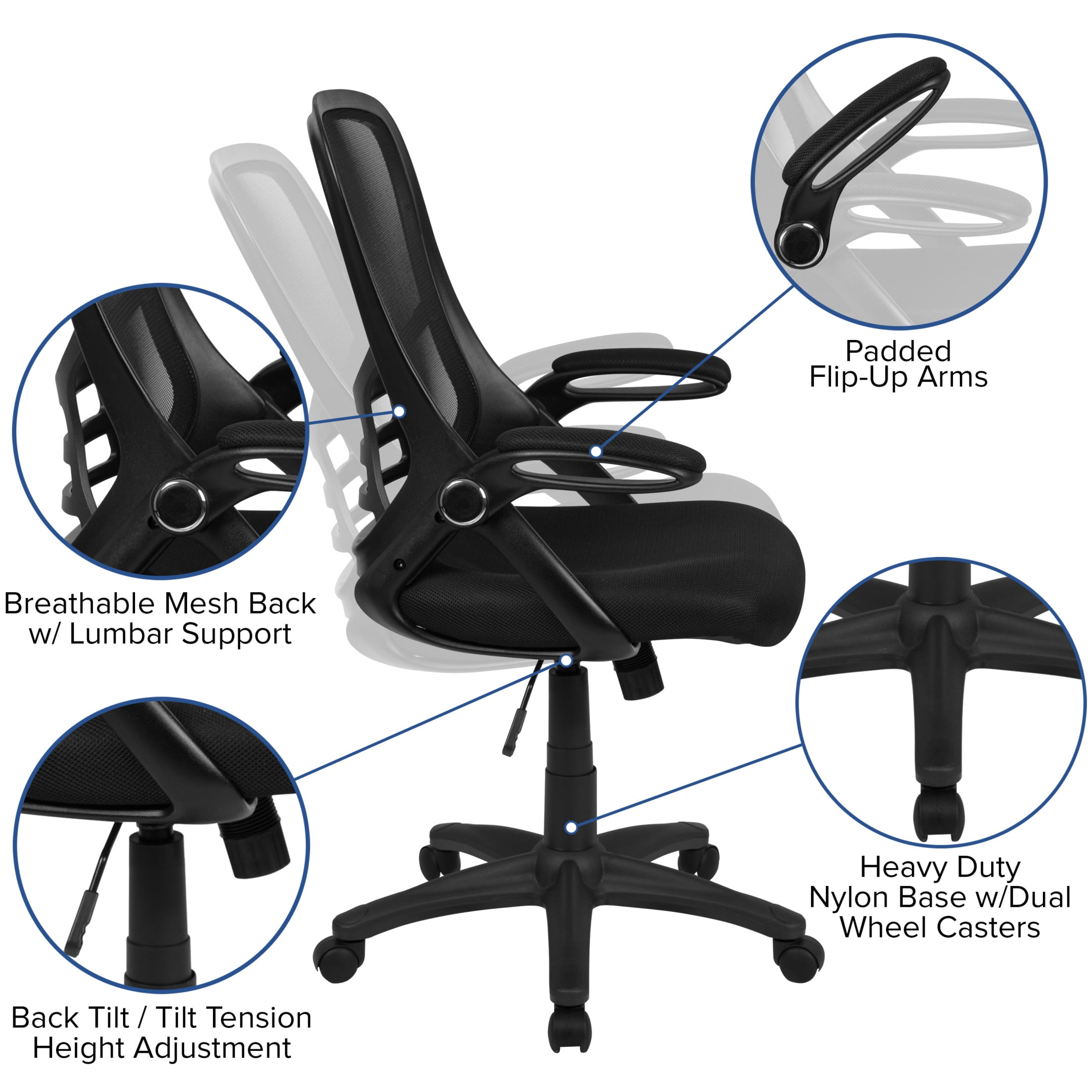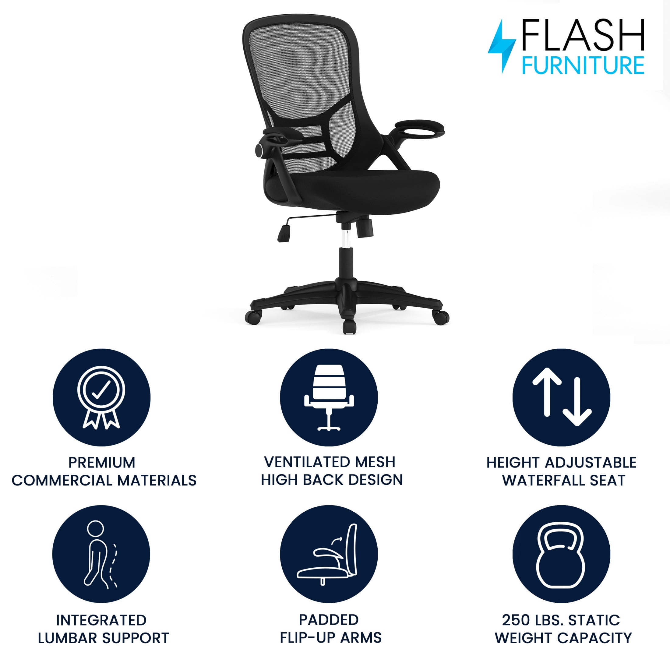 Flash Furniture Porter Ergonomic Mesh High-Back Swivel Office Chair with Flip-Up Armrests, Black Great for front offices, executive suites, at-home work desks, and college dorm rooms Ventilated high mesh back with integrated lumbar support Comfortable padded contoured waterfall seat Pneumatic height adjustable seat swivels 360 degrees Convenient tilt lock with 120-degree tilt tension Flip-up arms provide ease of access 5-star base with dual casters Easy to assemble in less than 30 minutes with step-by-step instructions Overall size: 26.5″ W x 26.5″ D x 40.25-44″ H PRODUCT MEASUREMENTS: Overall Size: 26.5″W x 26.5″D x 40.25-44″H; Seat Size: 20″W x 20.5″D x 18.5-22.5″H; Back Size: 19″W x 23″H; Arm Size: 26-30″H from floor; 7.5″H from seat