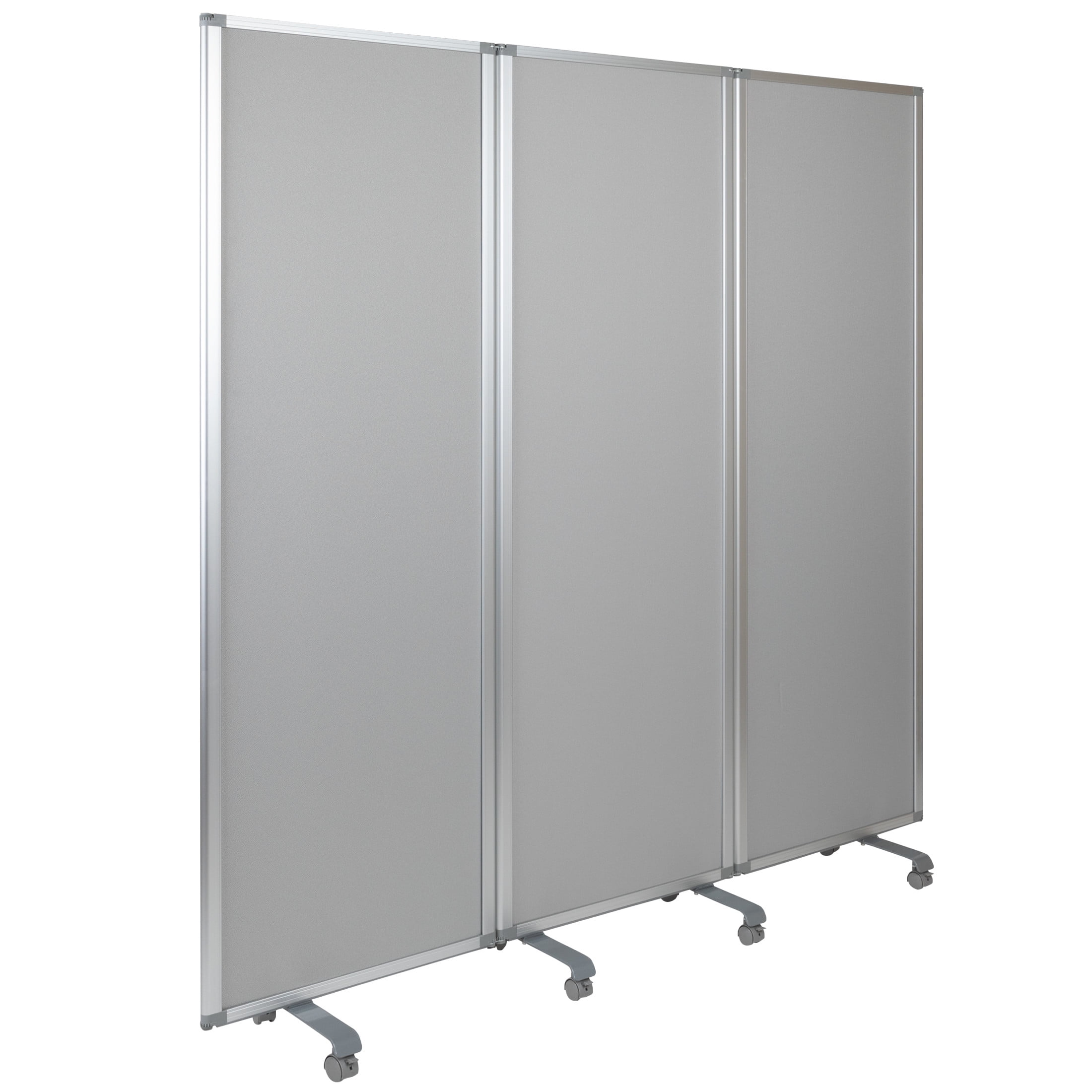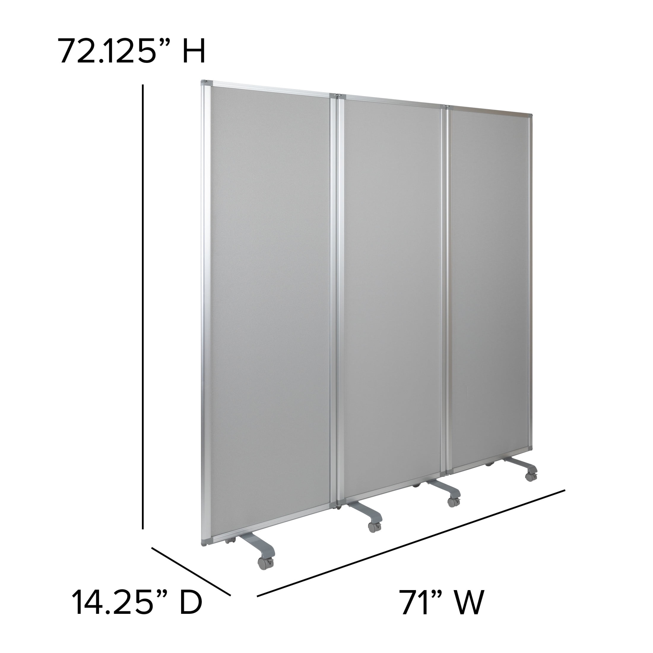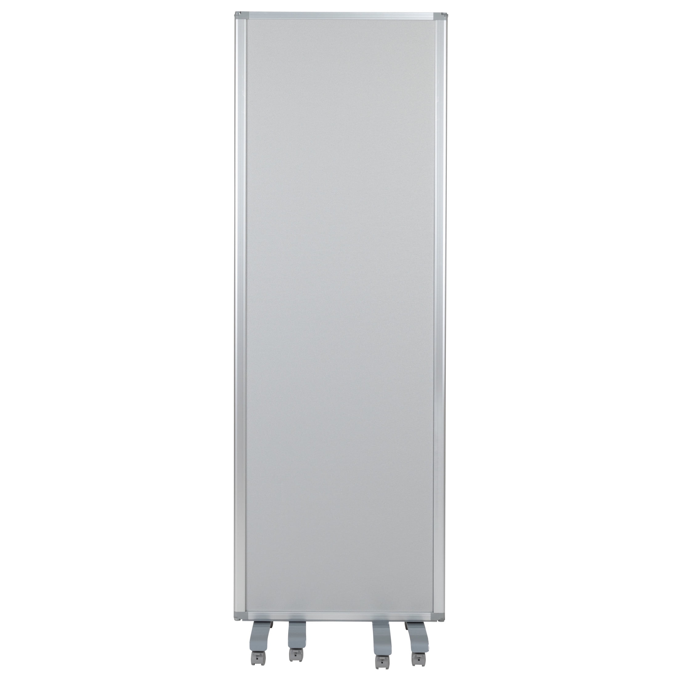 Flash Furniture Raisley Double Sided Mobile Magnetic Whiteboard/Cloth Partition with Lockable Casters, 72″H x 24″W (3 sections included) Room Divider Marker Board with Foldable Sections Whiteboard Surface accepts magnets to display written notes Fabric Partition is tackable to post notes with push pins Board Size: 21″W x .875″D x 66.5″H Folded Size: 23.75″W x 2.625″D x 72.125″H Aluminum Border Enclosure Dual-Wheel Locking Casters Dry erase board privacy screen for office, classroom, or remote learning environment EFFICIENT SIZE: Measures 23.75-71″W x 0.875-13.875″D x 72.125″H when open to fit neatly in any classroom or office and 23.75″W x 2.625″D x 72.125″H when folded for easy, compact storage