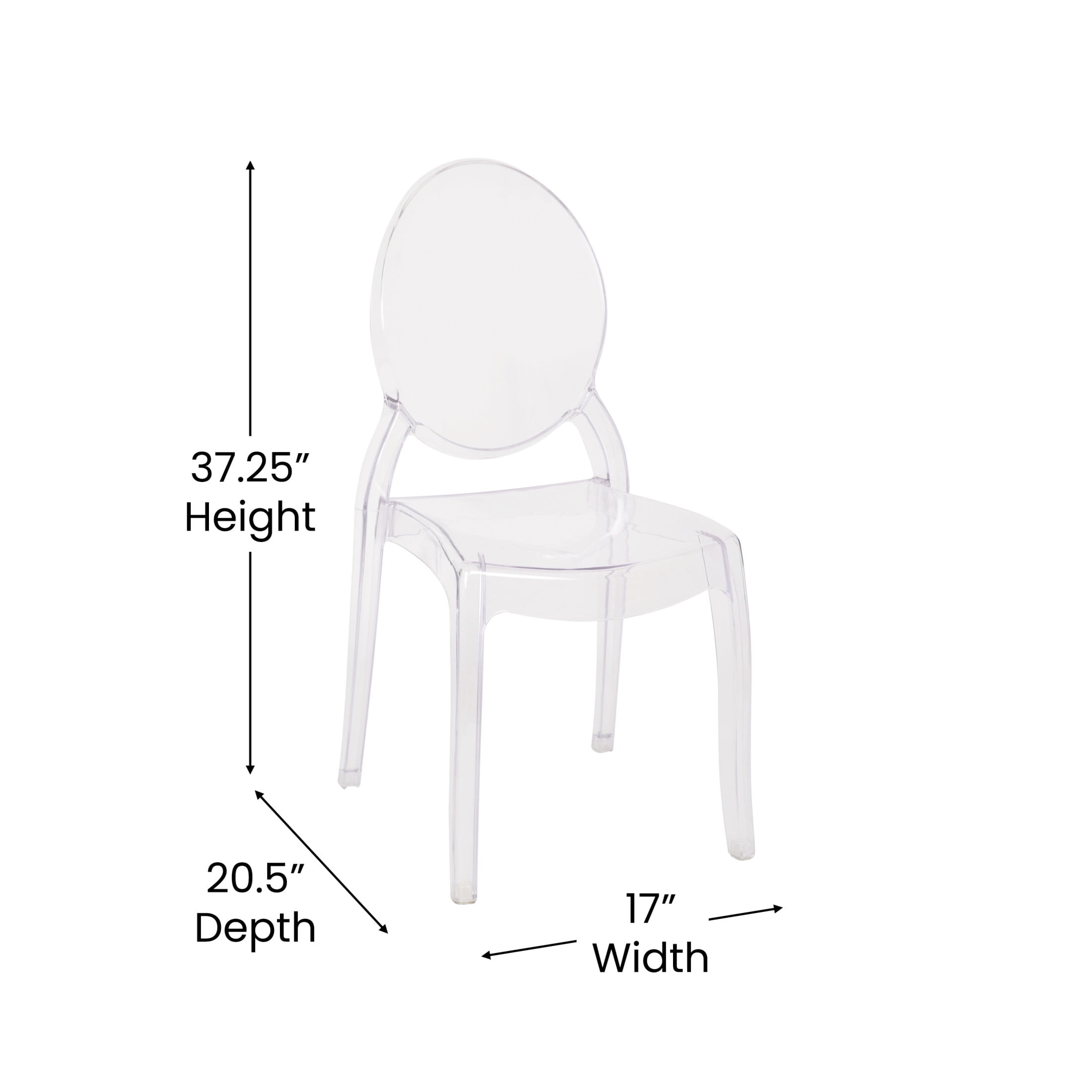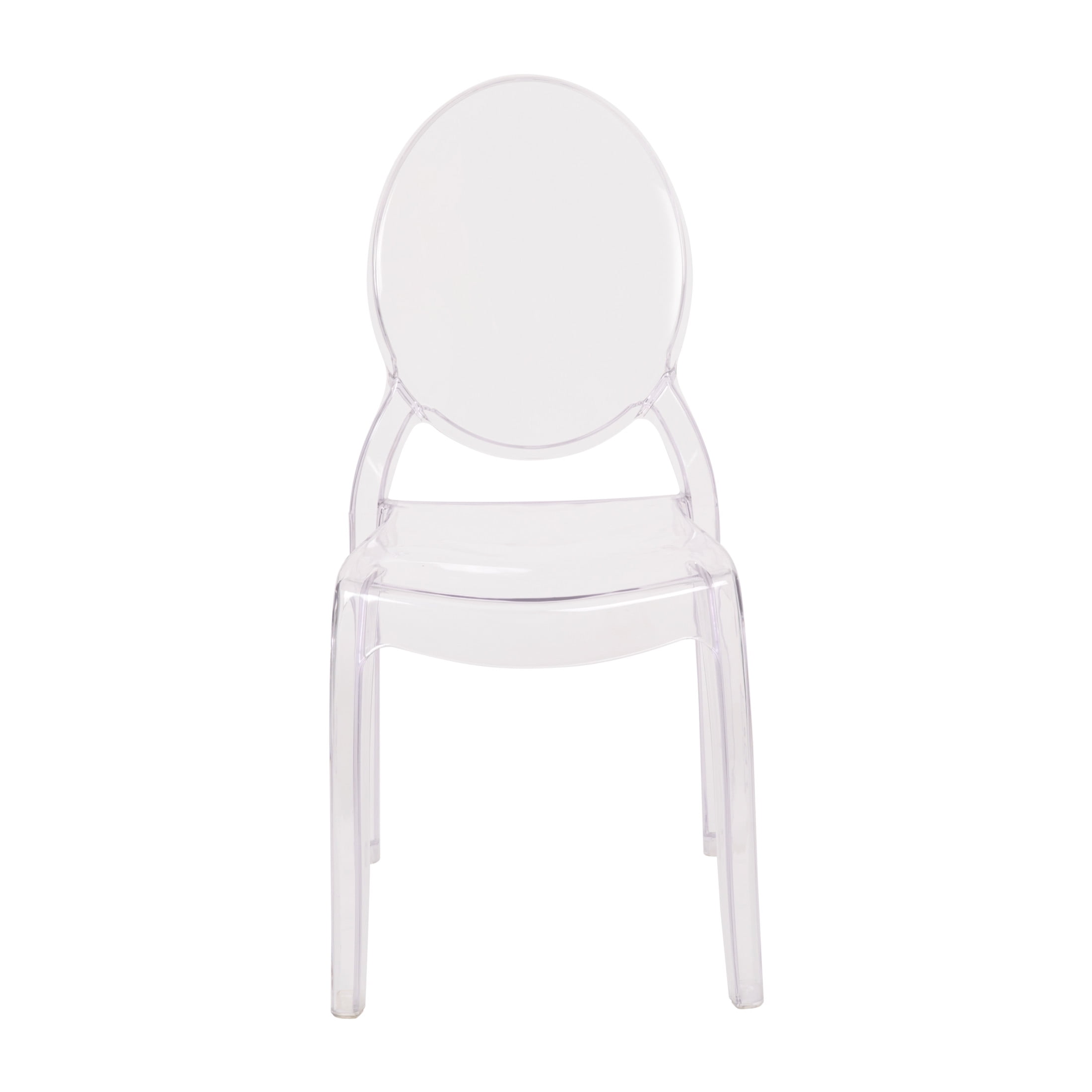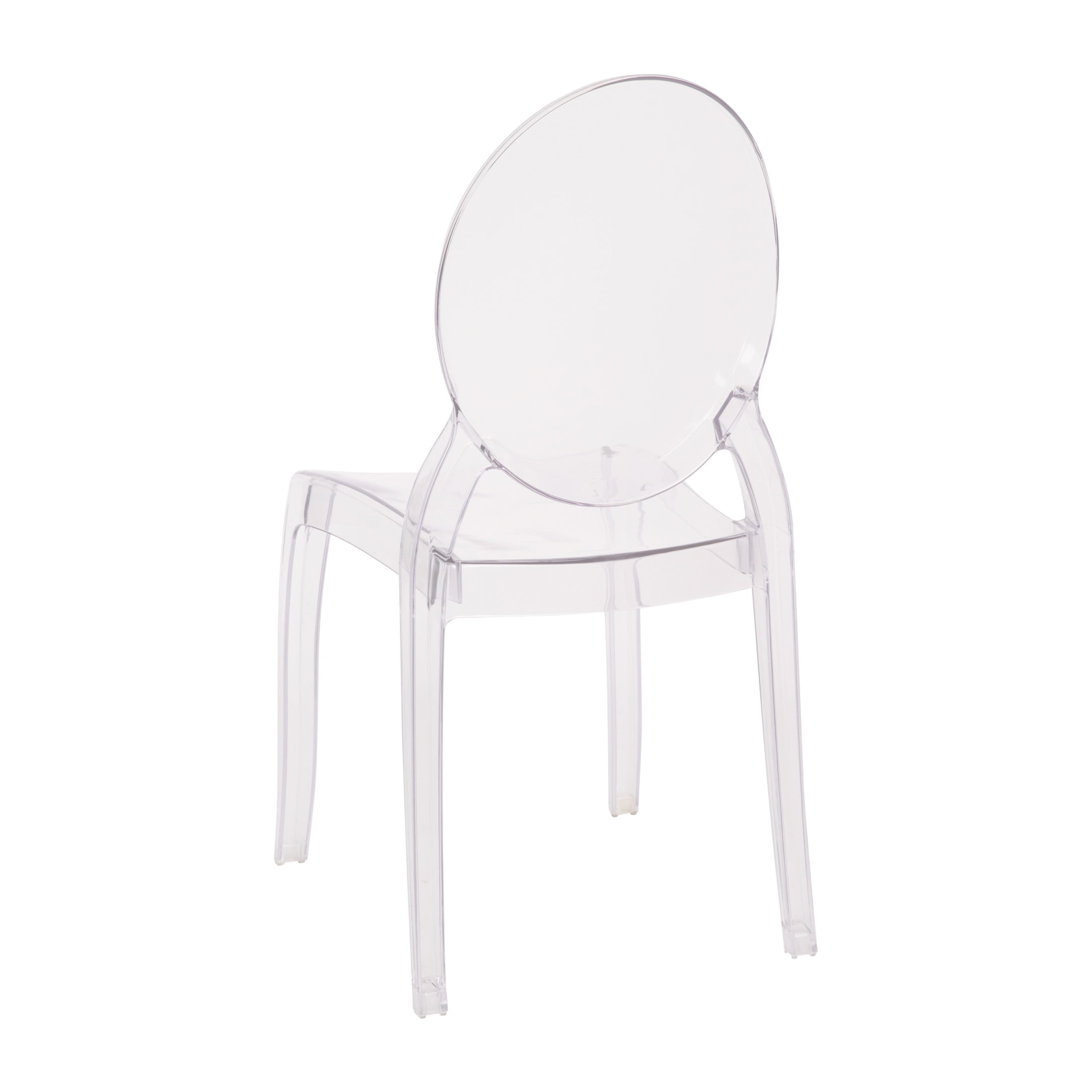 Flash Furniture Revna Series Ghost Chair, Set of 4, Clear Plastic Set of 4 Crystal Clear Resin All Occasion Armless Ghost Chairs with Extra Wide Seats Polycarbonate Molded Structure is shock, scratch and water resistant Designed for Commercial Use but suitable for home use Seat Size: 16.375″W x 18″D x 19″H Accommodates up to 400 LBS. Static Weight Capacity Stackable up to 4 High for storage, transport, or floor cleaning Soft Fixed Plastic Floor Glides protect hard indoor flooring surfaces Suitable for Indoor and Outdoor Use No Assembly Required for instant use Multipurpose stack chair for banquet venues, dining rooms, or salons PRODUCT MEASUREMENTS: Overall Size: 17″W x 20.5″D x 37.25″H; Seat Size: 16.375″W x 18″D x 19″H; Back Size: 14.75″W x 20″H; No Assembly Required