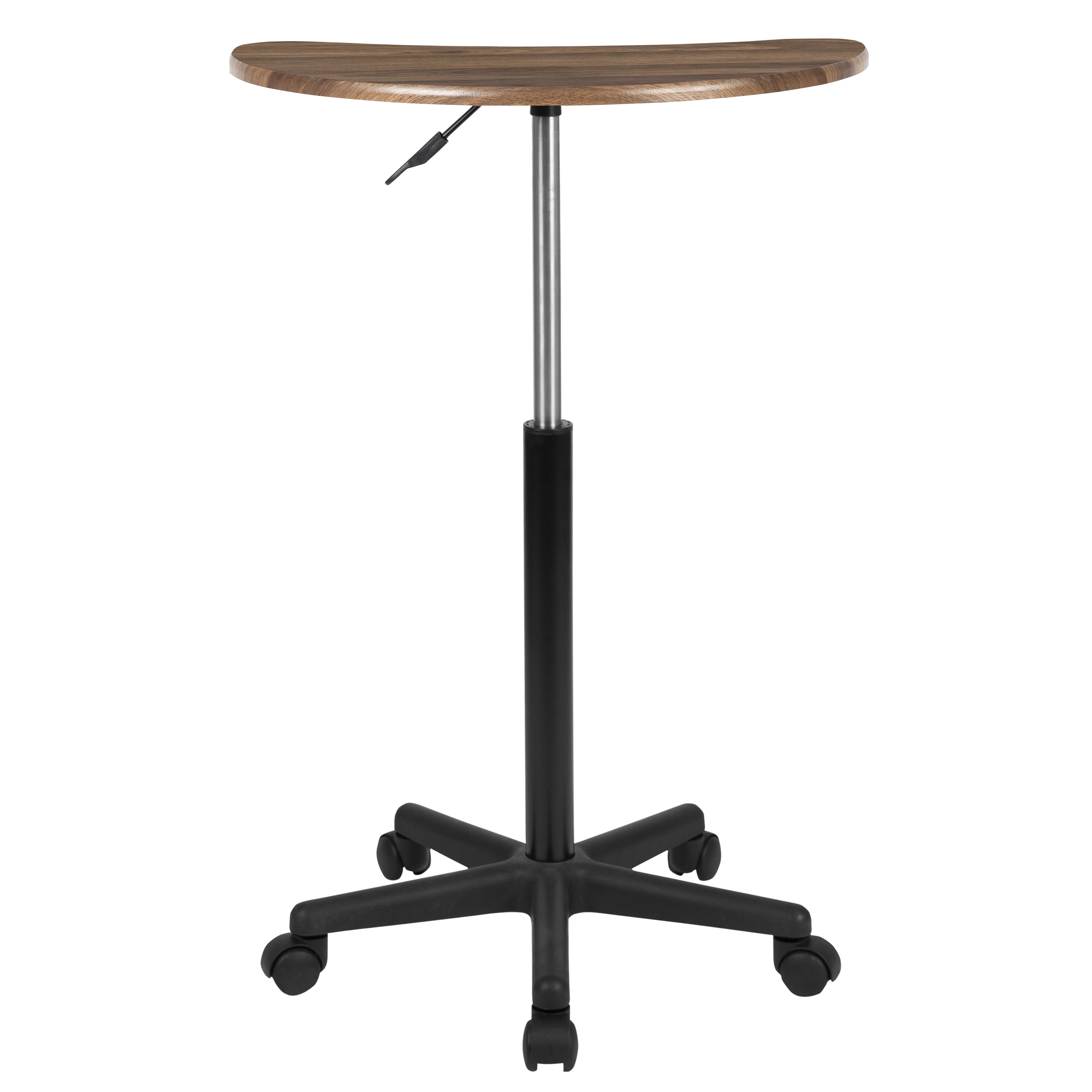 Contemporary Laptop Table or Speakers Lectern Portable Design allows you to move from room to room Rustic Walnut Laminate Finish blends with any décor Distinctive Half Moon shaped work surface with cutout Top Size: 25.25″W x 13″D; .75″ Thick Top Pneumatic Frame Height Adjustment goes from sitting to standing Height Adjustment Lever located beneath table top Heavy Duty Nylon Base offers a sturdy work surface Dual Wheel Casters for effortless mobility Mobile work table ideal for use in the home or for those who travel for work