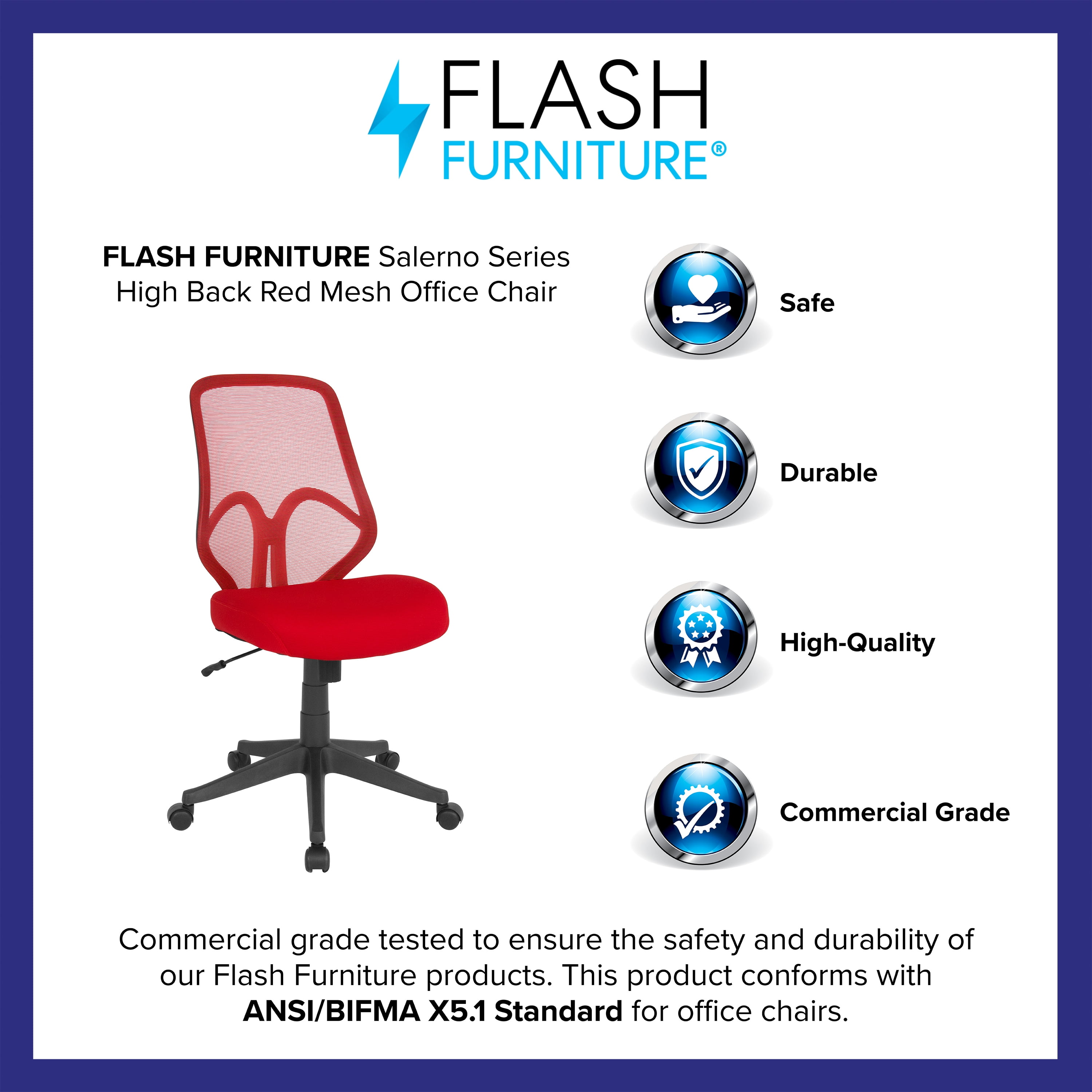 Flash Furniture Salerno Series High Back Red Mesh Office Chair Contemporary Office Chair High Back Design with flexible and breathable mesh material Built-In Lumbar Support Tilt Lock Mechanism rocks/tilts the chair and locks in an upright position Tilt Tension Adjustment Knob adjusts the chair’s backward tilt resistance Padded Red Mesh Upholstered Seat with CAL 117 Fire Retardant Foam Waterfall Seat reduces pressure on your legs Pneumatic Seat Height Adjustment with 360 Degree Swivel Seat 5-Star Nylon Base with Dual-Wheel Casters PRODUCT MEASUREMENTS: Overall Size: 26.5″W x 26.5″D x 37-41″H; Seat Size: 19.75″W x 19.75″D x 17-21″H; Back Size: 19″W x 21.5″H