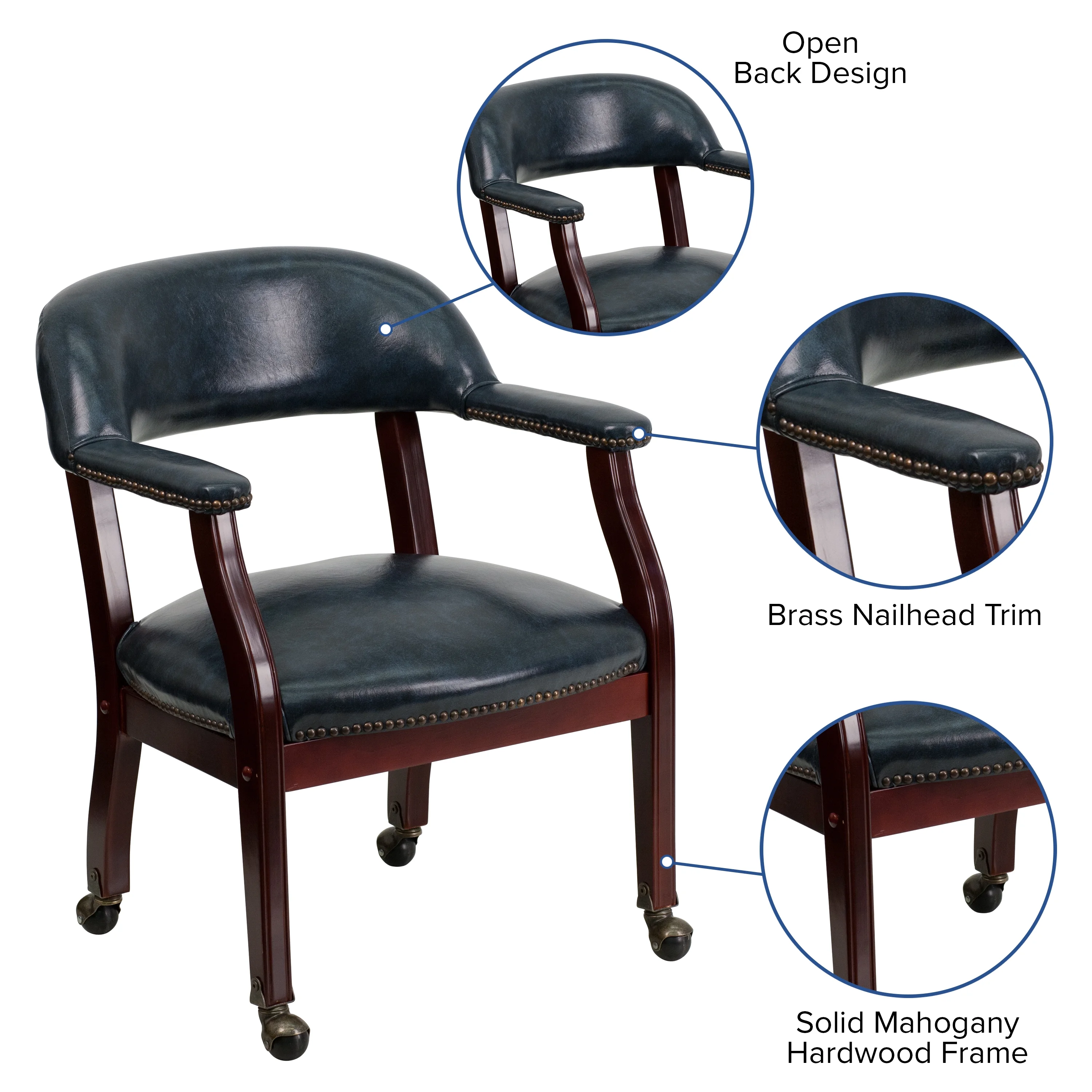 Add timeless charm to your space with this elegant reception/conference chair. This chair features navy vinyl upholstery, contoured cushions and an open back design. Designed with upholstered straight arms and attractive brass nail accents, this chair adds a distinctive touch to any setting. The carpet casters make the chair easy to move while sitting for meetings and conferences. For long-lasting performance, this conference chair is built with a sturdy hardwood frame with brass hooded ball casters. This chair will complement reception areas, libraries or your office as a guest chair.