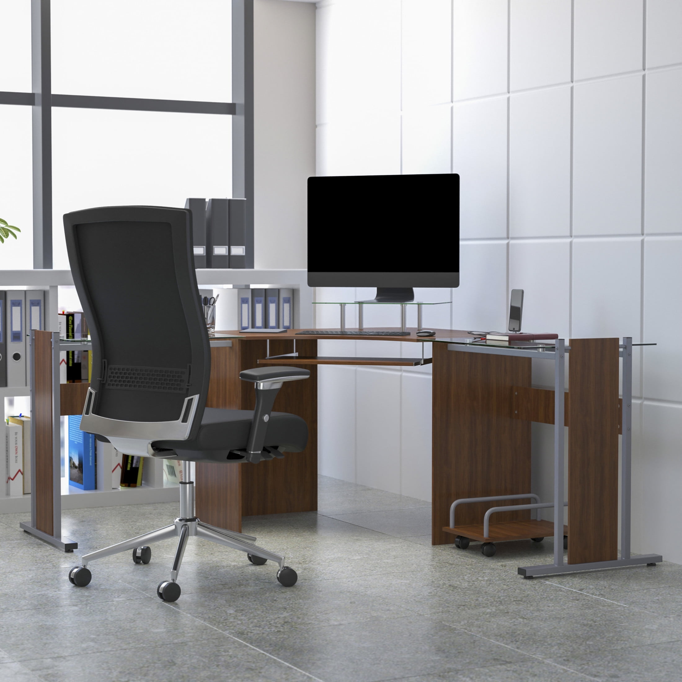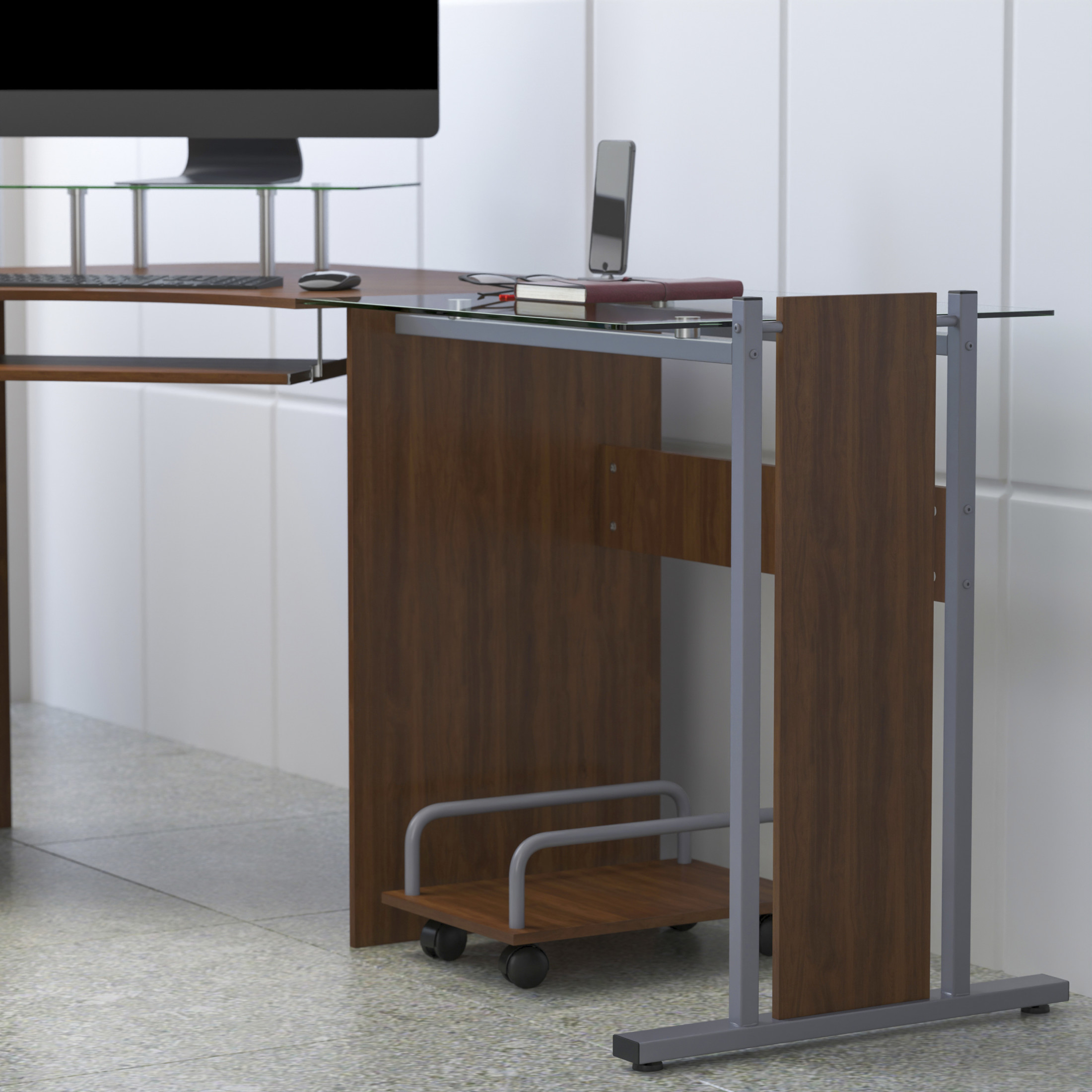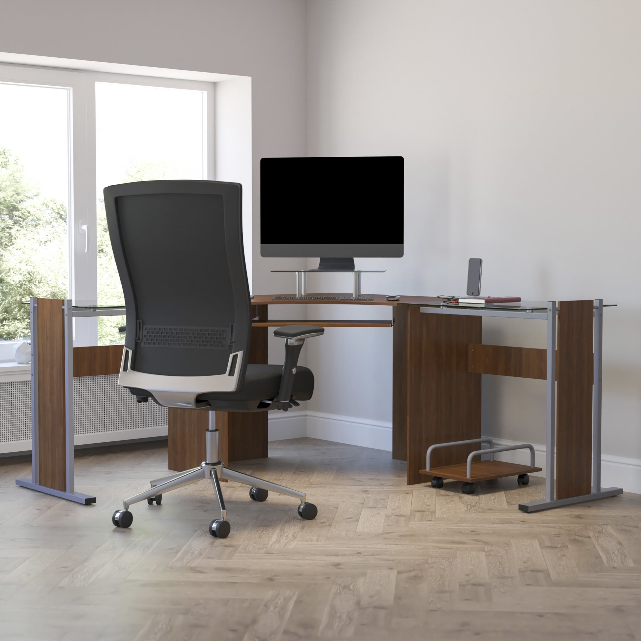 Flash Furniture Singleton Teakwood Laminate Corner Desk with Pull-Out Keyboard Tray and CPU Cart Contemporary Style Computer Desk Teakwood Laminate Surface with Glass Sides .5″ Thick Laminate and 6Mm Tempered Glass Glass Monitor Platform: 19.75″W X 12.5″D X 4.5″H From Surface Sliding Keyboard Tray: 23.5″W X 11.25″D X 26″H From Floor Silver Powder Coated Frame Finish Floor Glides Components: Overall Diagonal Width: 95″; Desks (2): 27.5″W X 21.75″D X 29.5″H; Corner Connector: 57″W X 42″D; Mobile CPU Cart: 11.25″W X 16.5″D X 7″H; Weight Capacity: 44 Lbs. PRODUCT MEASUREMENTS: Overall Size: 81.5″W x 55″D x 29.75″H; File Drawer Size (1): 12.5″W x 15″D x 12″H; Pedestal Size: 15.75″W x 19.5″D x 27″H; Box Drawer Size (2): 12.5″W x 15″D x 3.5″H