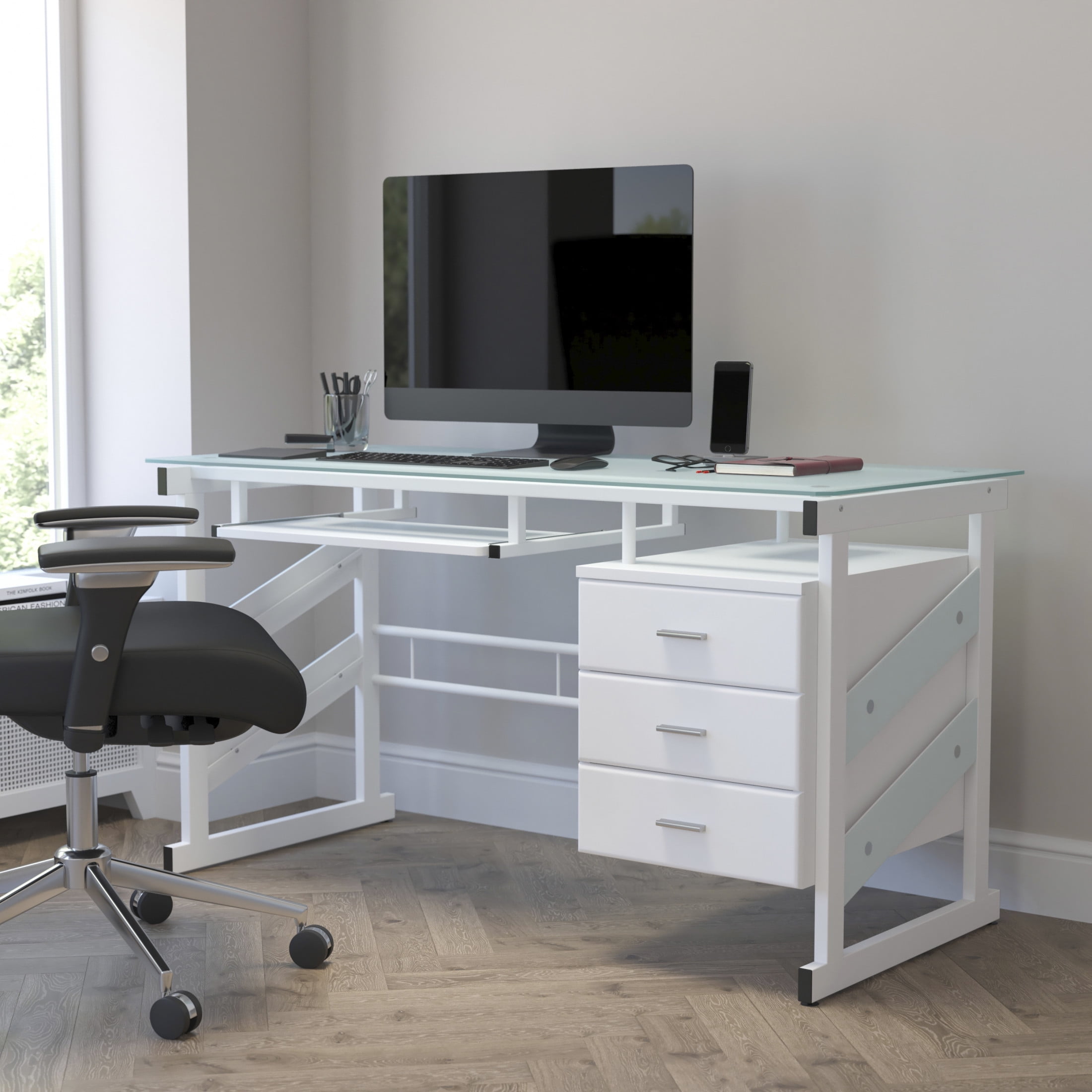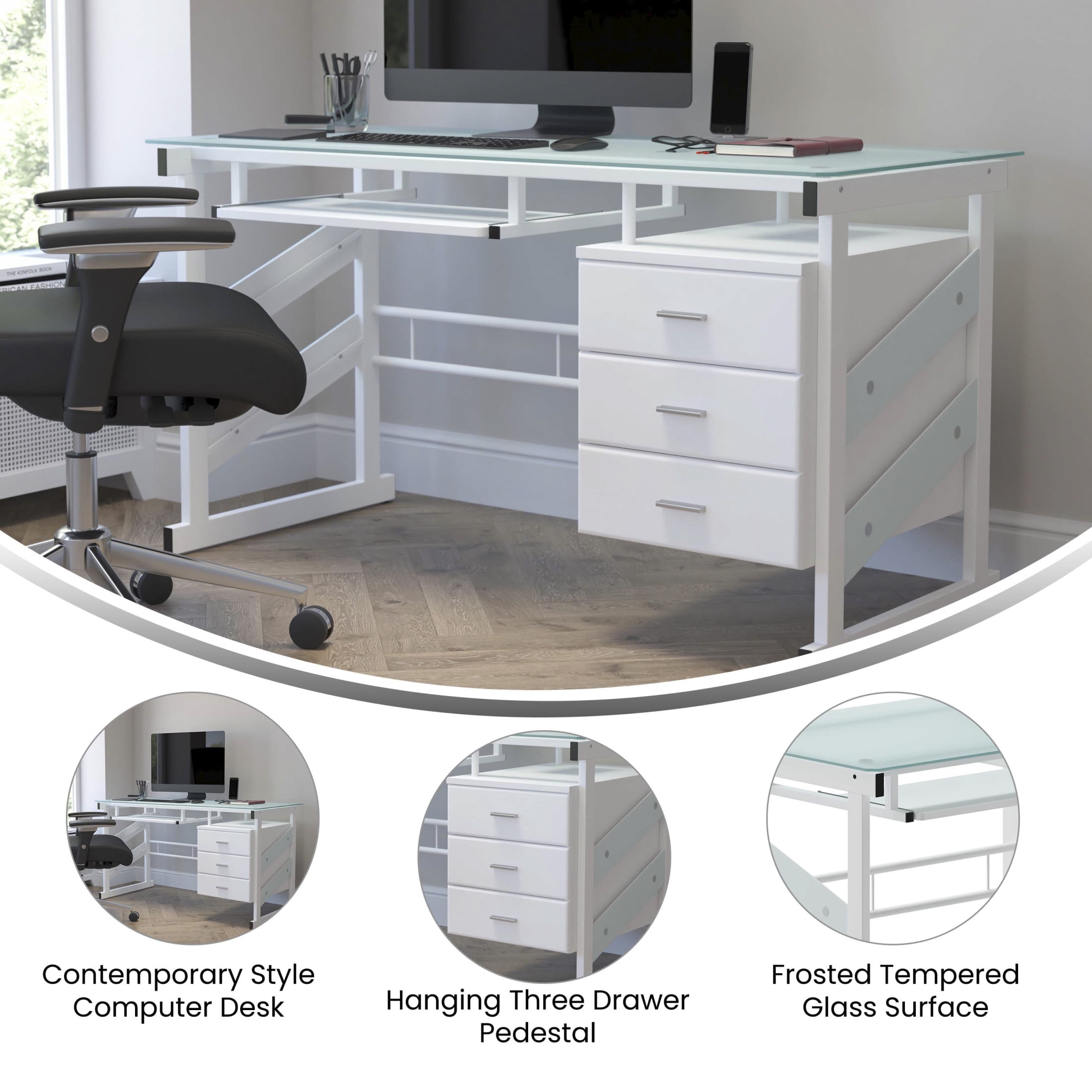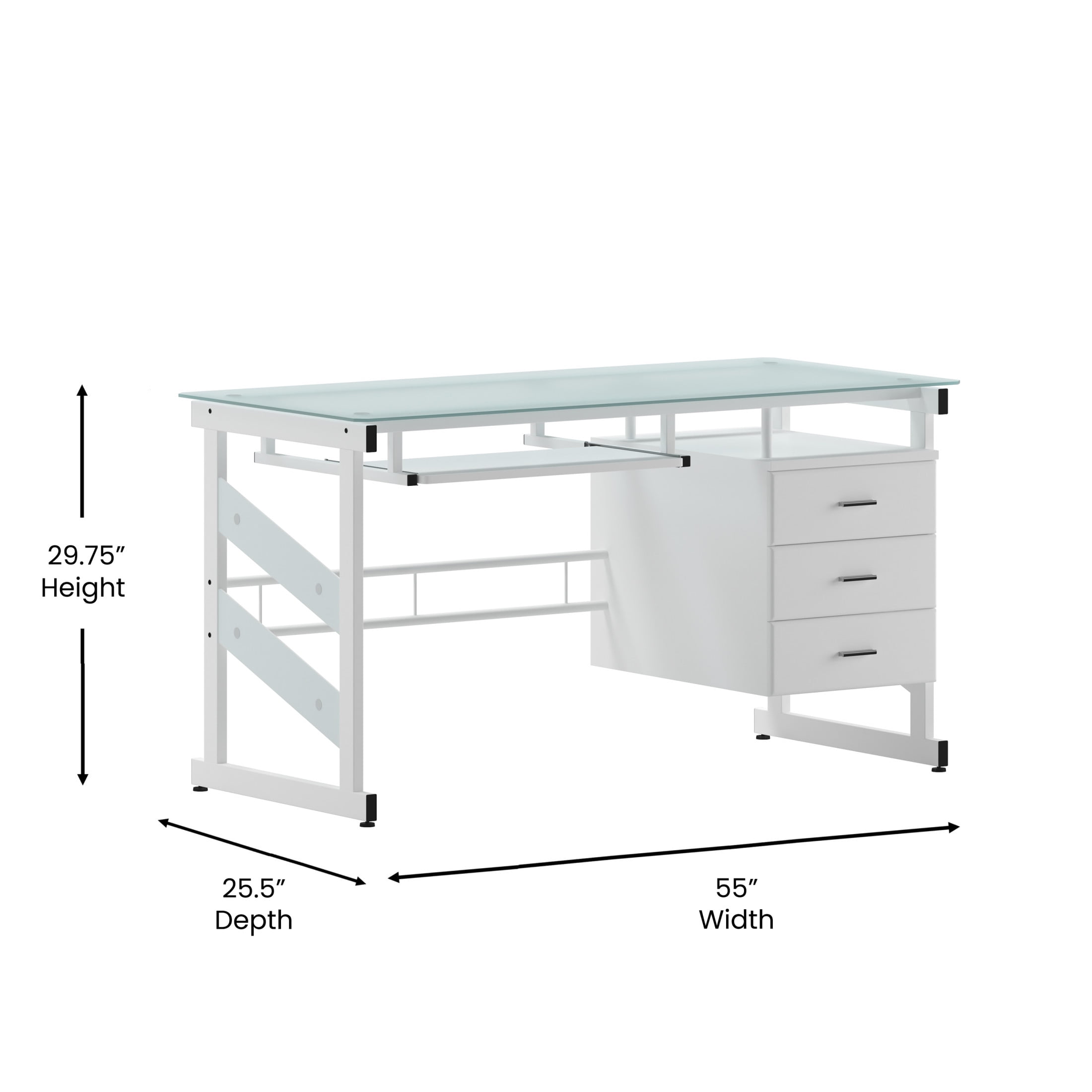 Flash Furniture Singleton White Computer Desk with Frosted Glass Top and Three Drawer Pedestal Contemporary Style Computer Desk Frosted Tempered Glass Surface, Decorative Frosted Side Panels 8mm Thick Glass Spacious Rectangular Desktop Sliding Keyboard Tray: 23.25″W X 11.5″D X 25.25″H From Floor Hanging Three Drawer Pedestal Pedestal Size: 15.75″W X 23.5″D X 24.5″H Box Drawer Size (3): 12.5″W X 13″D X 4.25″H Silver Bar Pulls White Powder Coated Frame Finish with Floor Glides PRODUCT MEASUREMENTS: Overall Size: 55″W x 25.5-33″D x 29.75″H; Pedestal Size: 15.75″W x 23.5″D x 24.5″H; Box Drawer Size (3): 12.5″W x 13″D x 4.25″H; Sliding Keyboard Tray: 23.25″W x 11.5″D x 25.25″H from floor